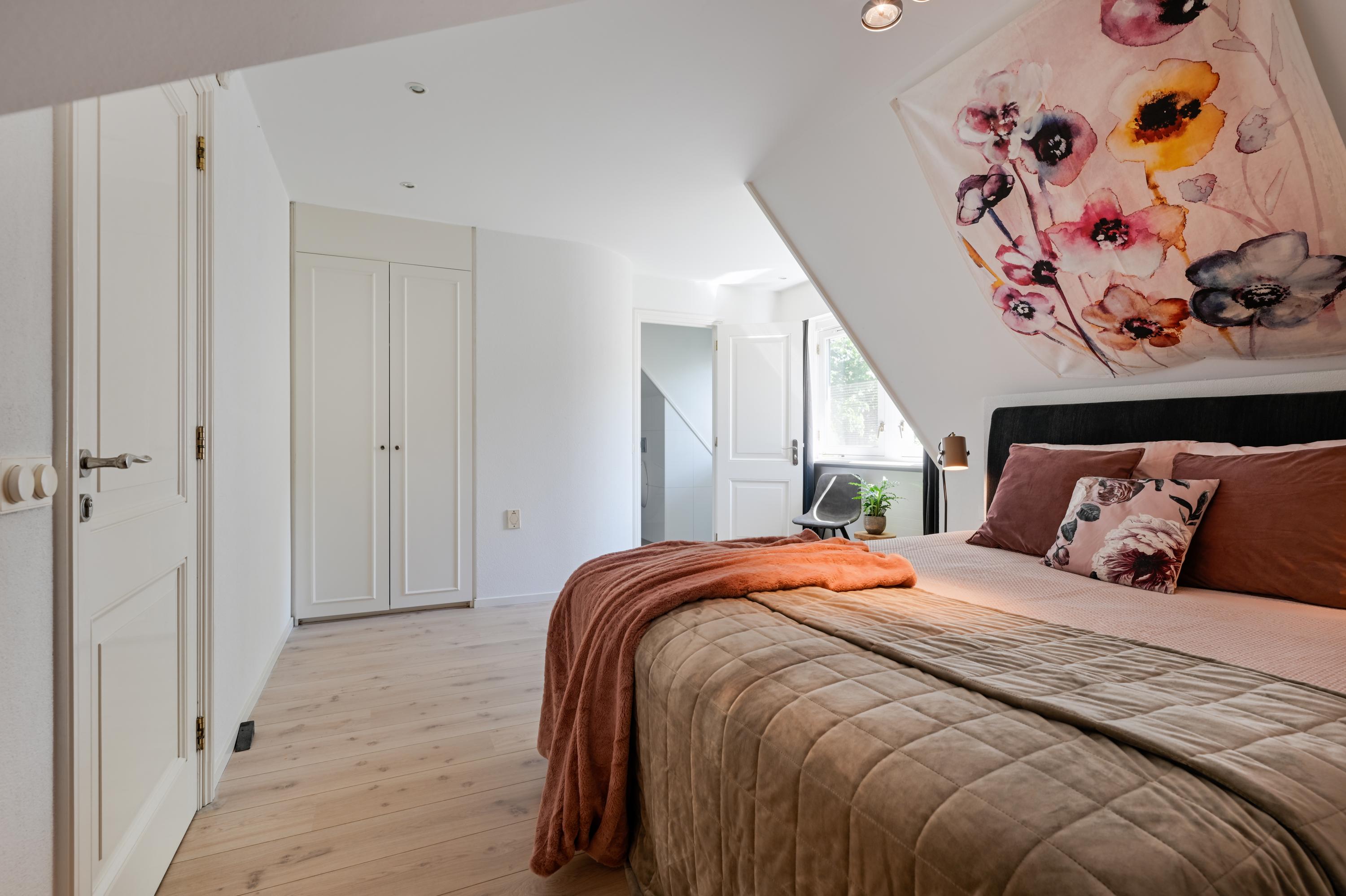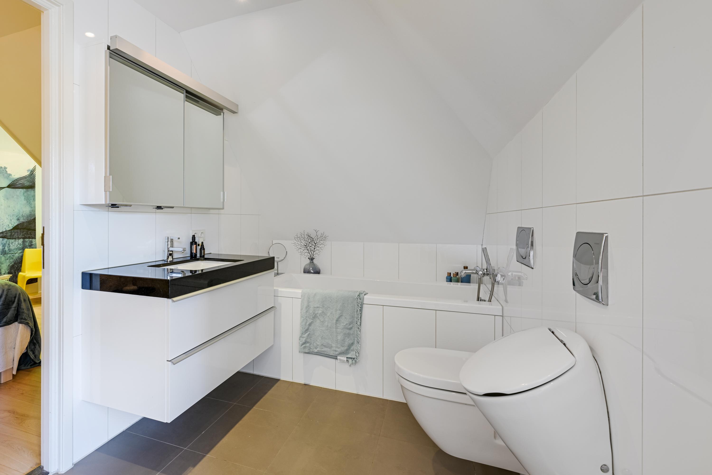 Hallway with staircase and lift, study with round bay window offering beautiful views, spacious bedroom with access to balcony, second large (master) bedroom with sheltered balcony offering beautiful views of the garden, hallway leading to dressing room and en-suite bathroom with bath, shower, double washbasin, urinal and toilet, underfloor heating. Third and fourth bedroom, both with dormer windows and both with access to a bathroom with bath, shower, toilet, urinal, washbasin and underfloor heating.