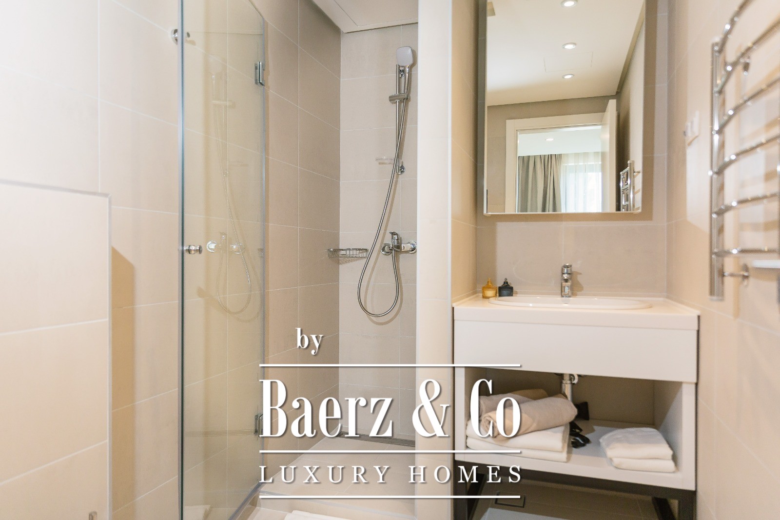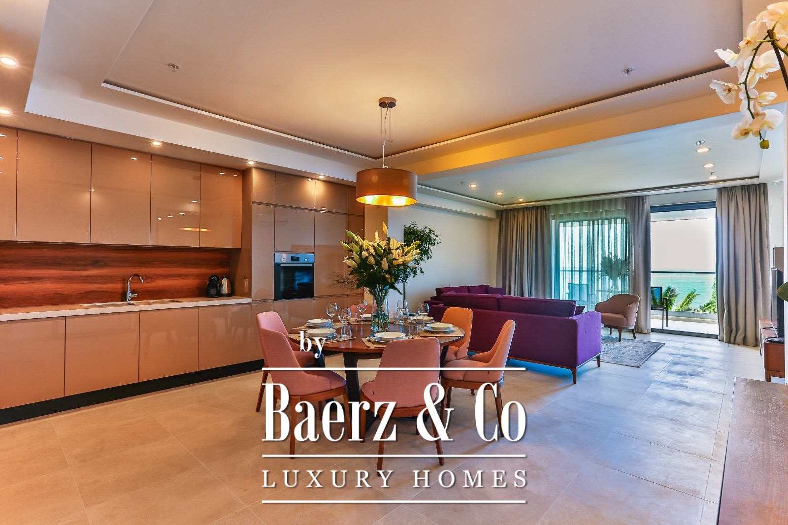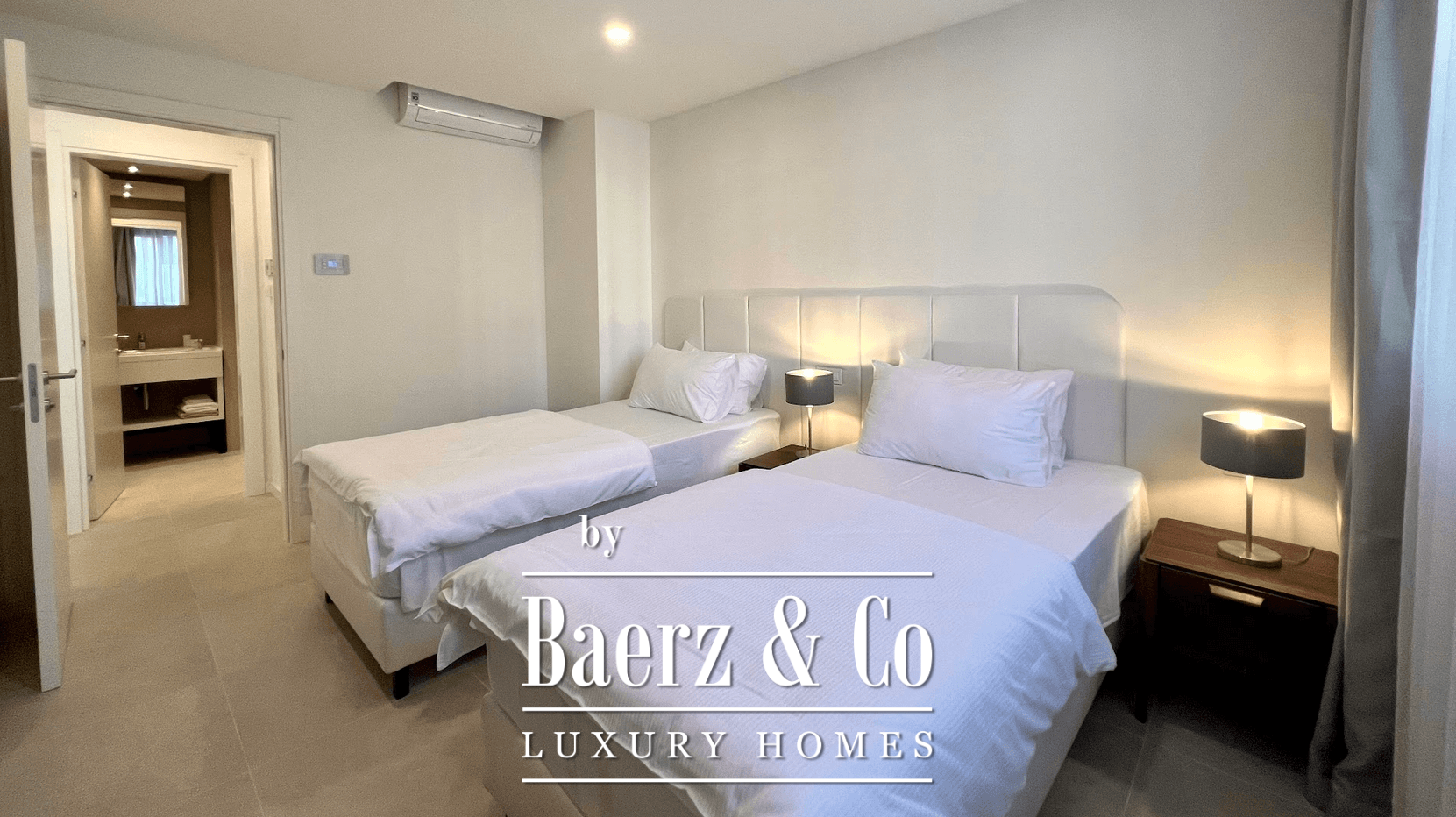 Situé au cinquième étage d’une élégante résidence de 12 étages, ce logement de 107 m² a été conçu pour allier confort et art de vivre contemporain. Il comprend deux chambres, deux salles de bains, un hall d’entrée et une pièce à vivre ouverte avec cuisine et coin repas. De larges baies vitrées s’ouvrent sur une terrasse spacieuse, offrant une vue panoramique sur la mer et cultivant une sensation de sérénité et de continuité entre intérieur et rivage.
