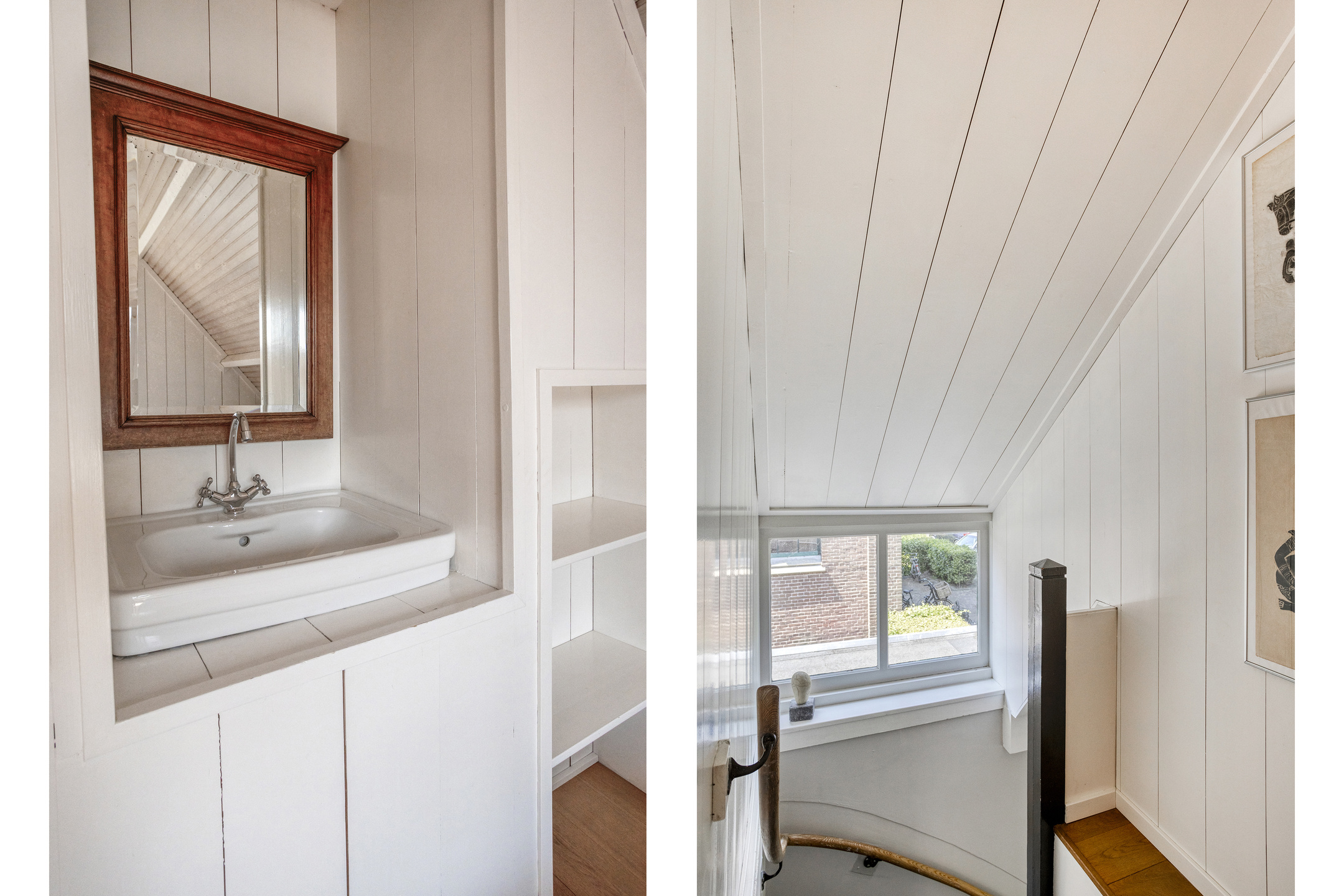 The first floor is divided between the front and rear sections of the house. In the front, you’ll find two spacious bedrooms, each with storage behind the knee walls. In the rear, a wide staircase leads to a charming landing with a built-in box bed—a unique feature sure to appeal to children. From here, you access the spacious master bedroom, which includes built-in wardrobes, a storage loft, and French doors opening onto a large rooftop terrace with panoramic views of the surrounding landscape.