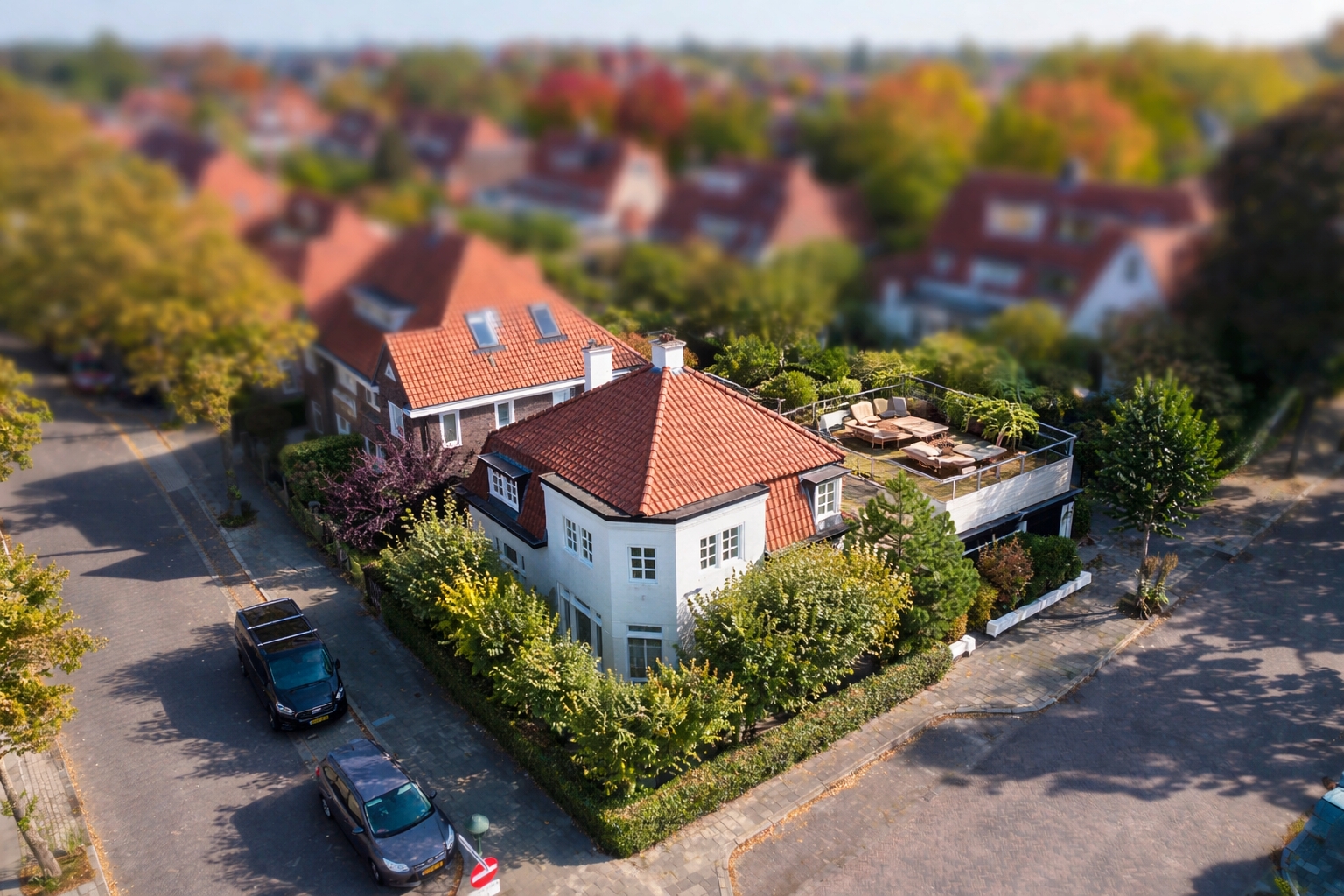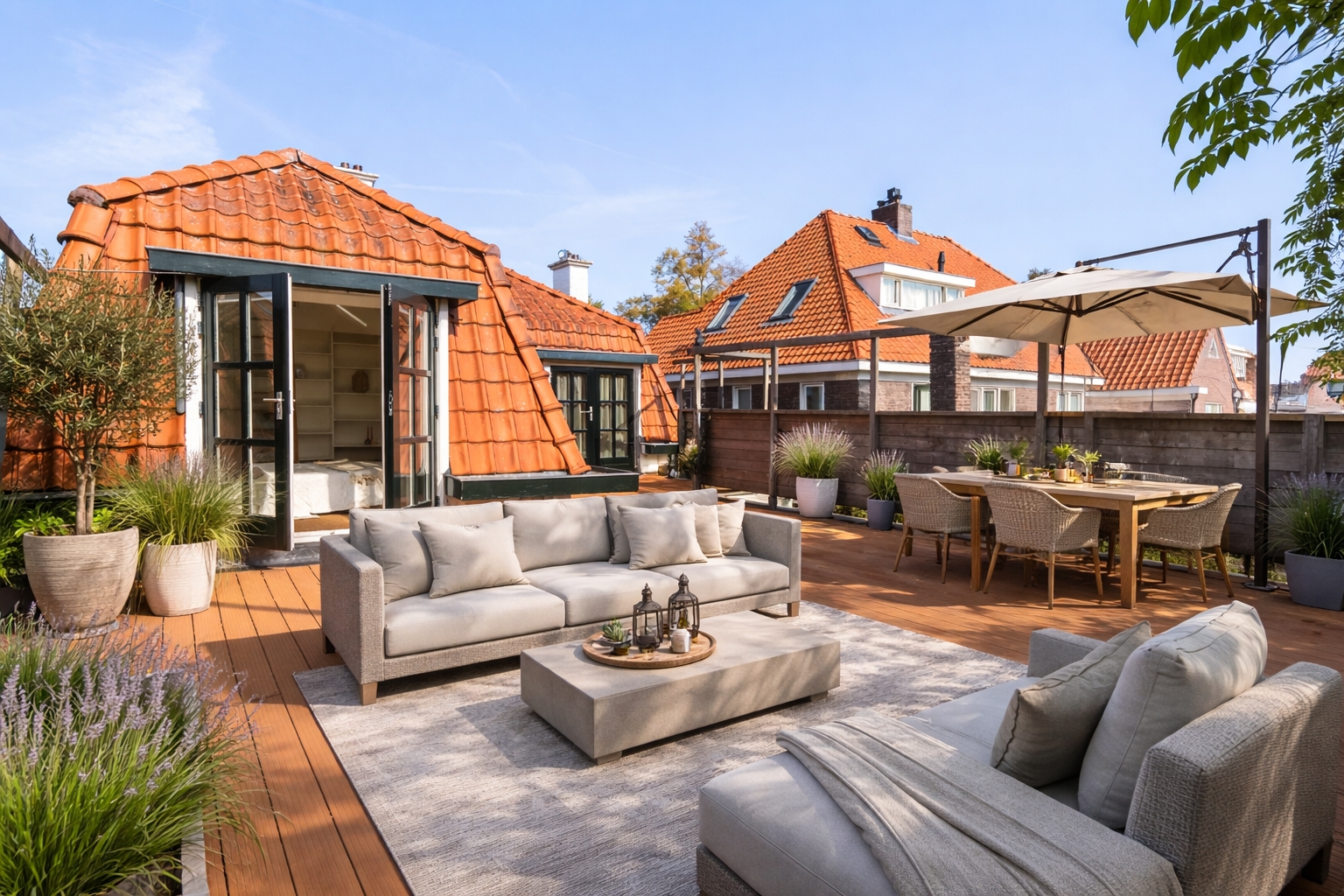 Avec sa façade blanche, ses tuiles rouges et ses généreux avant-toits, la villa affiche une prestance à la fois robuste et discrètement romantique. La vie extérieure s’organise autour de terrasses orientées sud-ouest et est, d’une véranda et d’une terrasse sur le toit de 55 m² accessible depuis plusieurs chambres. Chaque détail préserve l’intimité, renforcée par des terrasses composites et une clôture intégrale, offrant un jardin de ville paisible propice à la relaxation comme aux réceptions.
