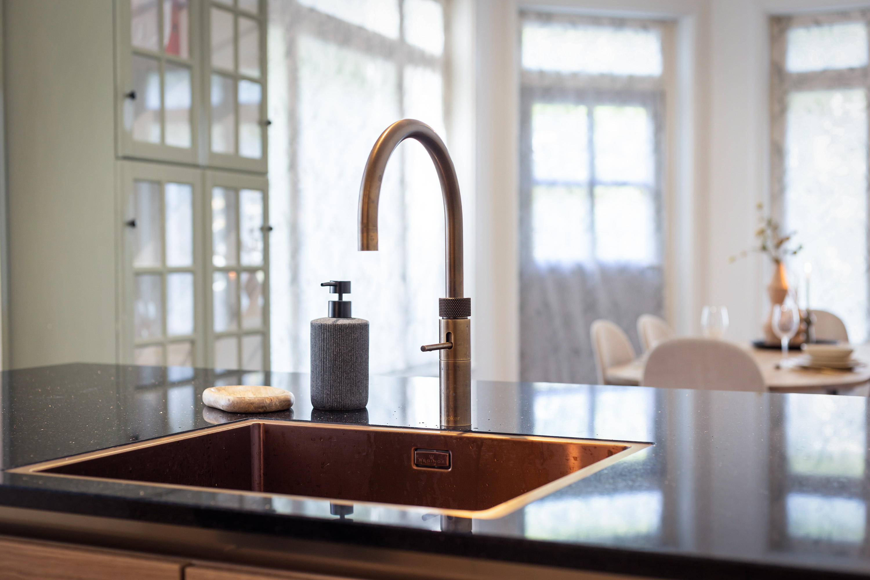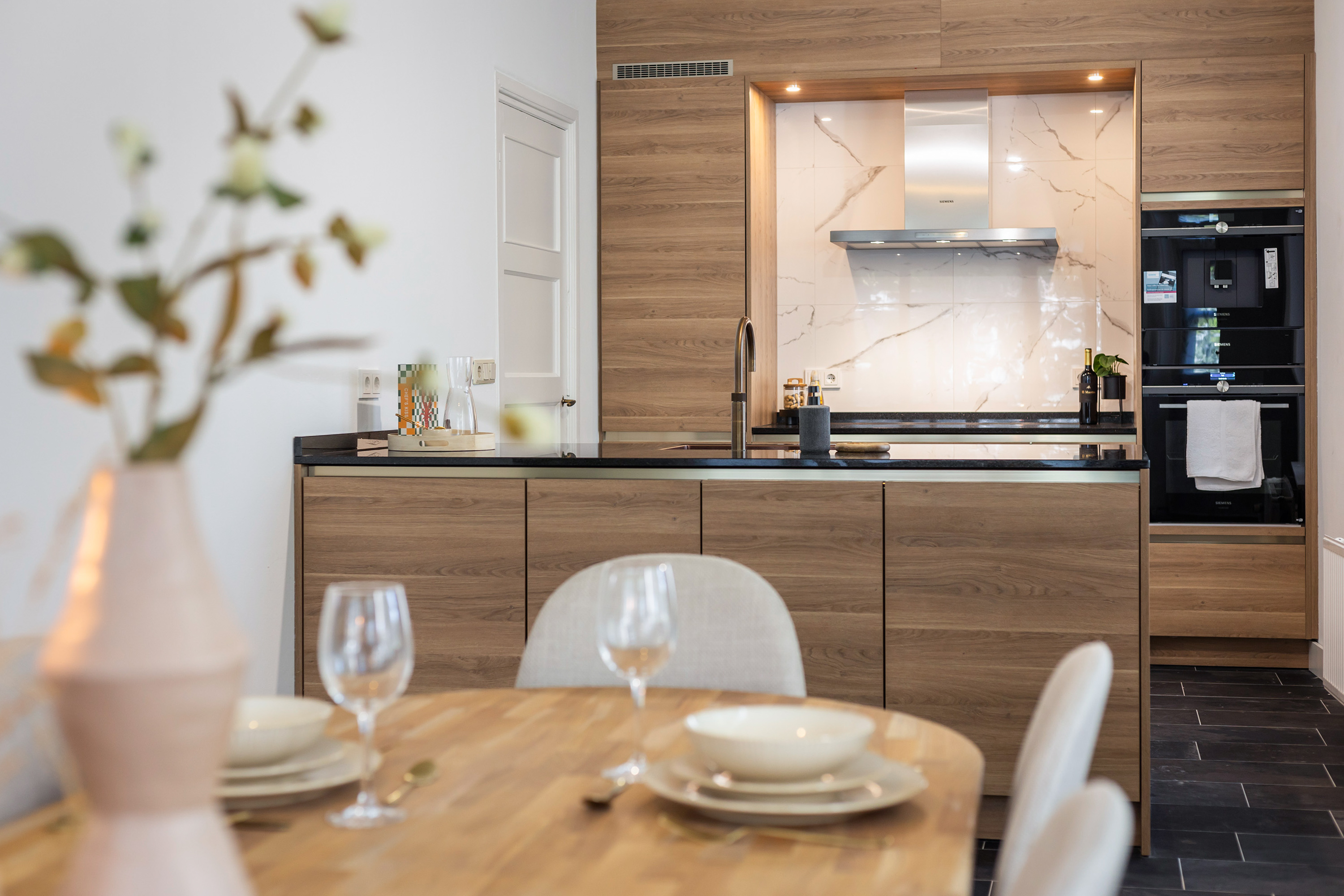 Dès l’entrée par les doubles portes, lumière et chaleur s’invitent dans le vaste hall et les pièces de réception. La cuisine Siematic se distingue par ses rangements en chêne, son plan de travail en granit noir et ses équipements Siemens, offrant un lieu propice aux échanges et à la gastronomie. Le parquet en chêne de style Art déco, associé à des murs aux teintes douces, s’harmonise avec les plafonds d’origine et les boiseries authentiques.