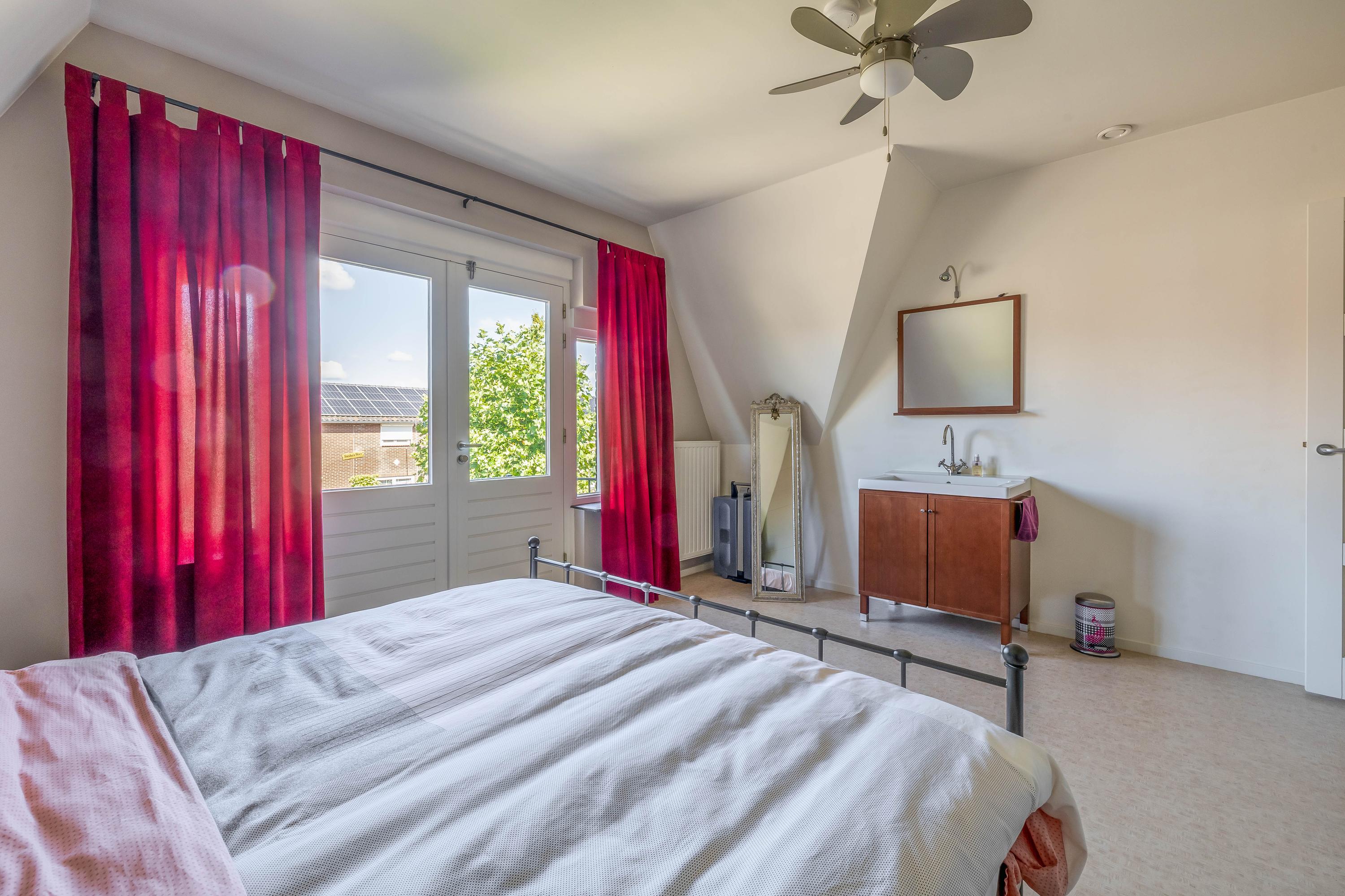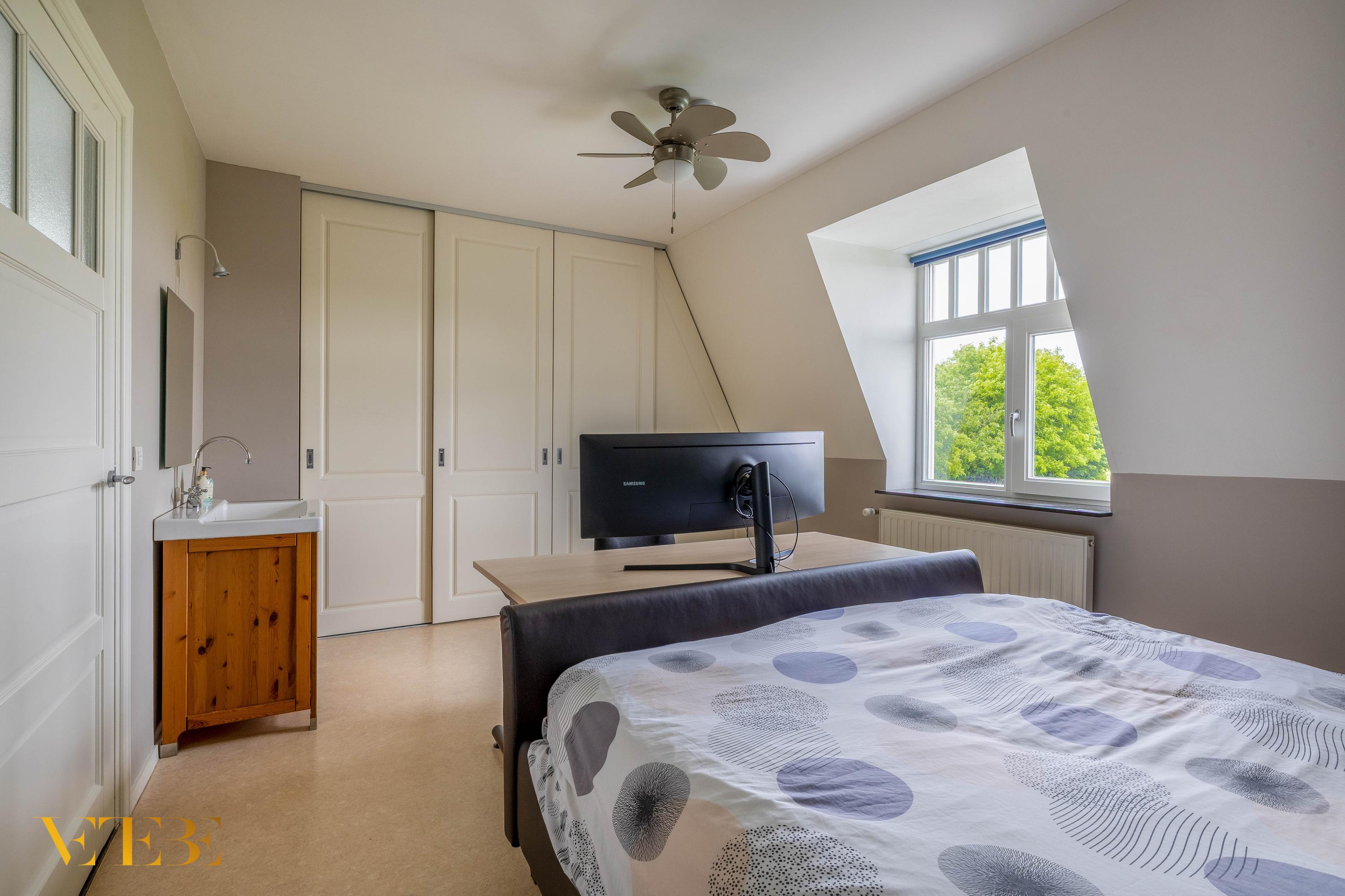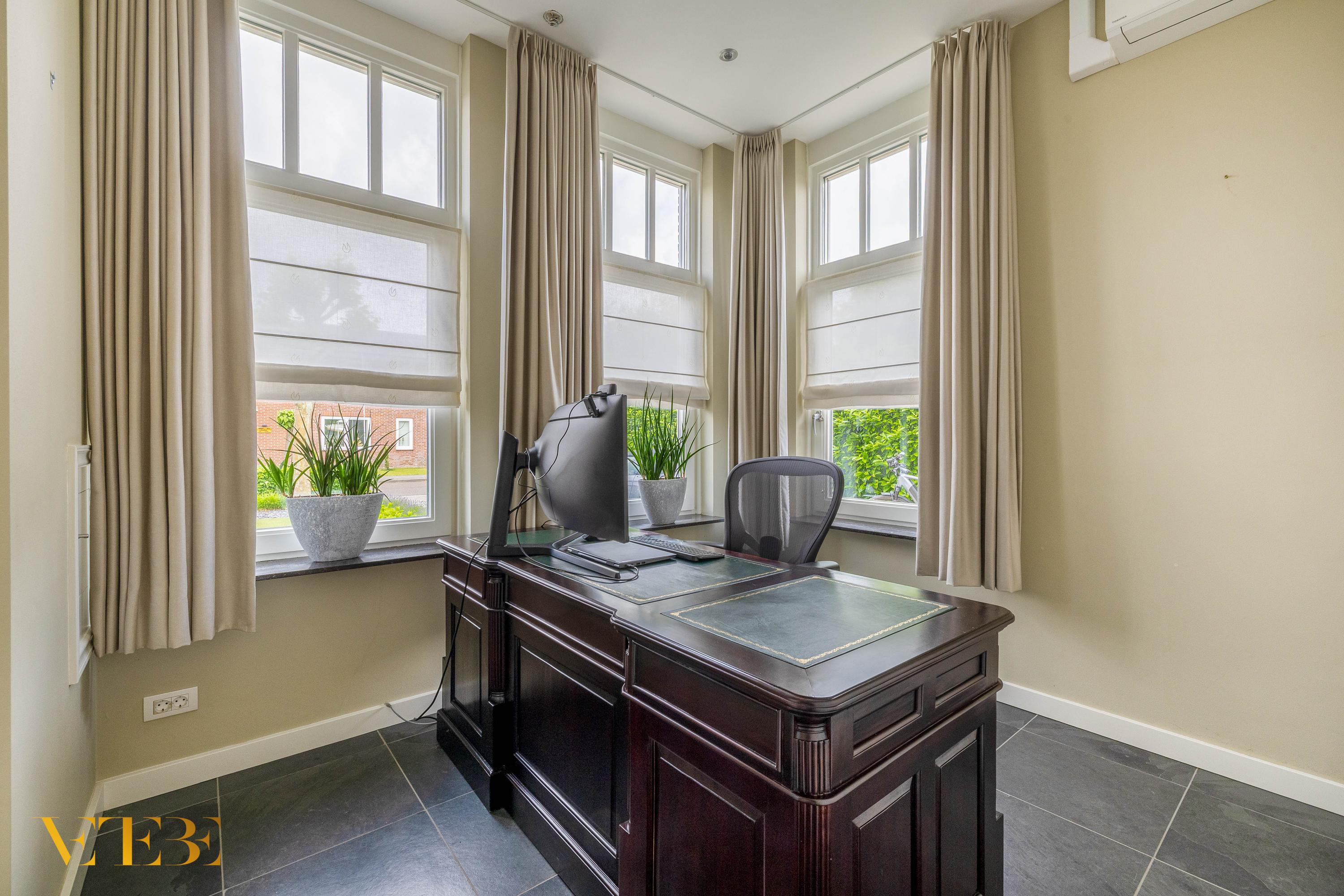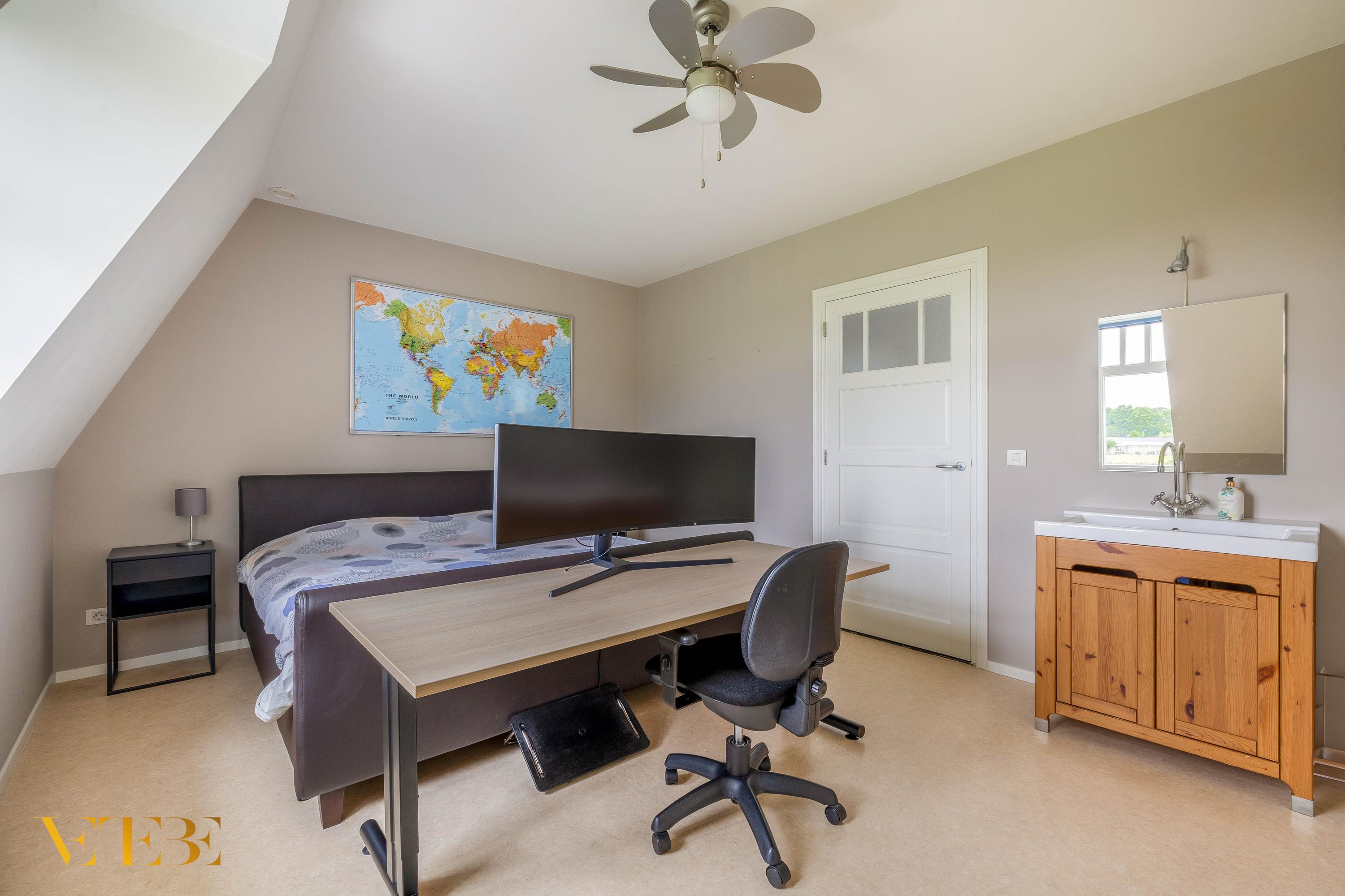 À l’intérieur, la villa comprend trois chambres et une salle de bains, ainsi qu’un lumineux salon en suite. Le rez-de-chaussée est doté du chauffage au sol, hors garage, et d’une cuisine ouverte équipée d’une plaque céramique et d’appareils électroménagers de qualité, avec un accès au jardin par portes-fenêtres. Ce niveau dispose aussi d’un bureau d’environ 10,5 m², d’une buanderie et d’un vaste garage intégré de 35 m², alliant praticité et générosité. L’automatisation de la maison accroît le confort et l’efficacité, complétée par 24 panneaux solaires, la climatisation dans certaines pièces et un vitrage HR++.