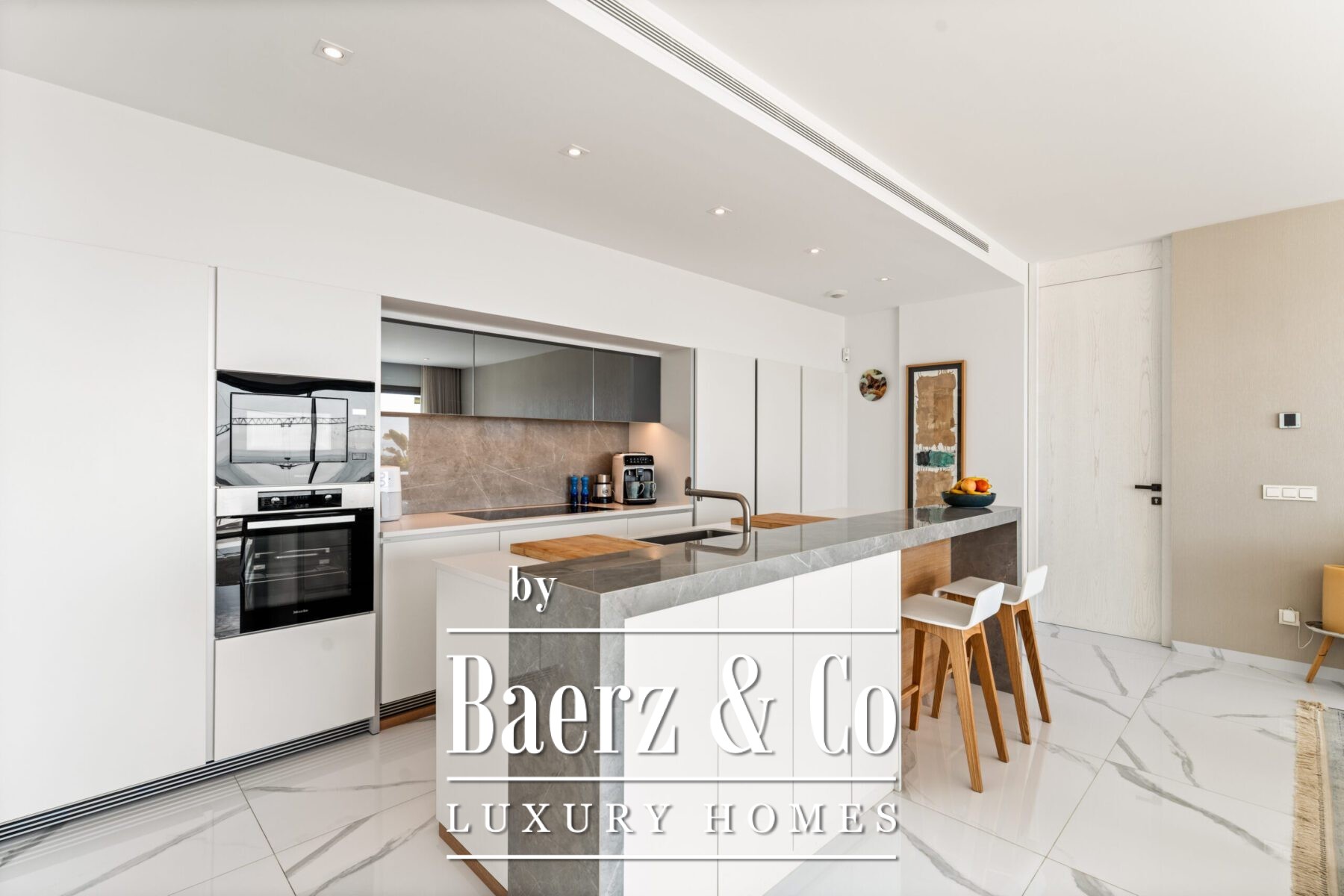 À l’intérieur, les pièces de vie à aire ouverte, la salle à manger et la cuisine affichent des tonalités scandinaves contemporaines et une sophistication fonctionnelle. Portes toute hauteur, électroménagers Miele, plans de travail en pierre, volets roulants électriques, chauffage au sol et toilettes invités veillent au bien-être dans une atmosphère harmonieuse. Deux places de parking en sous-sol et un espace de stockage agrémentent ce confort raffiné.