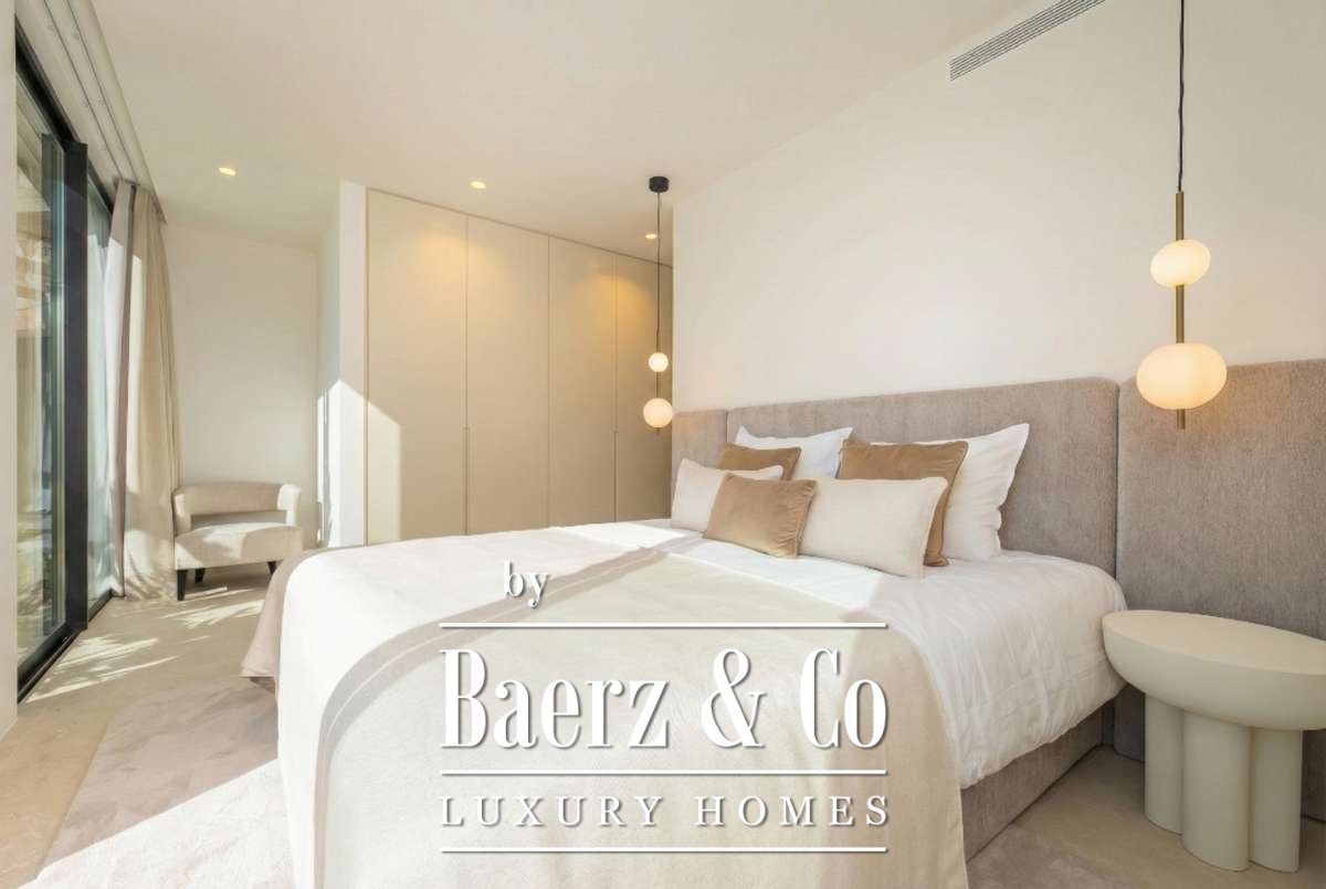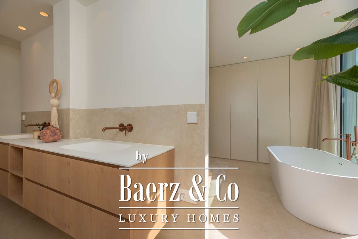 À l'intérieur, la villa s'étend sur 410 m². Le premier étage vous accueille avec un hall de 26 m² menant à trois chambres, chacune disposant de salles de bains raffinées. La suite parentale occupe 30 m² et offre une baignoire indépendante ainsi que deux vasques, conçues pour l'intimité et la quiétude. L'espace de vie, d'une superficie de 50 m², s'ouvre harmonieusement sur une cuisine de 40 m², unifiées par une élégante cheminée traversante et une vue sur la piscine et les jardins paysagers. Une mezzanine de 5 m² insuffle de la légèreté à cet espace central, tandis que la véranda attenante relie le raffinement intérieur à la sérénité extérieure.