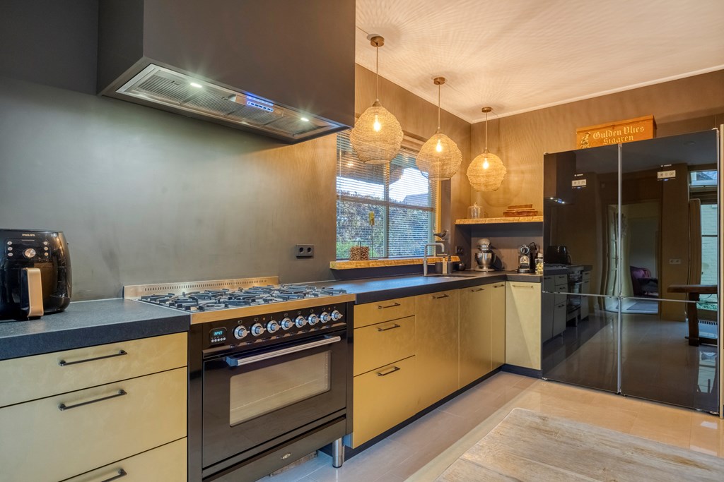 La cuisine conjugue esthétisme et fonctionnalité avec des façades dorées, des appareils haut de gamme, un robinet Quooker pour eau chaude et pétillante, et une vue sur le jardin. La praticité se prolonge dans la buanderie attenante, tandis qu’une grande chambre de plain-pied, bénéficiant d’un dressing et d’une salle de bains privative, préserve l’intimité avec son accès direct au jardin.