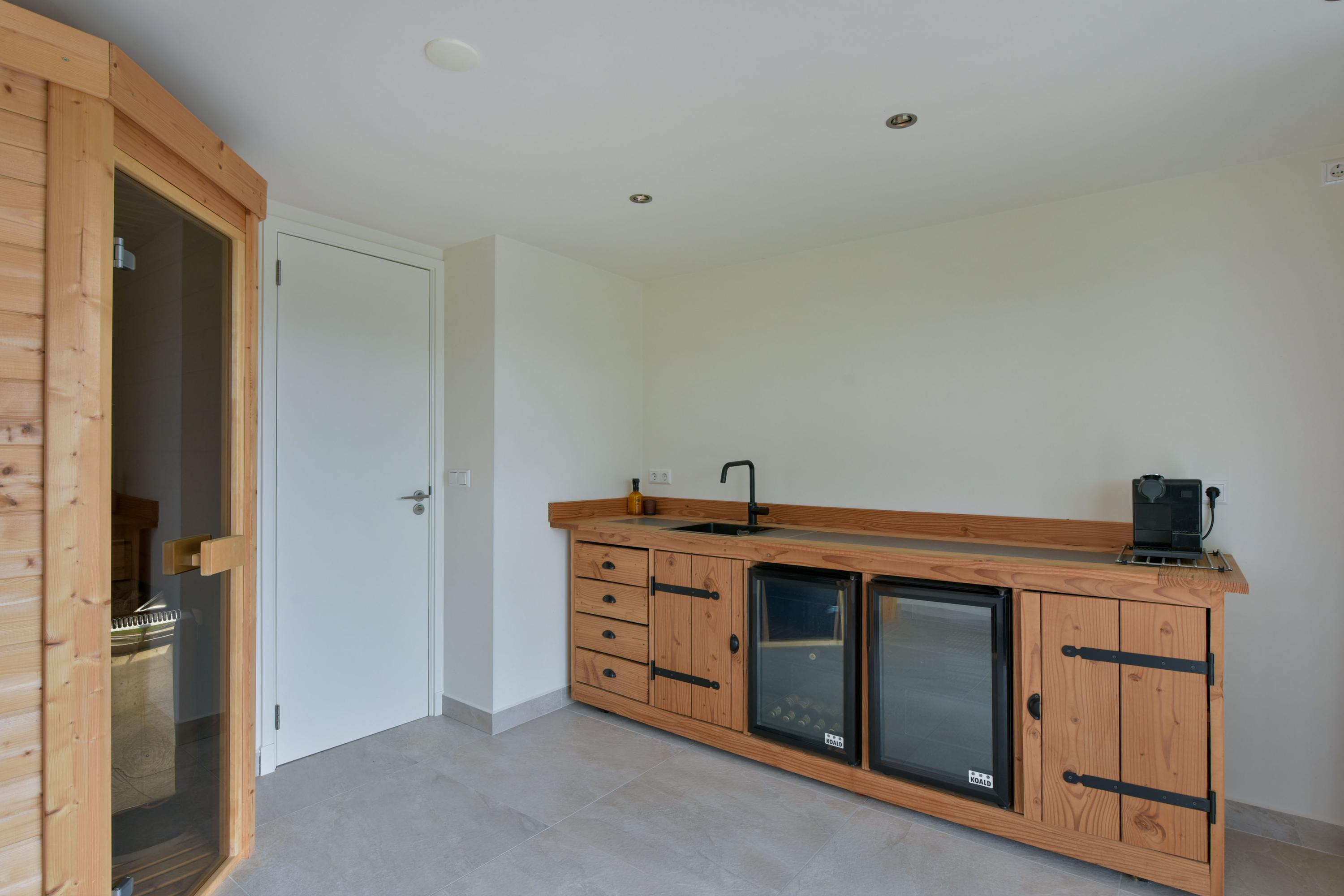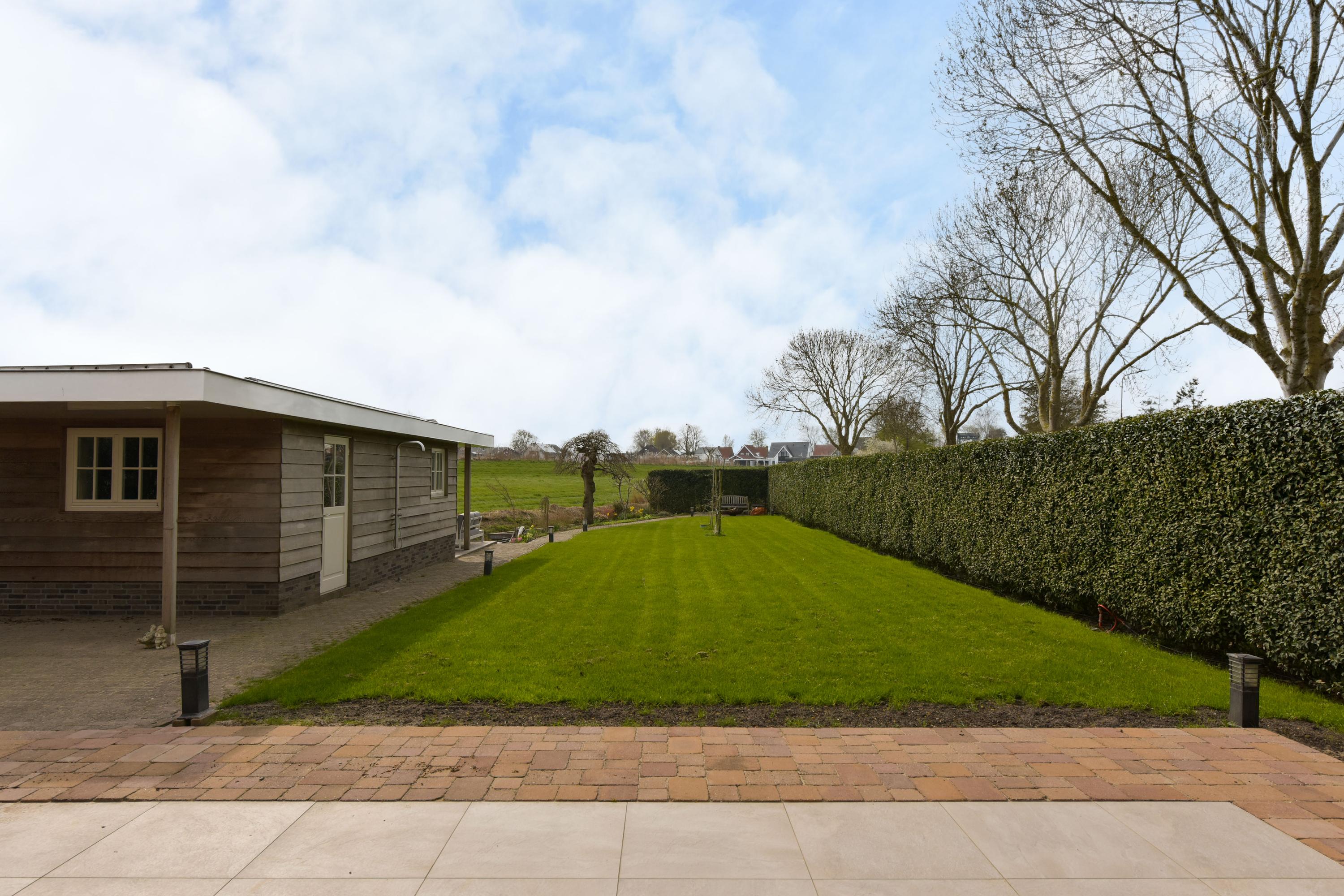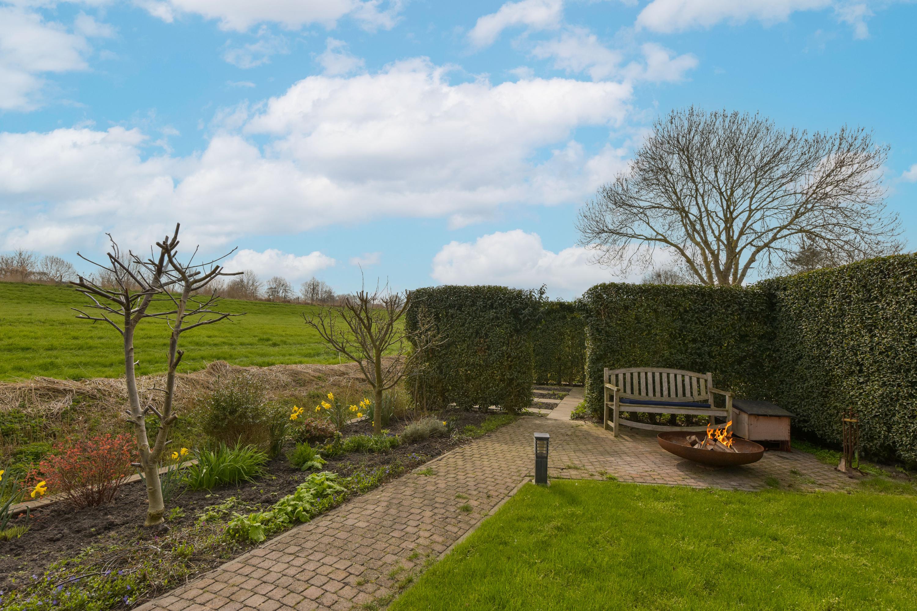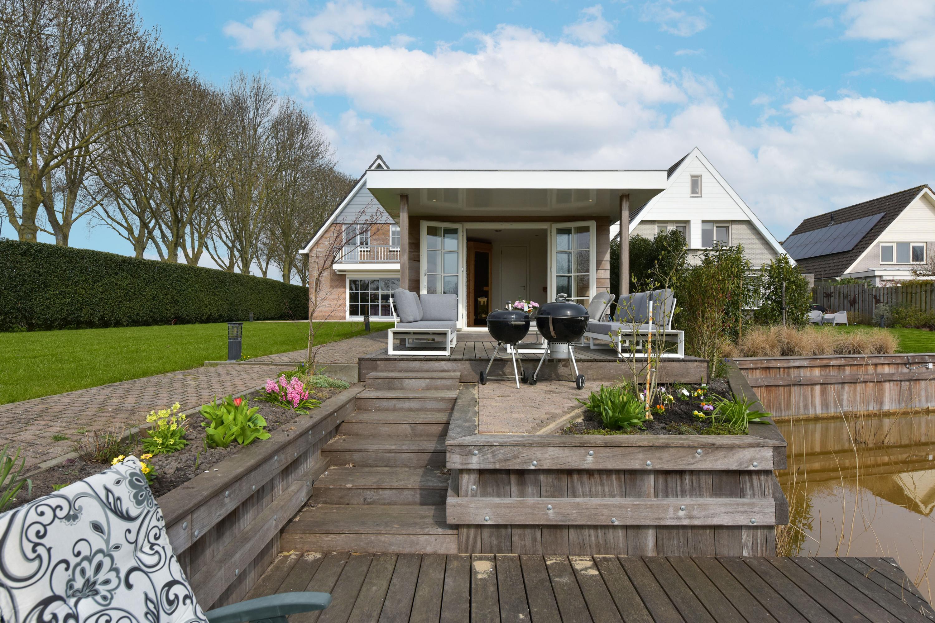 À l’extérieur, un jardin paysager se déploie tout autour de la maison : système d’arrosage perfectionné, terrasses aménagées, espace de détente orienté sud avec sauna et vue sur l’eau et la verdure. La dépendance offre un espace de rangement supplémentaire et un espace bien-être dédié. L’ensemble du jardin est subtilement éclairé pour des soirées atmosphériques, tandis qu’arbres fruitiers et potager enrichissent l’expérience du quotidien à la campagne.