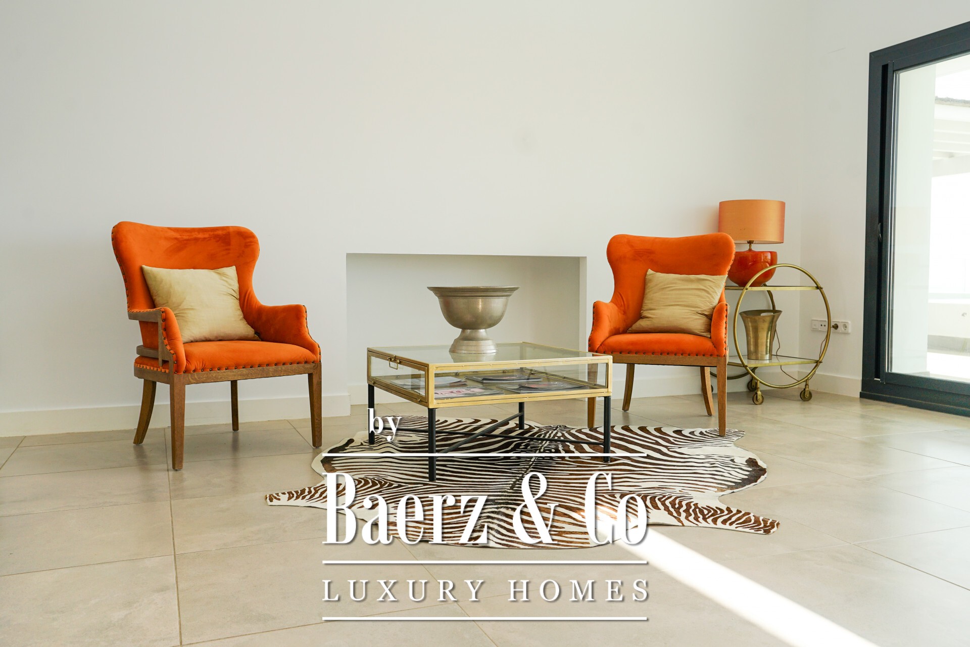 Gli spazi principali si configurano in un grande open space, dove vetrate a tutta altezza collegano l’ampio soggiorno e la zona pranzo alle aree esterne coperte. La cucina, raffinata e completamente attrezzata con elettrodomestici di alta gamma, si apre su una zona barbecue esterna; una sala TV separata, una palestra privata, una stanza del vapore e uno studio riservato completano il comfort quotidiano. Quattro camere da letto e cinque bagni, di cui tre en suite, assicurano privacy e flessibilità, incluso uno studio facilmente trasformabile in una quinta suite.