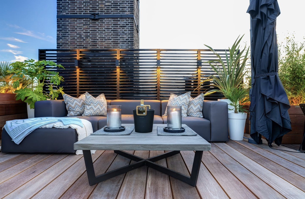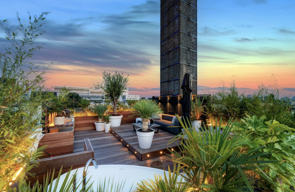 Il cuore dell’appartamento è il luminoso soggiorno, arricchito da un camino a gas contemporaneo e da una cucina a vista di pregio, dotata di elettrodomestici Siemens da incasso. Porte finestre si affacciano su un soleggiato balcone, mentre una scala interna conduce a una terrazza panoramica di 33 m², completa di cucina esterna, vasca, illuminazione LED e piante ornamentali. Il panorama aperto sull’Amstel regala un’atmosfera di privacy e lusso discreto, rispecchiata nella ristrutturazione accurata e nei dettagli studiati presenti in ogni ambiente.