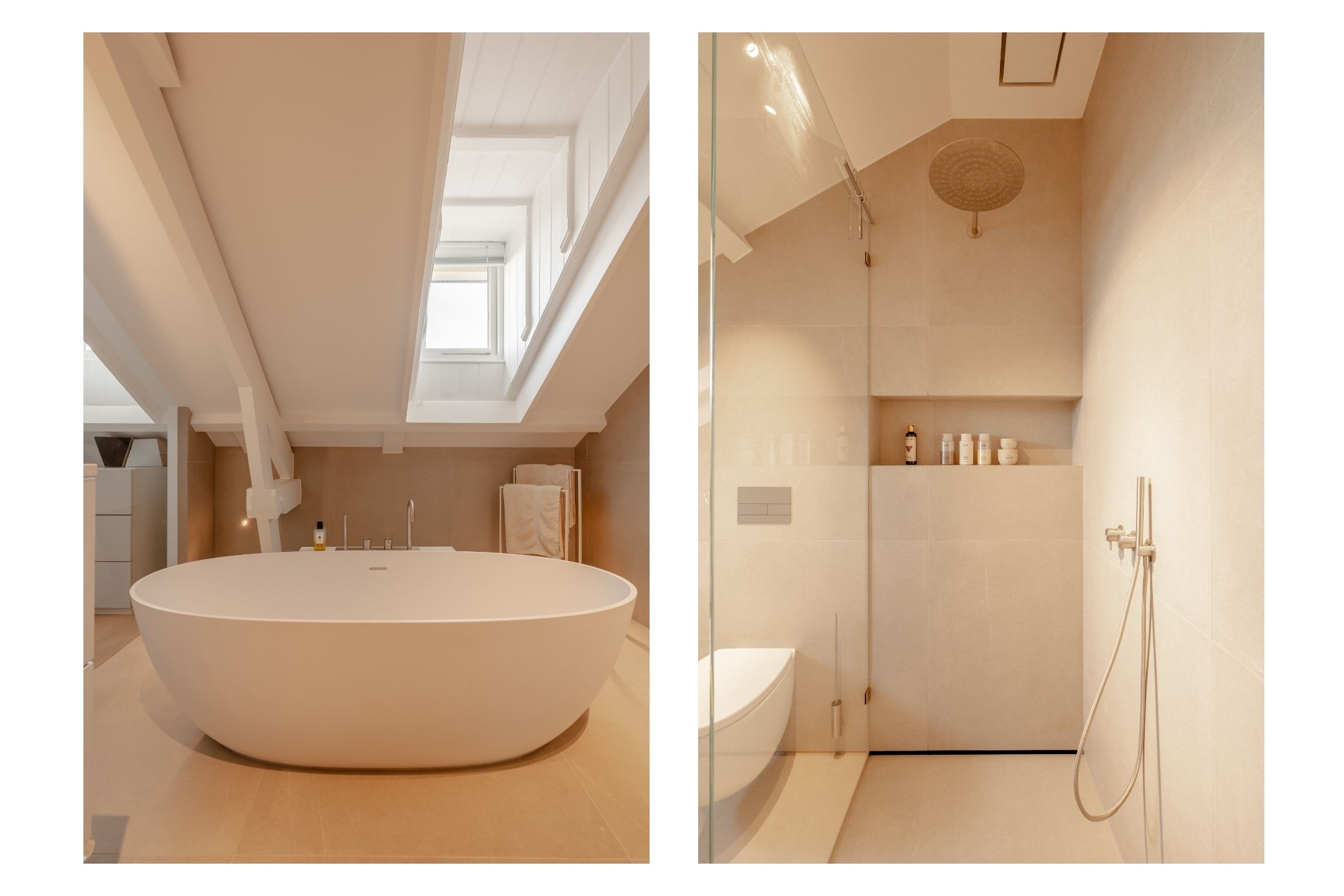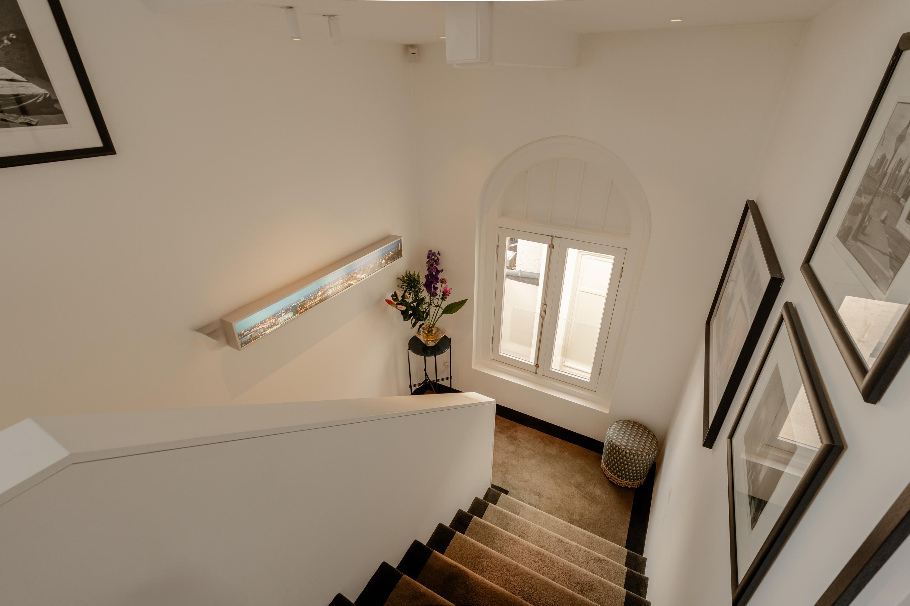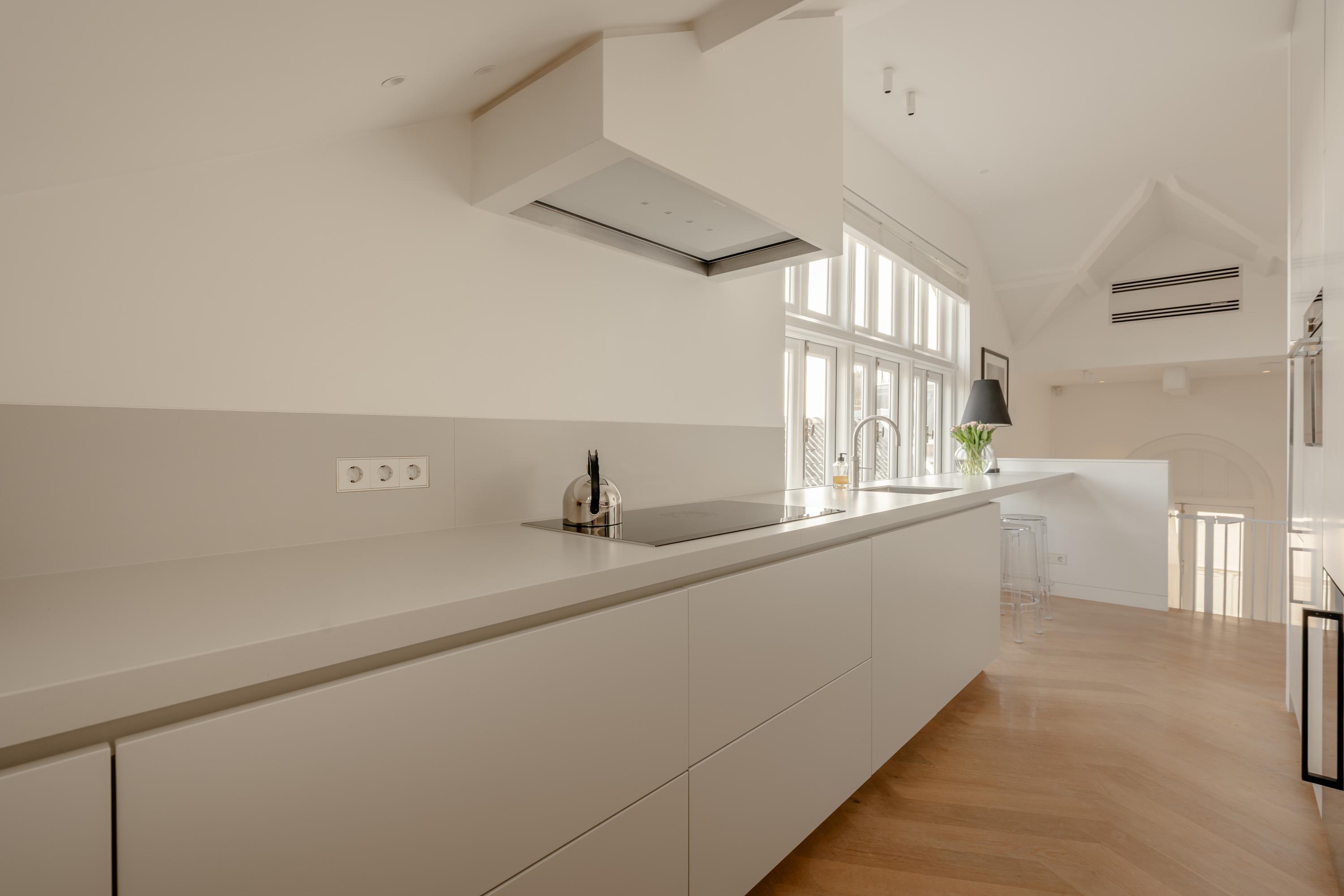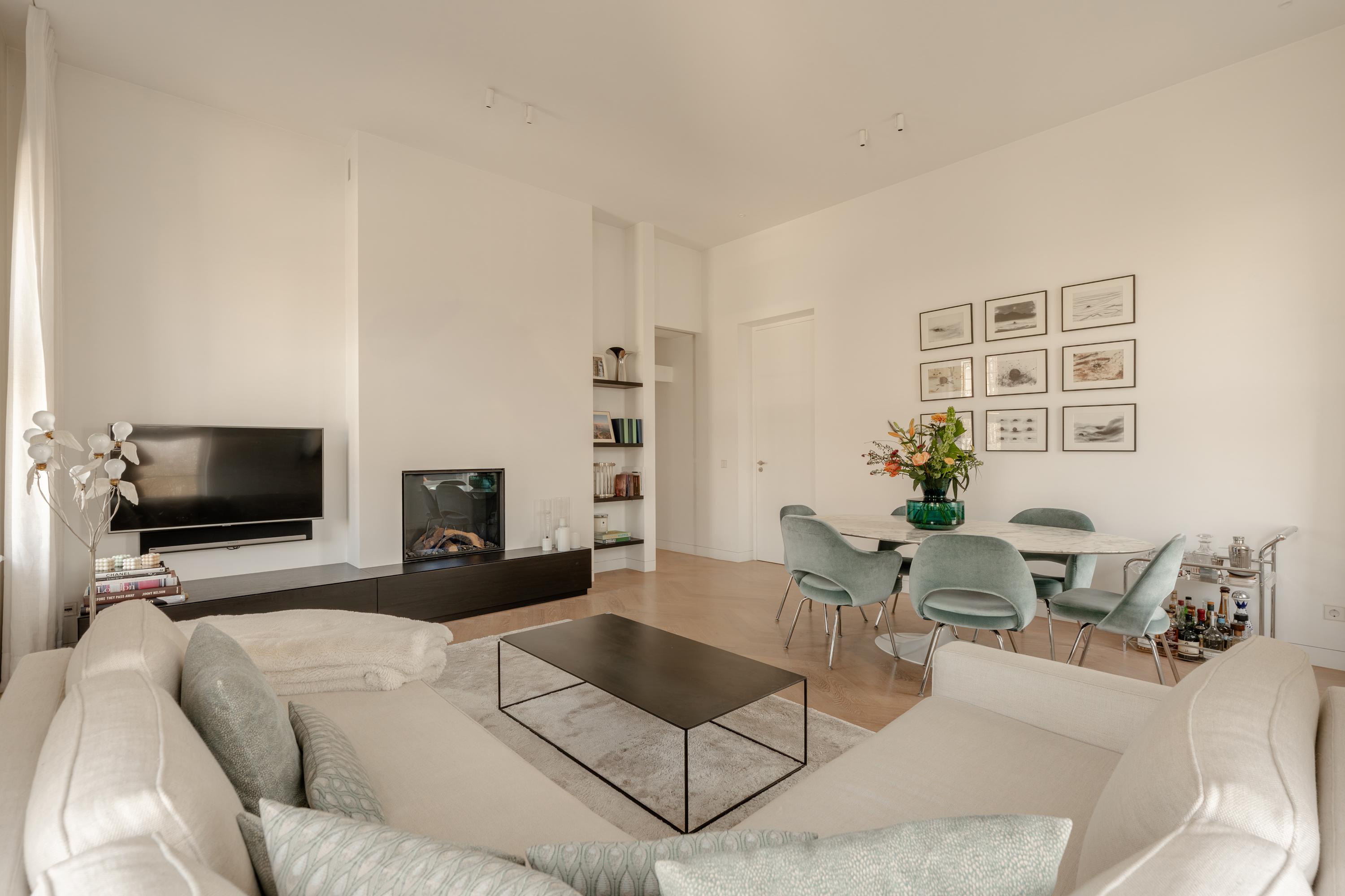 La cucina a vista, cuore pulsante della zona giorno, è arredata con mobili personalizzati a tutta altezza, elettrodomestici Siemens di fascia alta, piano a induzione, rubinetto Quooker, cantina climatizzata per vini e area bar. Gli ambienti si collegano con fluidità al soggiorno, dove vetrate istoriate e un camino a gas aggiungono carattere. Sia la suite padronale che la seconda camera sono attentamente progettate con spazi contenitivi integrati e aria condizionata, offrendo due bagni di altissimo livello dotati di vasca indipendente e docce walk-in.