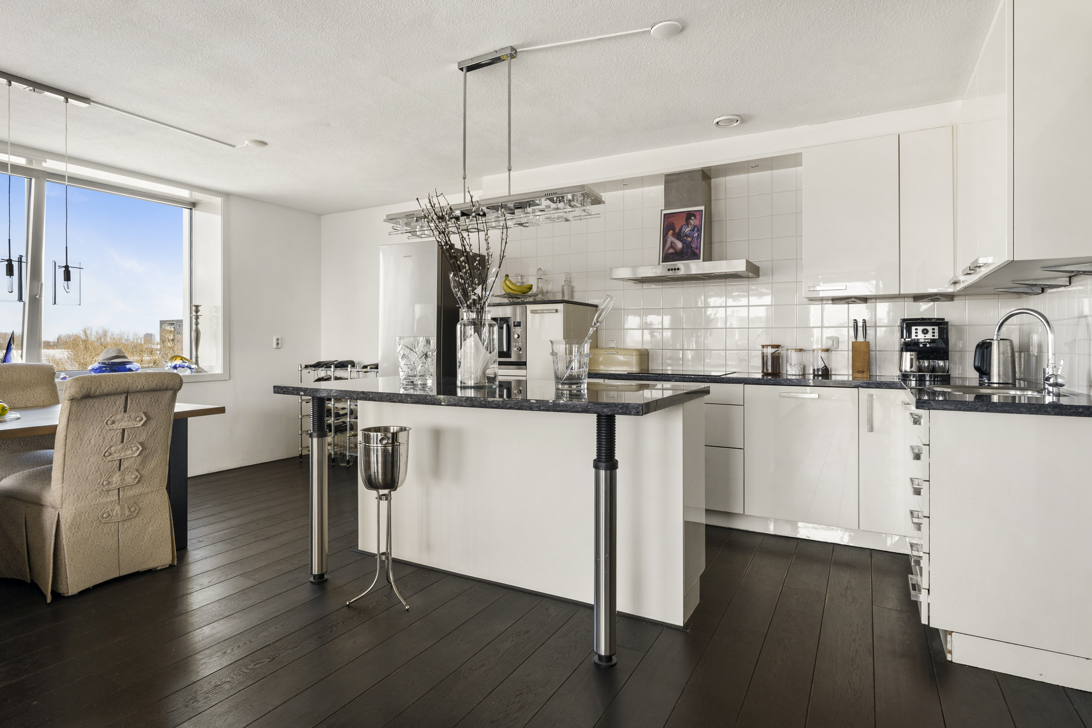 Luxurious three-room corner apartment of 117 m² with unobstructed views of the water and the Zuidas skyline, featuring two bedrooms, a high-end kitchen with cooking island, and an optional private parking space. The apartment is located on the seventh floor of the striking Gelderhof apartment complex, completed in 2004.