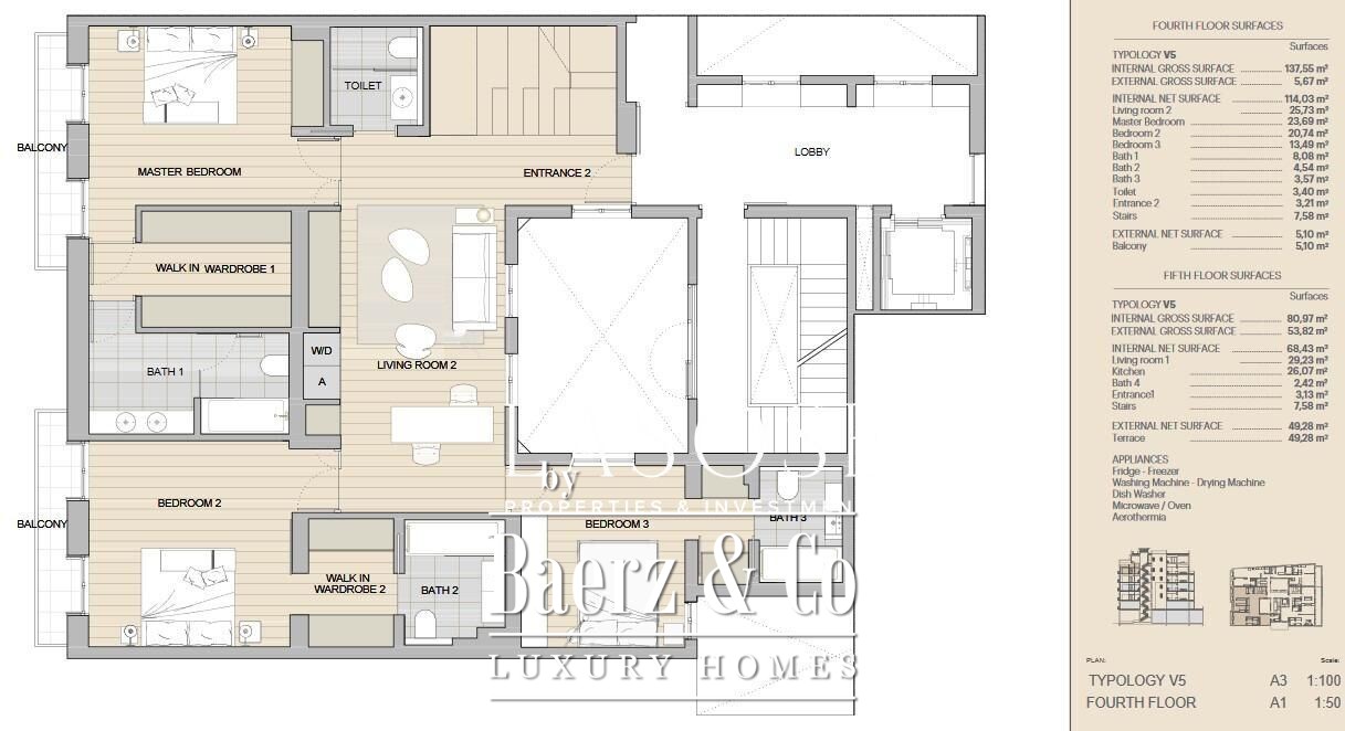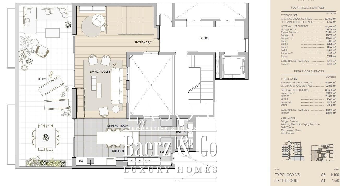 Con tre camere da letto e cinque bagni, la disposizione interna favorisce sia una vita privata di alto profilo che momenti di ricevimento raffinato. Finiture di pregio si integrano con elettrodomestici moderni, aria condizionata, riscaldamento, videocitofono e dettagli funzionali come guardaroba, armadiature e una lavanderia dedicata.