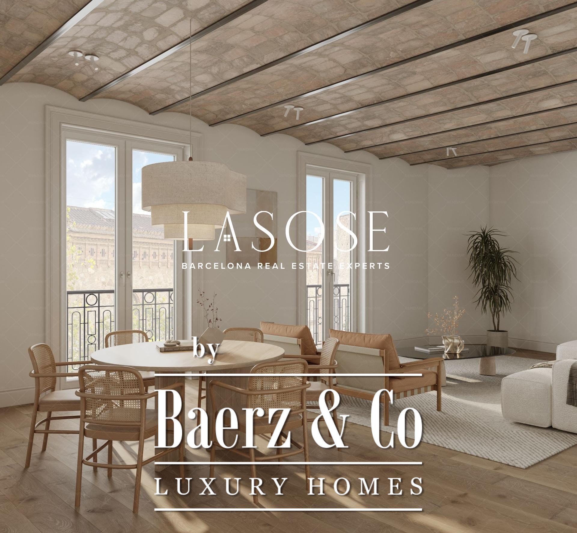 LASOSE invites you to this stunning 137 m2 residence, where space, natural light, and elegant design come together to create a warm and sophisticated home in the sought-after Dreta de l’Eixample district.. . The apartment features a spacious living and dining area with charming exterior balconies that flood the space with natural light and offer views over the iconic Roger de Flor street. The kitchen, with stylish iron and glass doors, allows for flexible use—open it to entertain or close it off for more privacy.. . There are two generous double bedrooms, one with an integrated gallery that enhances the space with light and warmth. The property also includes two full bathrooms and an additional guest toilet for convenience.. . *Images are renderings of the project*. . Completion date: third quarter 2025. . Situated in one of the most prestigious neighborhoods of Barcelona, just steps away from top restaurants, designer boutiques, and cultural landmarks, this home offers a perfect blend of comfort, design, and prime location.. . Don’t miss this exceptional opportunity to invest in Barcelona’s lifestyle and charm.. Contact us today to arrange a private viewing.
