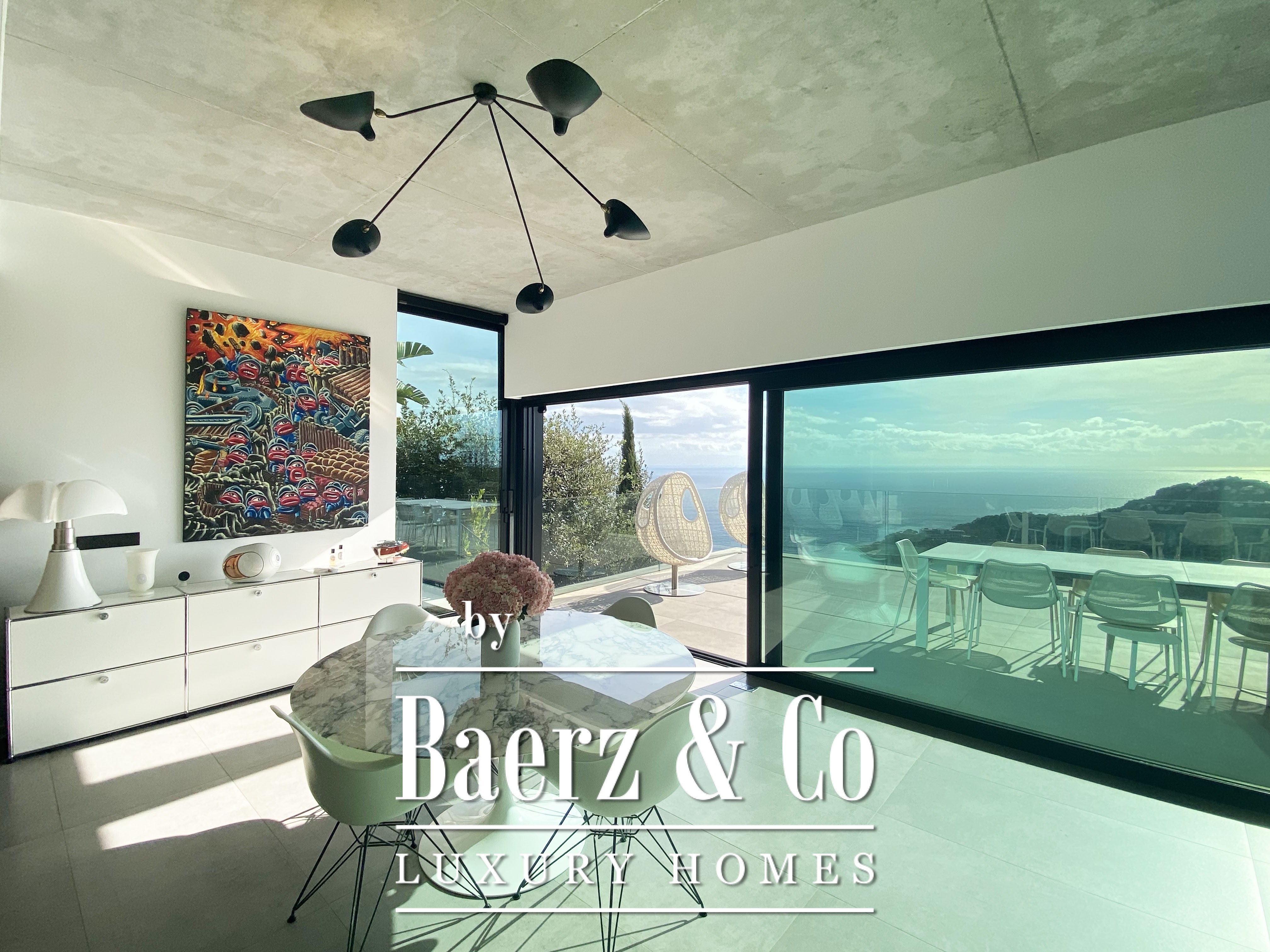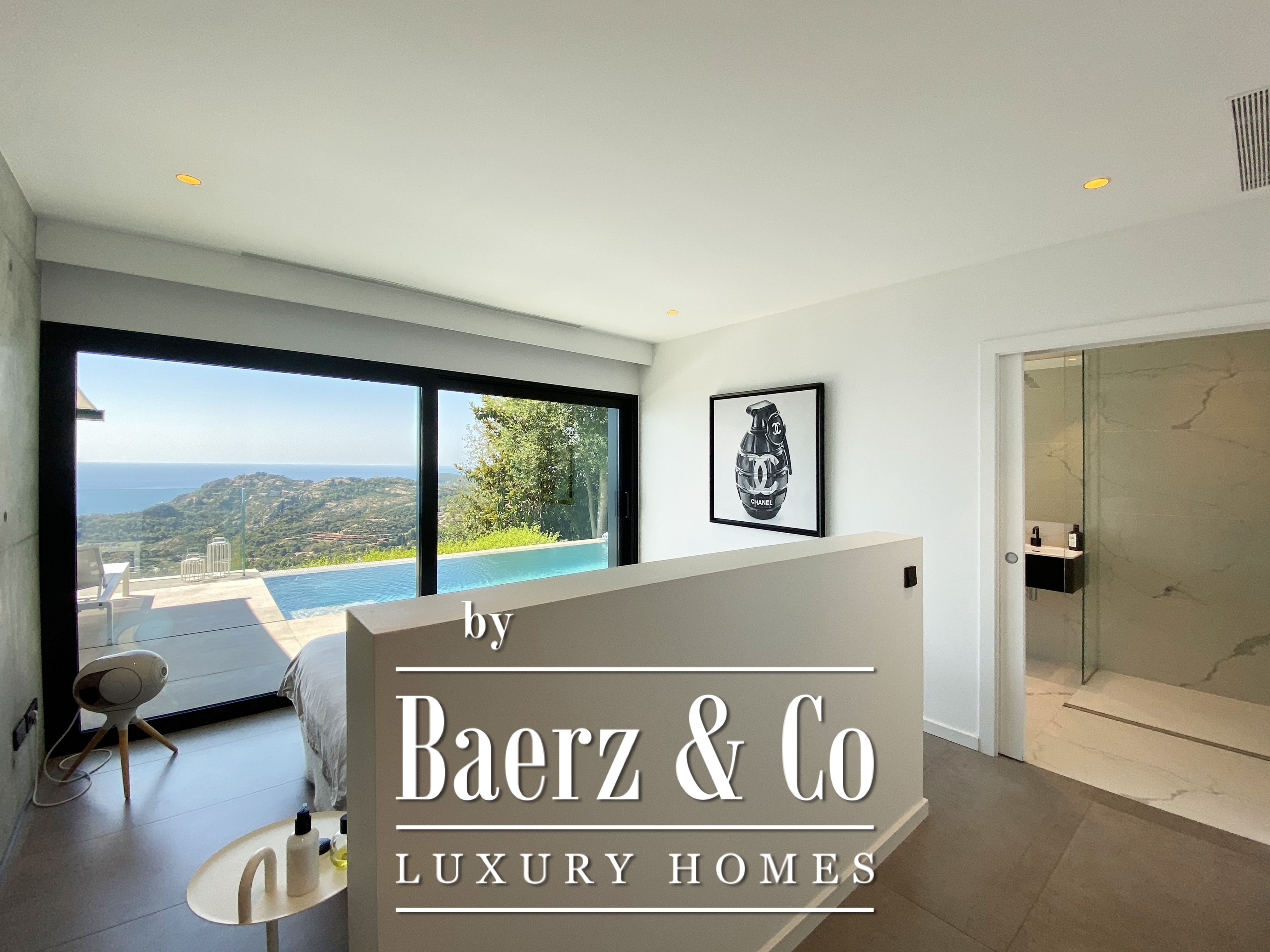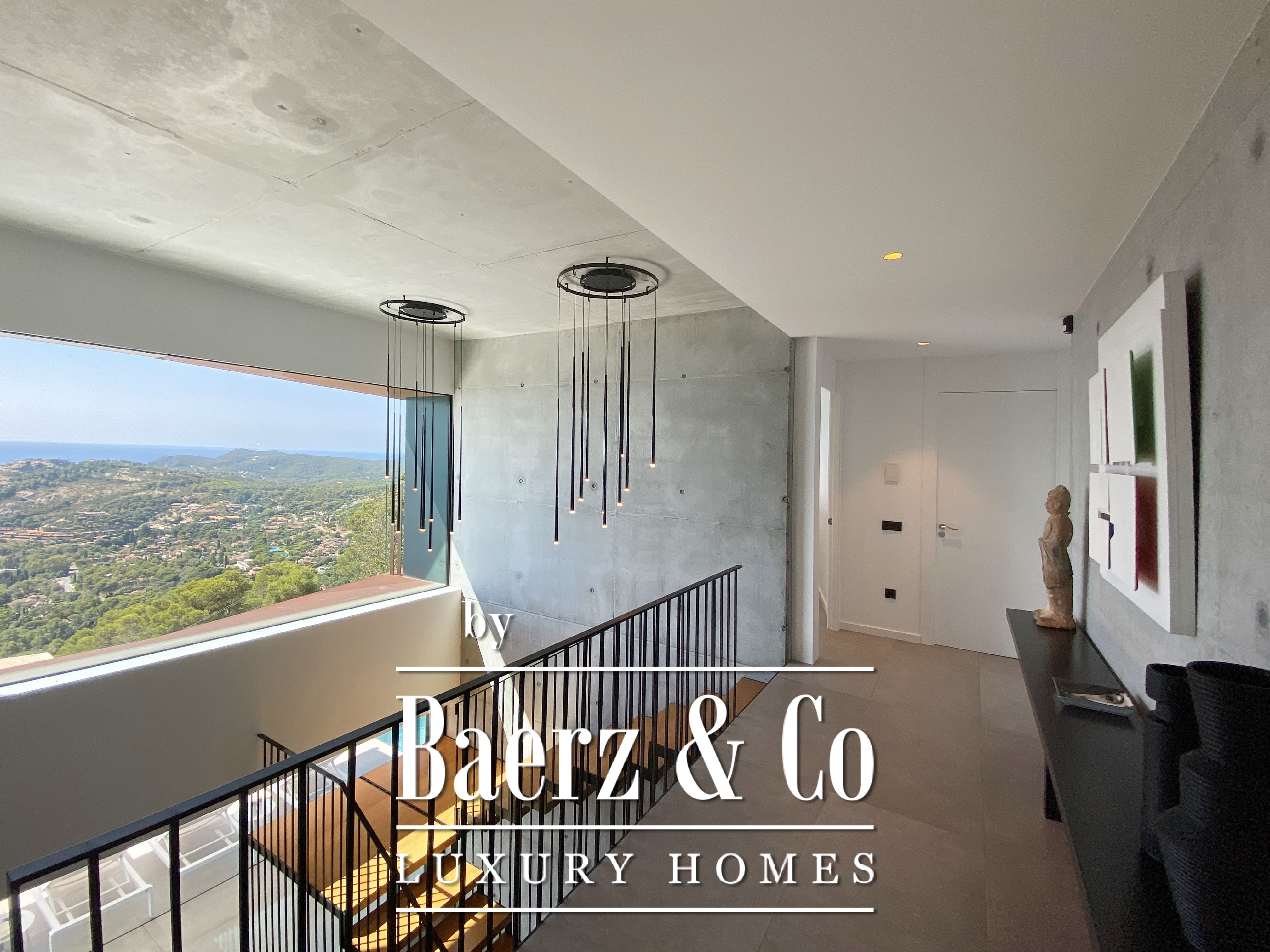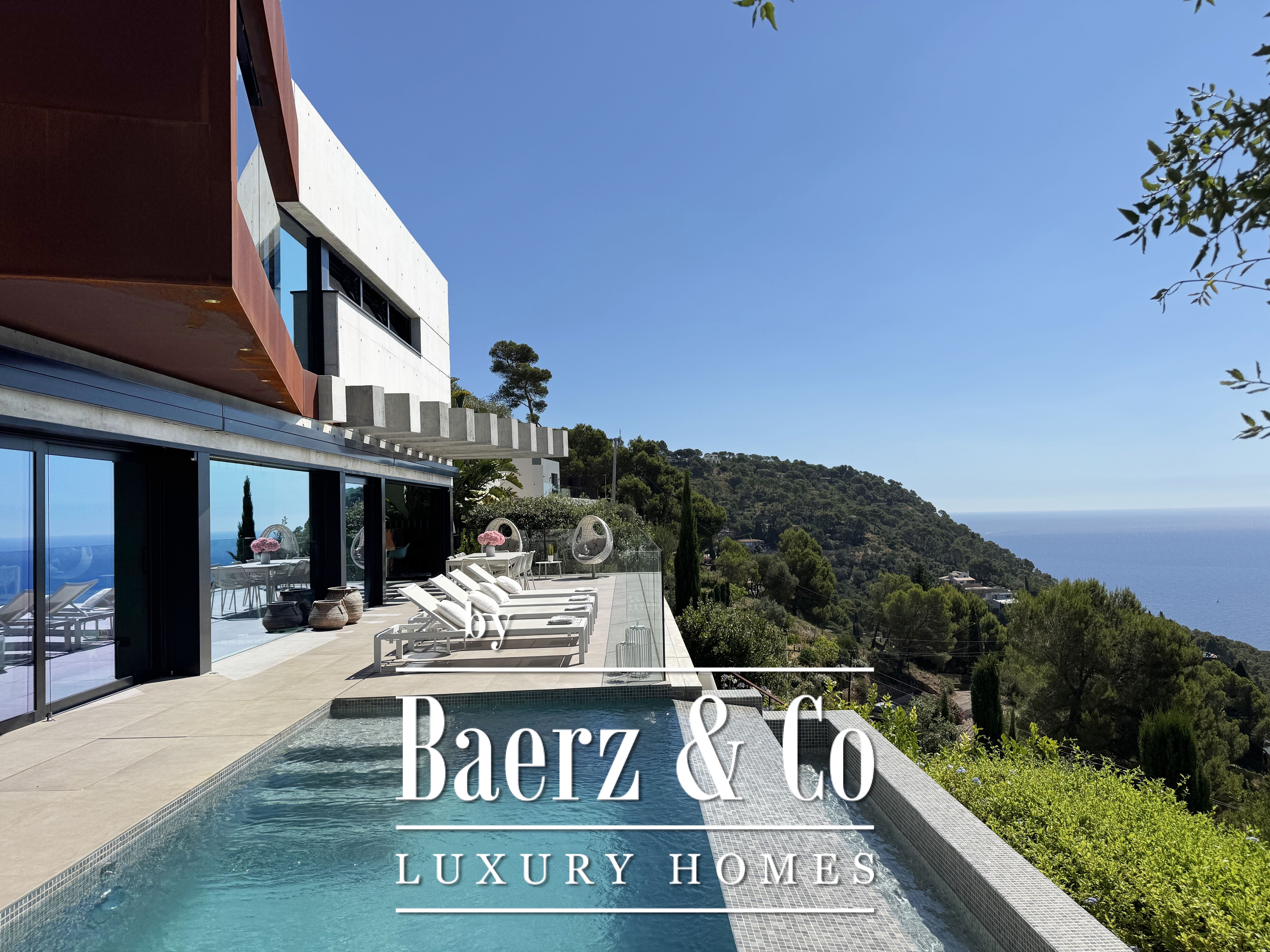 Distribuita su tre livelli interconnessi e con una superficie abitabile di 431 m² su un lotto di 977 m², la villa accoglie la luce naturale attraverso ampie vetrate, incorniciando panorami di mare e montagne in ogni ambiente principale. Il livello superiore comprende ampio spazio auto, una lounge relax e una raffinata camera matrimoniale con bagno en suite, ideale per gli ospiti o come suite padronale. Al piano principale, il luminoso soggiorno si apre su una terrazza con piscina a sfioro, regalando viste panoramiche sul Mediterraneo. La cucina americana, dotata di elettrodomestici di pregio, è collegata a spazi funzionali come la lavanderia e a una suite principale soleggiata con bagno privato e guardaroba.
