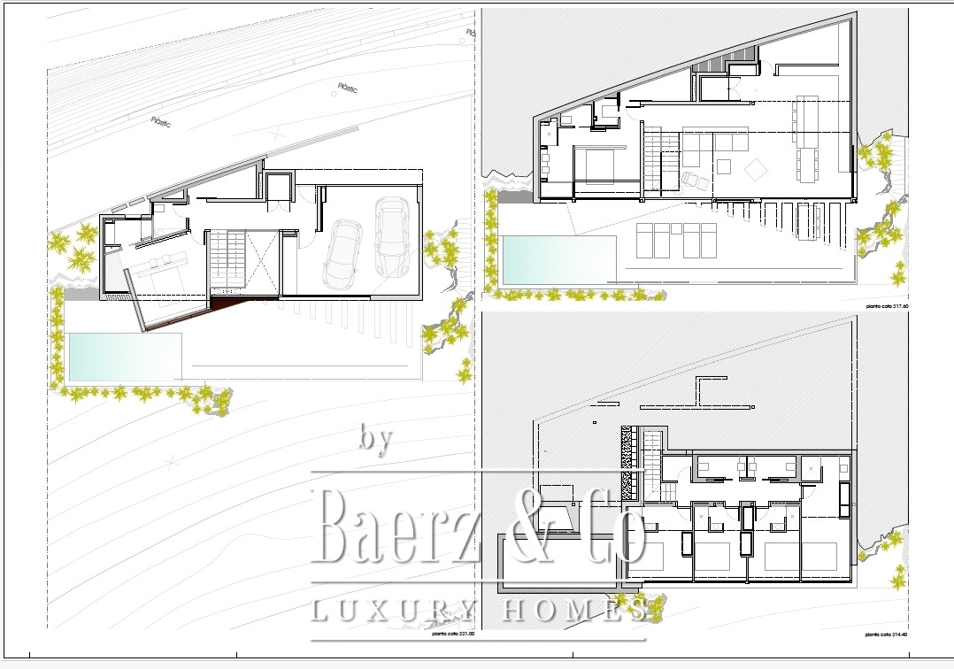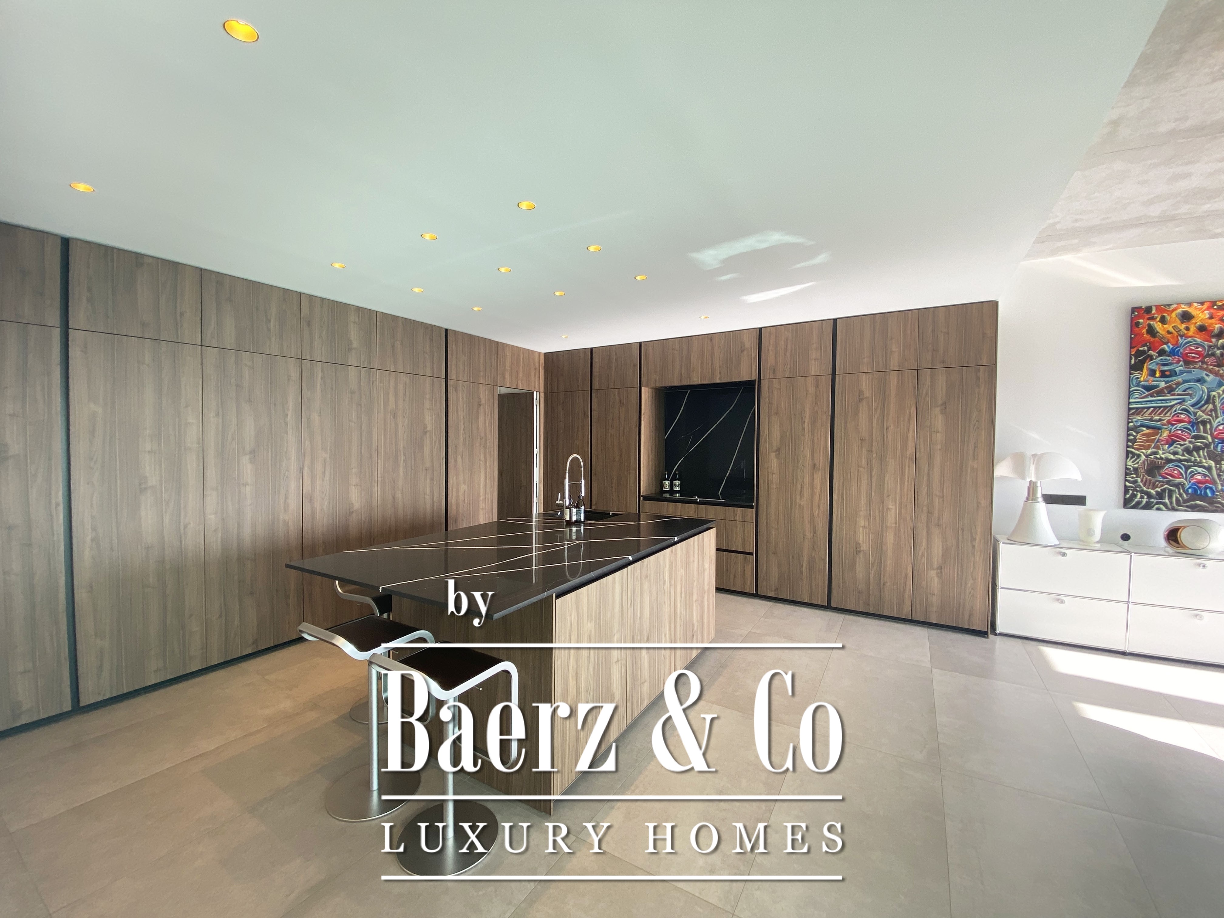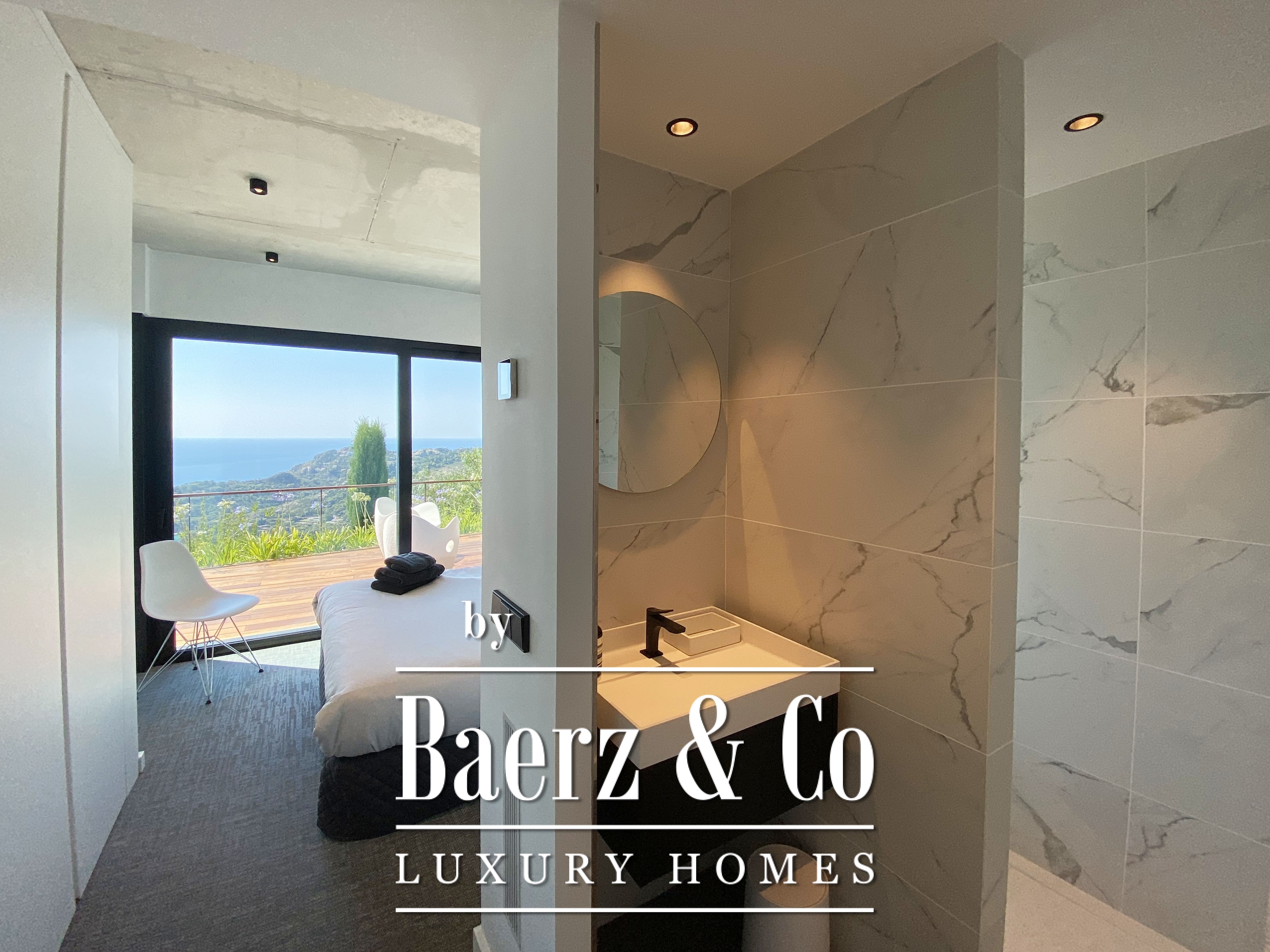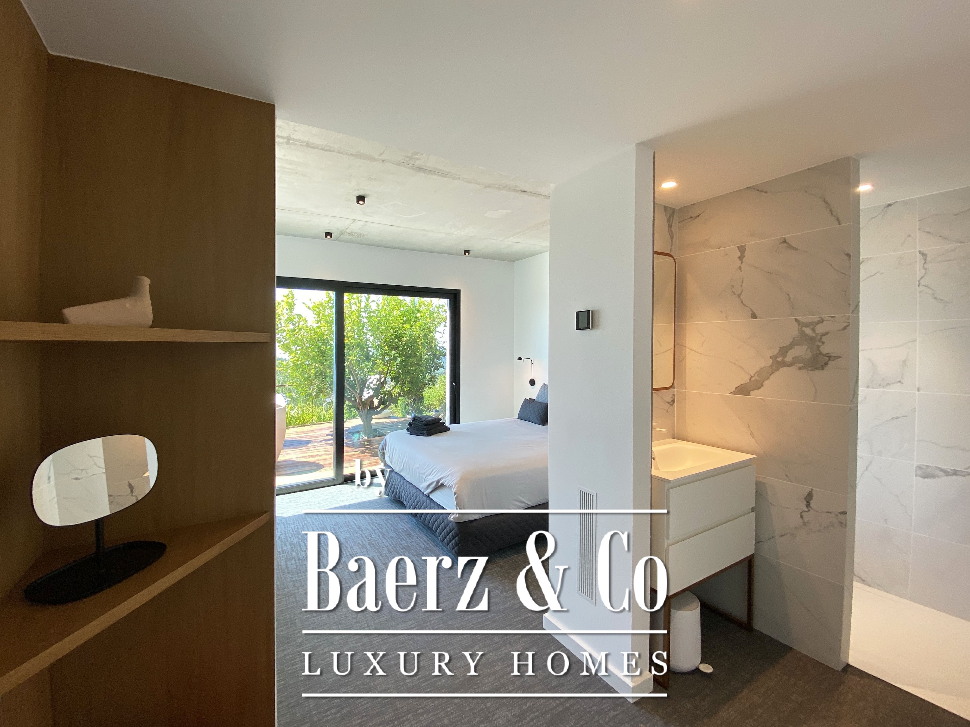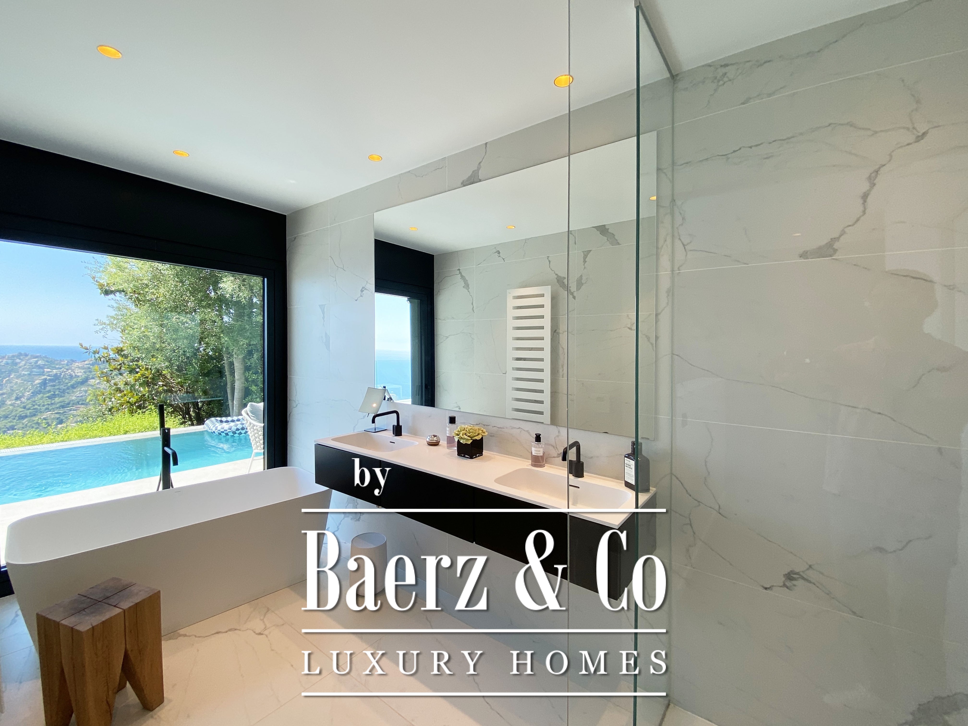 Distribuita su tre livelli interconnessi e con una superficie abitabile di 431 m² su un lotto di 977 m², la villa accoglie la luce naturale attraverso ampie vetrate, incorniciando panorami di mare e montagne in ogni ambiente principale. Il livello superiore comprende ampio spazio auto, una lounge relax e una raffinata camera matrimoniale con bagno en suite, ideale per gli ospiti o come suite padronale. Al piano principale, il luminoso soggiorno si apre su una terrazza con piscina a sfioro, regalando viste panoramiche sul Mediterraneo. La cucina americana, dotata di elettrodomestici di pregio, è collegata a spazi funzionali come la lavanderia e a una suite principale soleggiata con bagno privato e guardaroba.