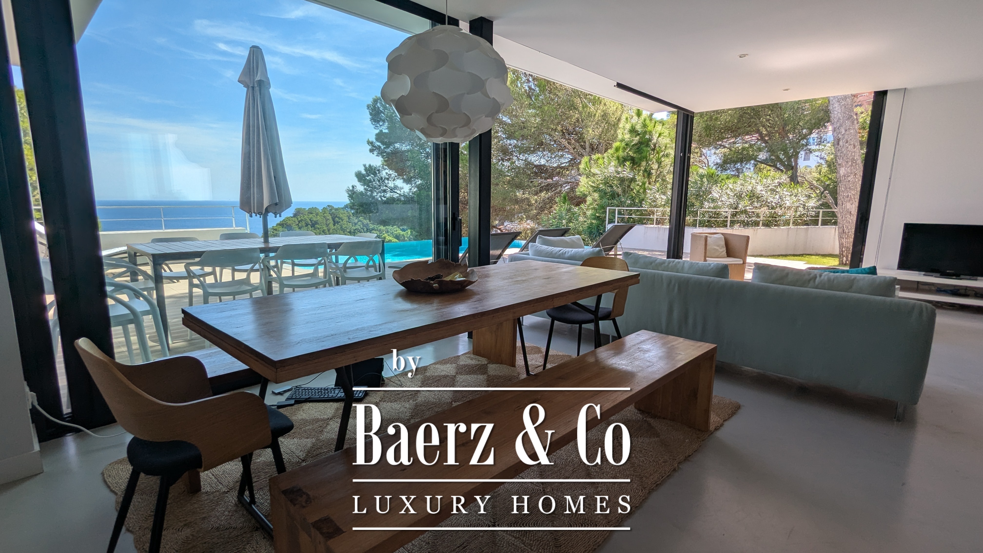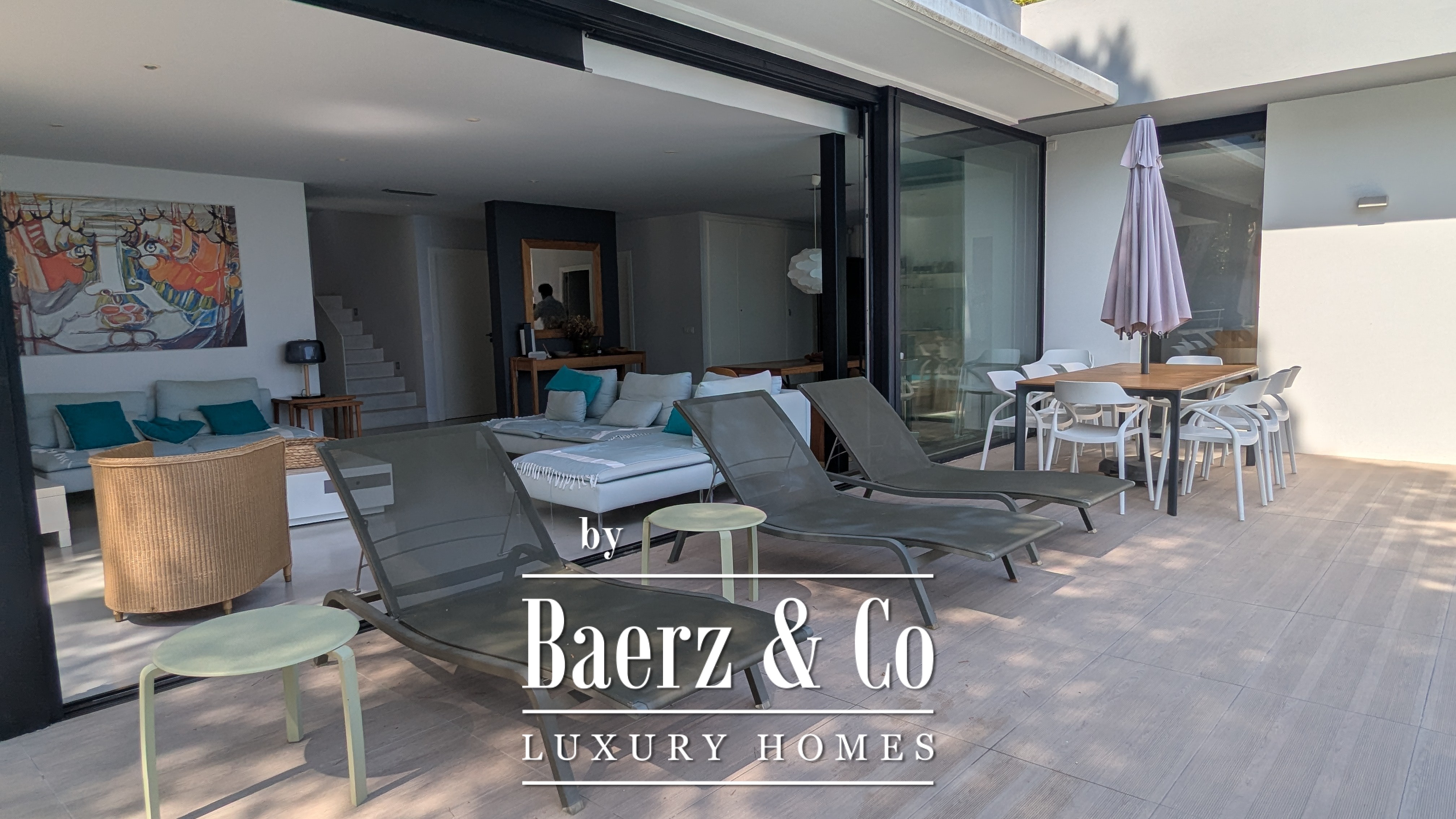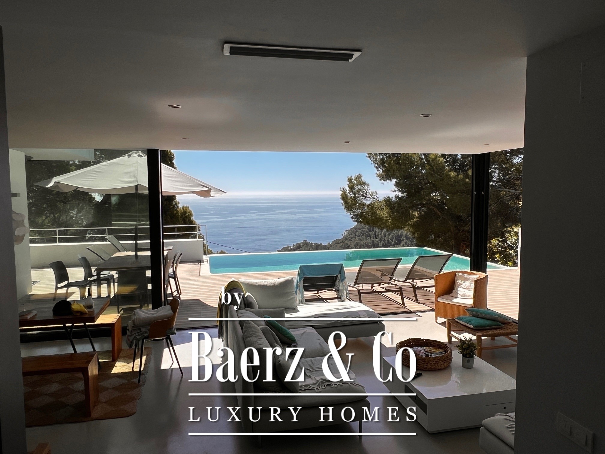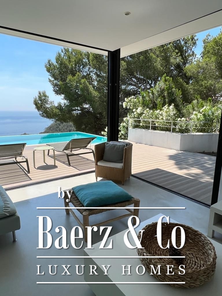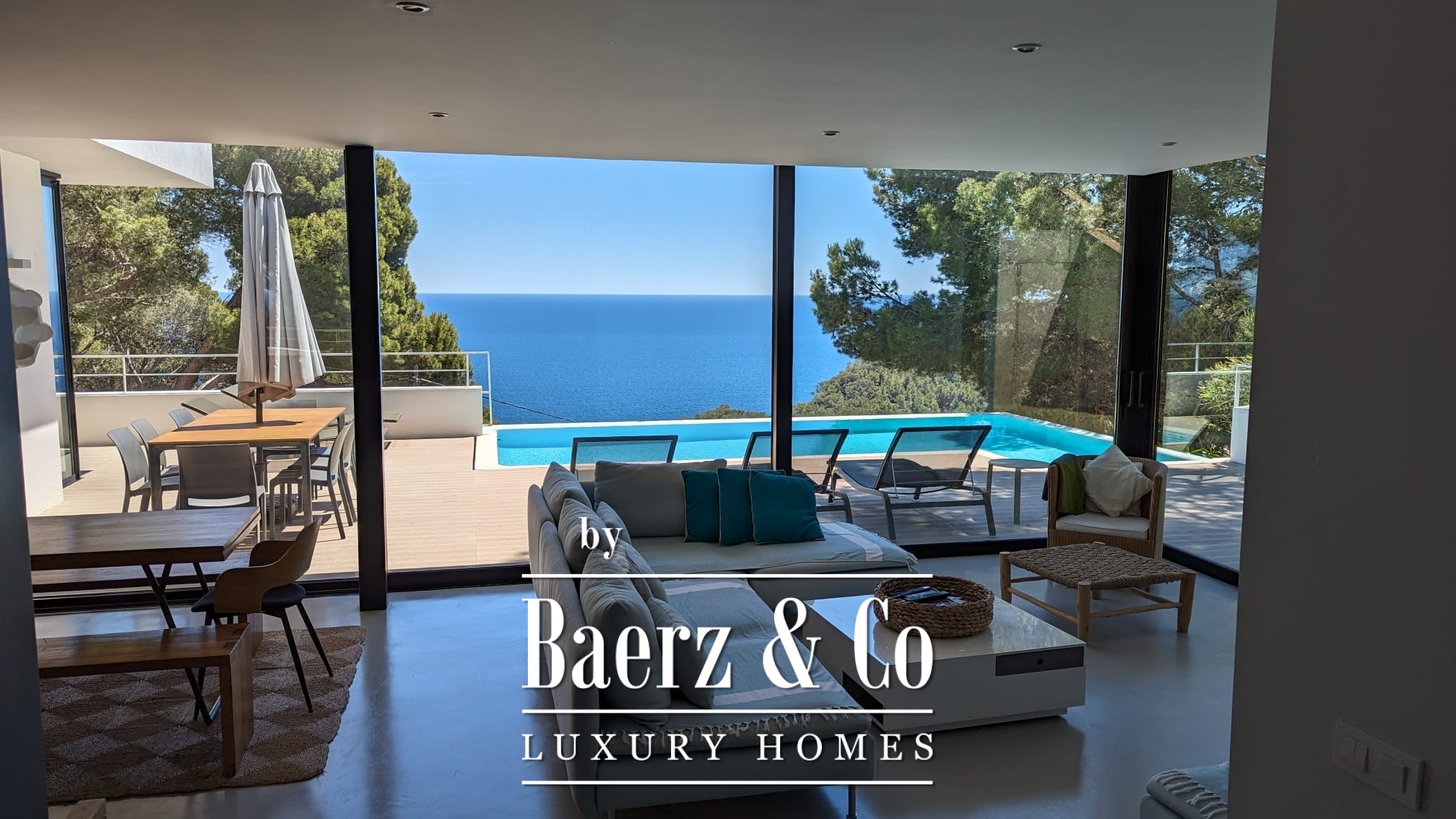 Nel cuore della casa, l’ampia zona giorno e pranzo con cucina completamente attrezzata invita a momenti conviviali, aprendosi direttamente su un’ampia terrazza dove una spettacolare piscina a sfioro incornicia la vista sul mare. Il contatto diretto con gli spazi esterni garantisce una perfetta alternanza di luce e aria durante tutta la giornata.
