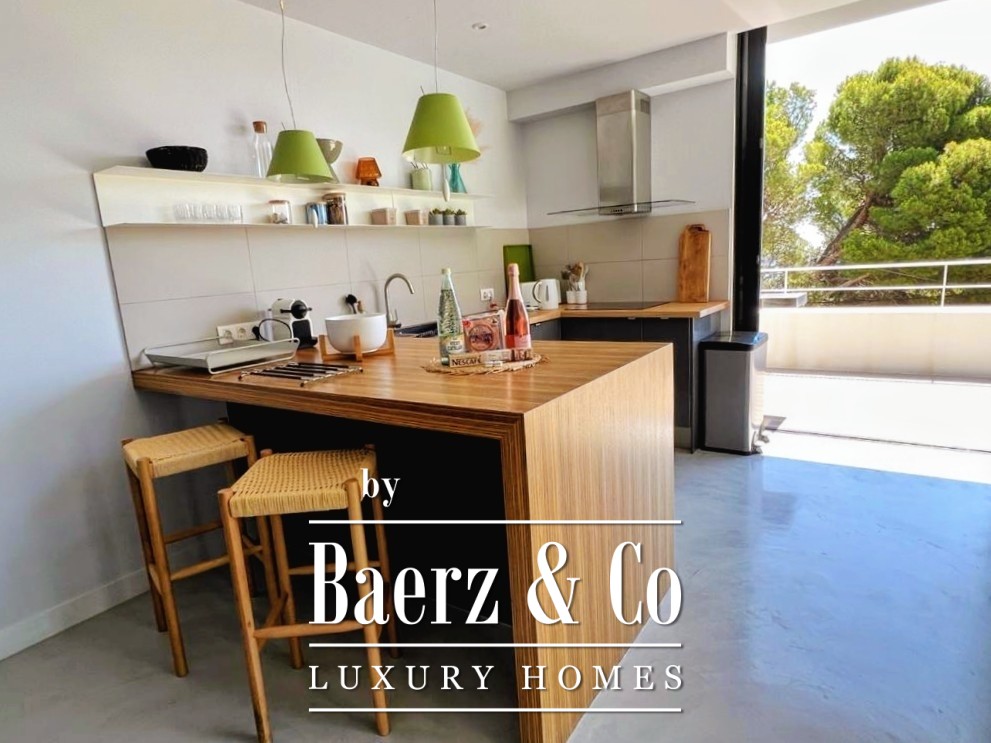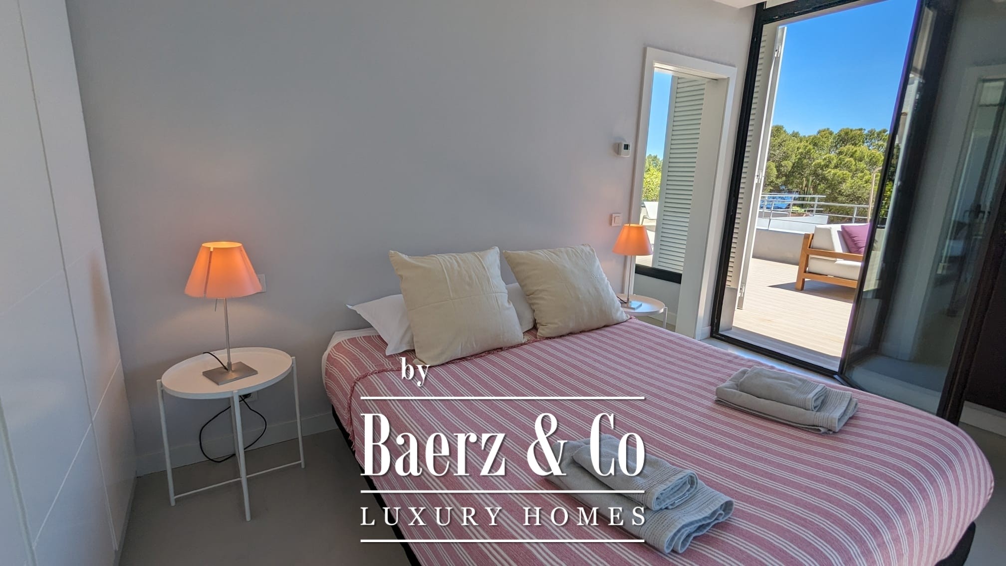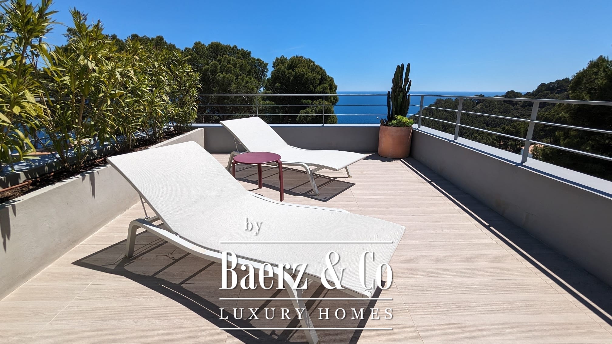 Il piano inferiore ospita due camere matrimoniali e un bagno, ambienti progettati per offrire comfort e armonia. Al piano superiore si trovano altre due camere matrimoniali che condividono un bagno e si affacciano entrambe su una terrazza di 50 m² con vista mare eccezionale.