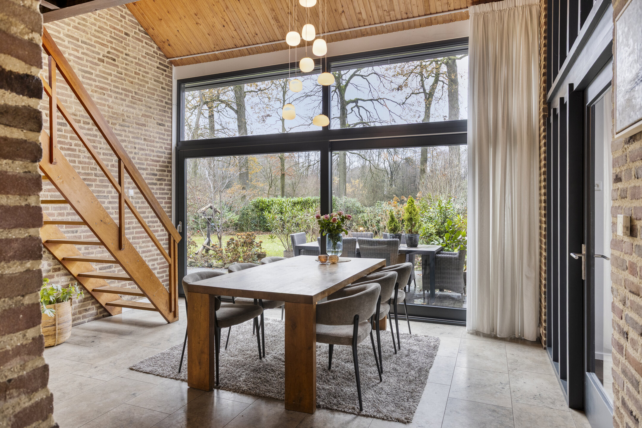 Via de hal kom je in de eetkamer, een lichte en uitnodigende ruimte dankzij de grote schuifpui. De eetkamer is voorzien van een houtkachel. Hier bevindt zich ook de trapopgang naar de eerste verdieping. Vanuit de eetkamer loop je door naar de woonkamer en de keuken. De woonkamer is ook voorzien van een sfeervolle houtkachel. De dichte keuken heeft een speels effect dank zij de bar aan het keukenblad. De keuken is uitgerust met diverse inbouwapparatuur, waaronder een 4-pits inductiekookplaat met afzuigkap, oven, koelkast, vaatwasser, stoomoven, warmhoudlade en een keukenboiler.