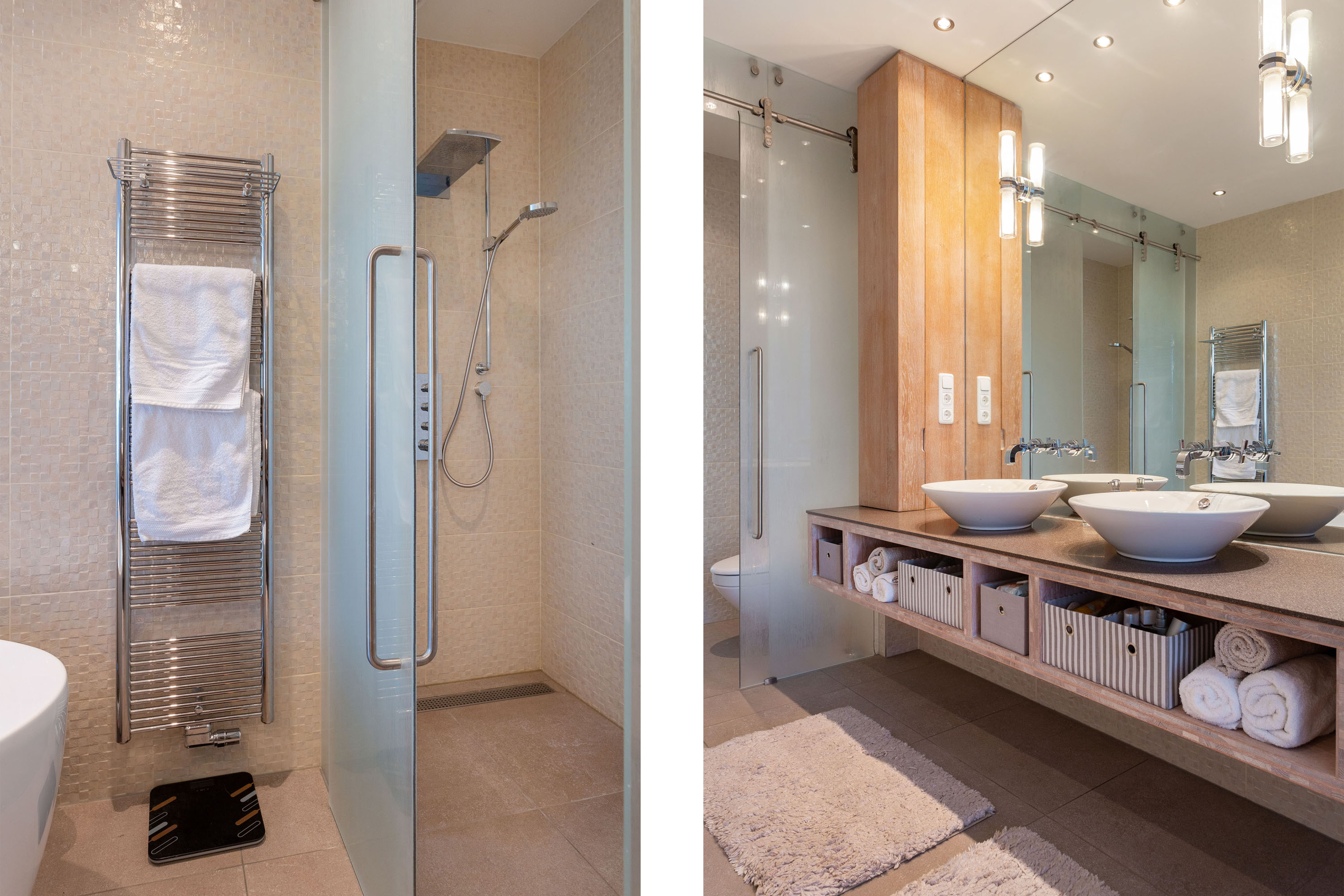 L’attenta ristrutturazione preserva le originali travi in legno, le porte della stalla e le proporzioni tipiche della casa rurale, integrando riscaldamento a pavimento, cucine moderne e bagni di alto livello. La residenza principale offre un soggiorno con viste panoramiche sui pascoli, una cucina con pavimento in rovere e accesso alla terrazza, dettagli autentici come il tradizionale camino e le porte dei letti a scomparto. La suite padronale al piano terra è dotata di un bagno di lusso, terrazza privata e cabina armadio.
