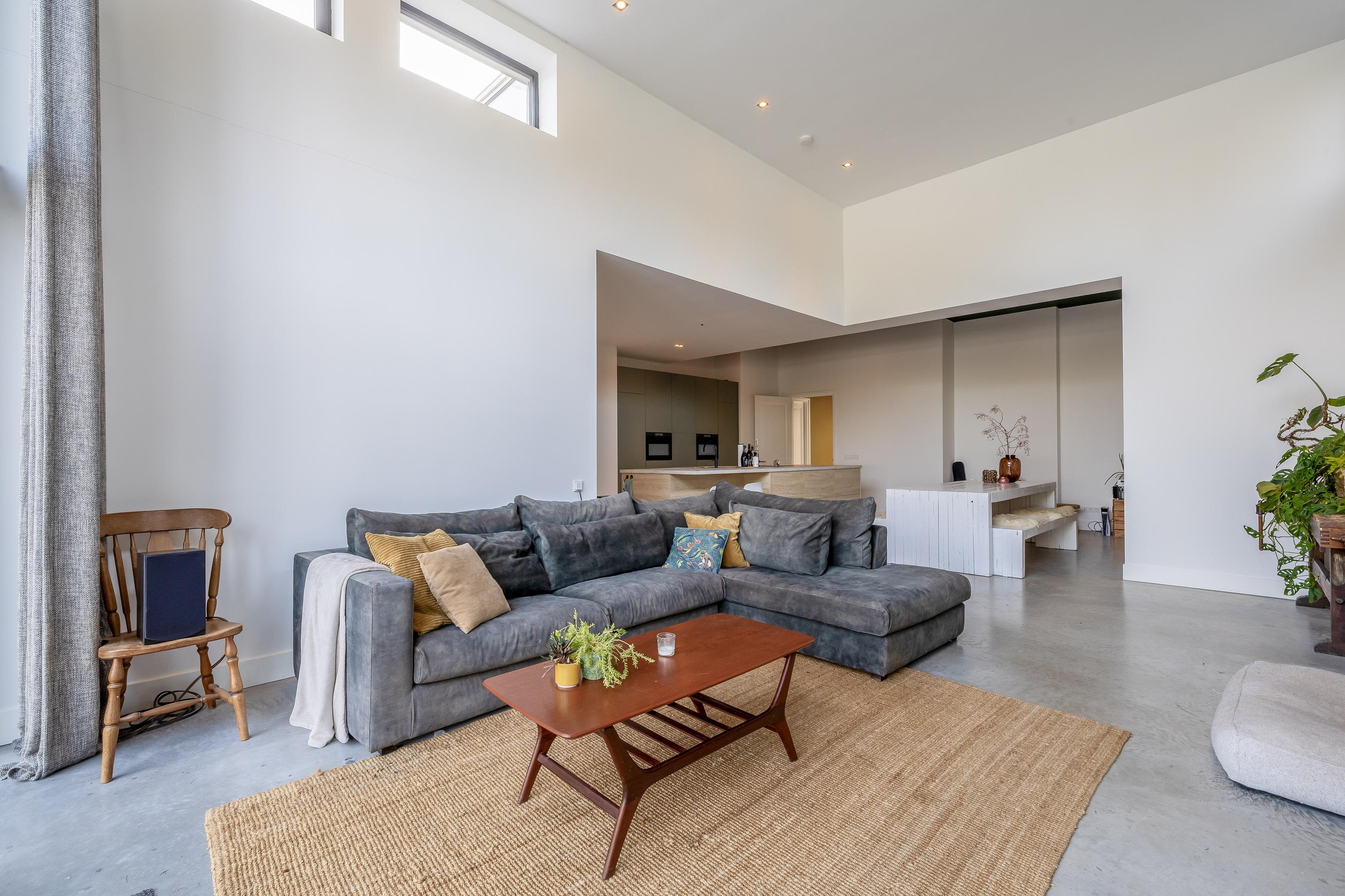 The spacious living room with open kitchen also offers abundant natural light thanks to the large glass façade at the rear and the smaller high windows. The height of the room creates a very large and pleasant living space.