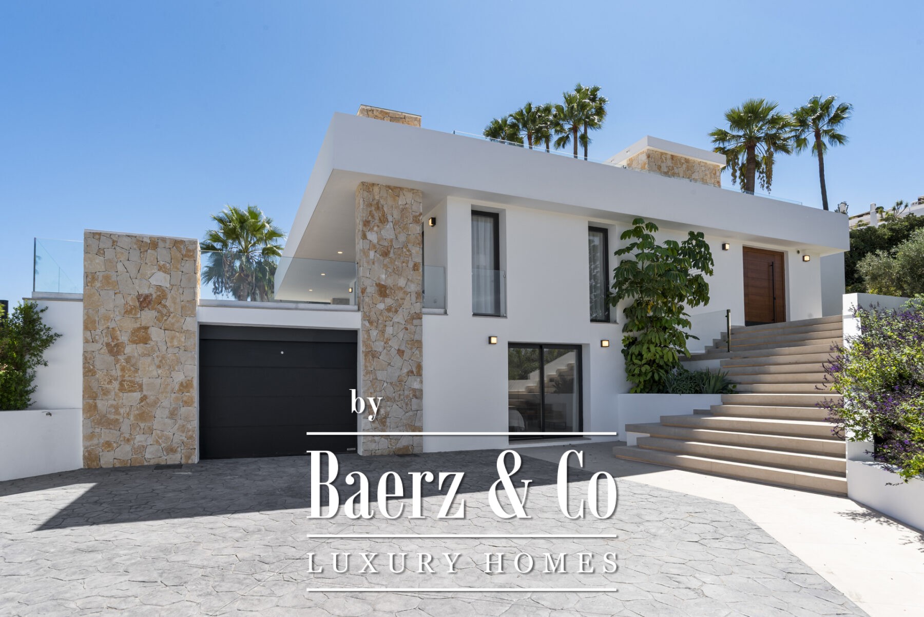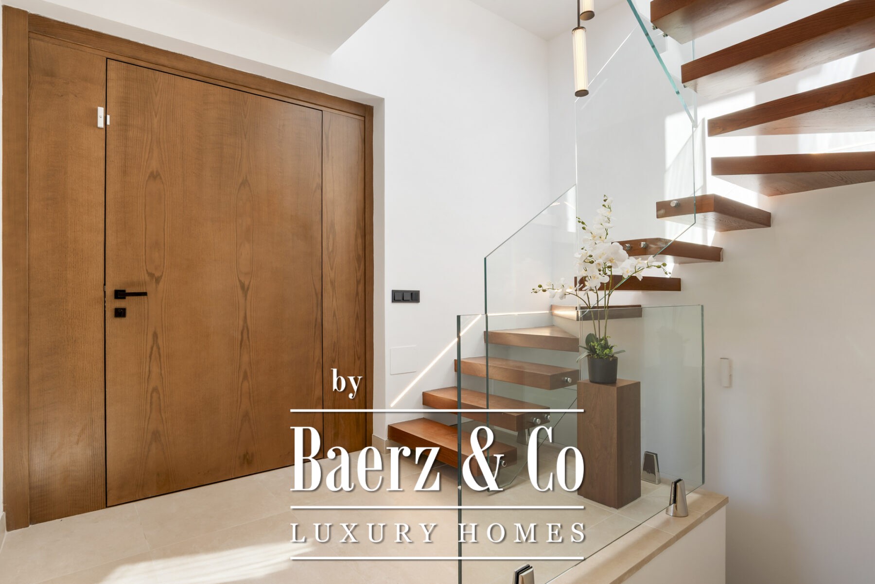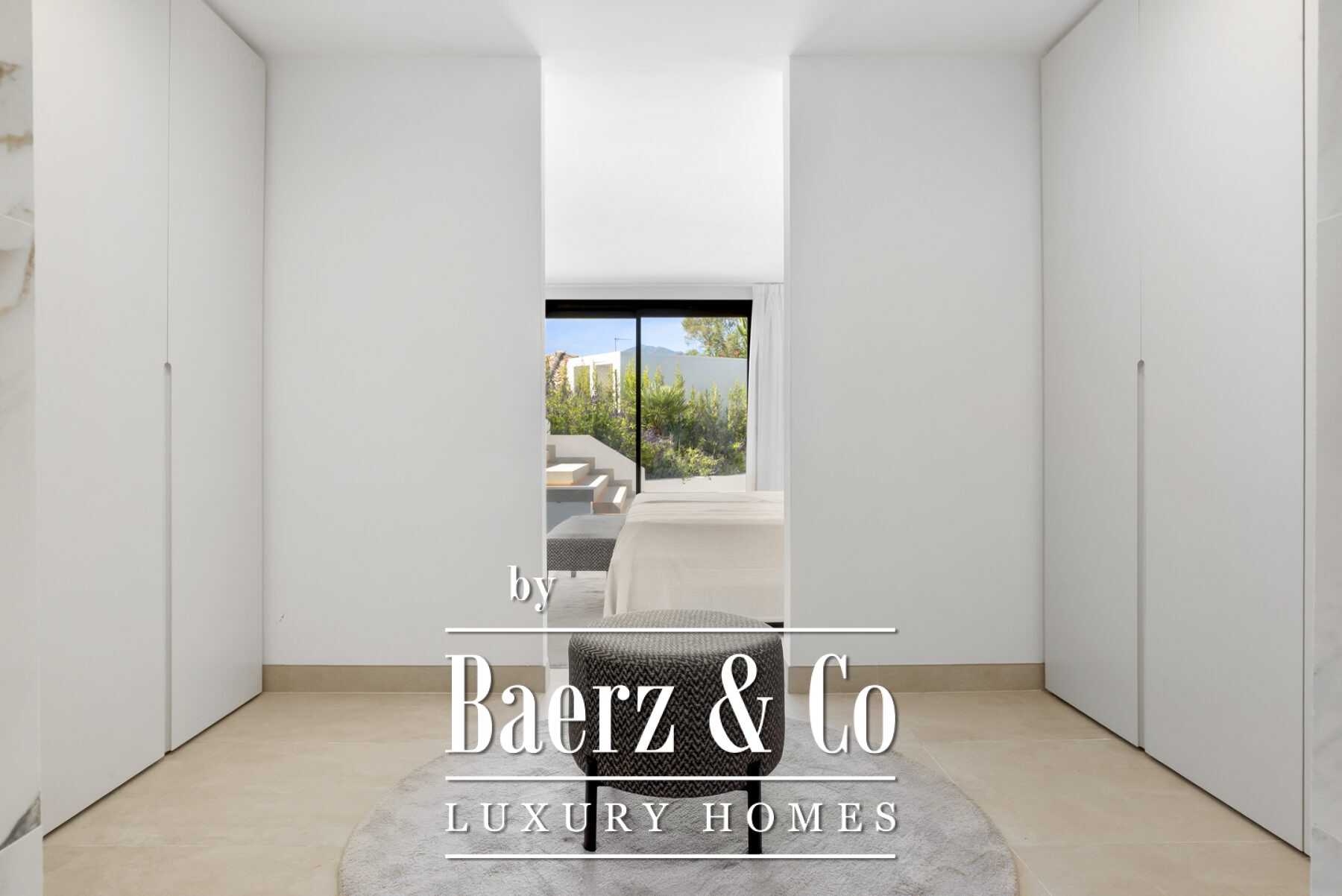 Sul solarium panoramico, le viste sul mare e sui monti invitano a momenti di rilassata contemplazione. Gli armadi a muro includono illuminazione LED, coniugando praticità a una sofisticazione sobria. La villa dispone di un garage per un'auto con punto di ricarica e di un'ulteriore area garage chiusa, capace di ospitare fino a tre veicoli all'interno della proprietà.