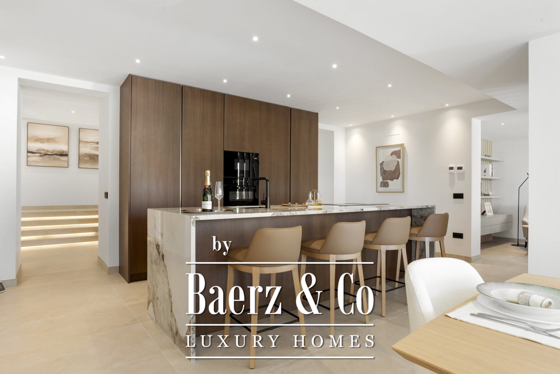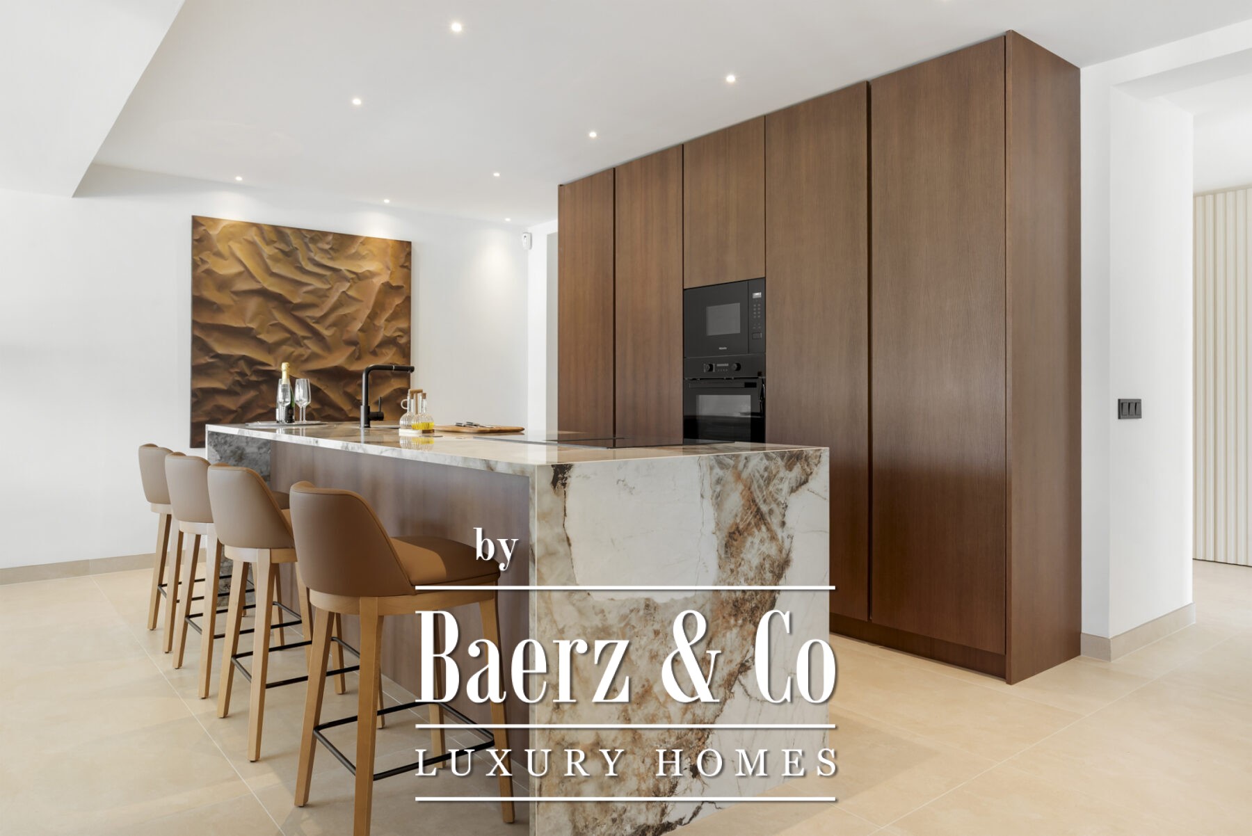 Il livello principale presenta ambienti inondati di luce, con quattro camere da letto ampie e quattro bagni moderni. La cucina open space, rifinita con isola centrale ed elettrodomestici di alto livello, si integra con le grandi zone soggiorno e pranzo, tutte rivolte verso la terrazza panoramica. La luce naturale valorizza ogni ambiente e si estende armoniosamente verso il giardino paesaggistico con piscina privata.