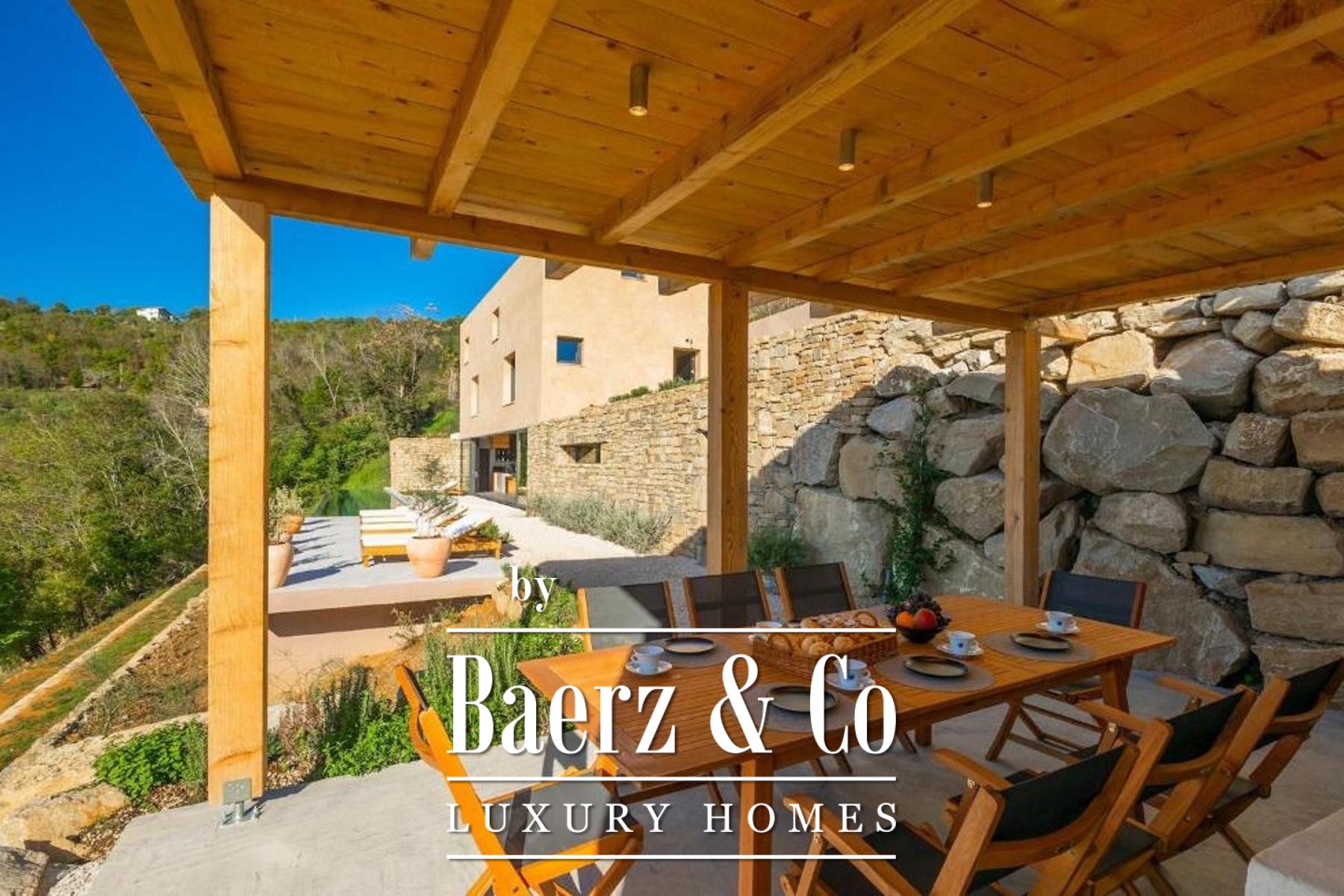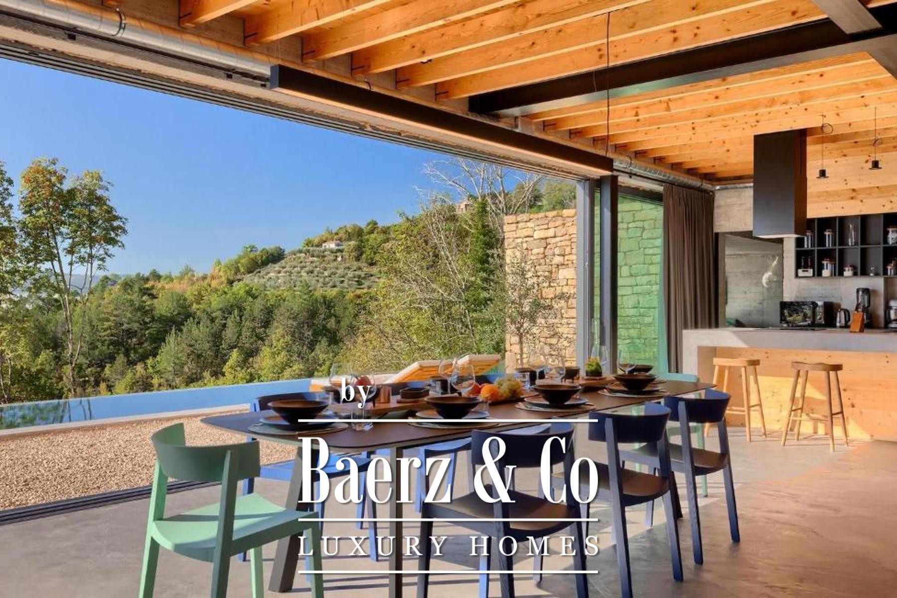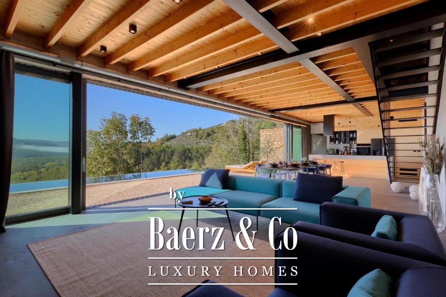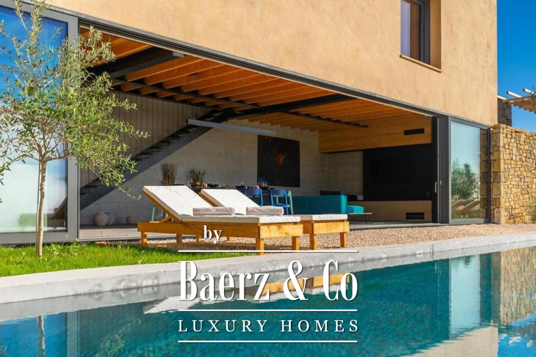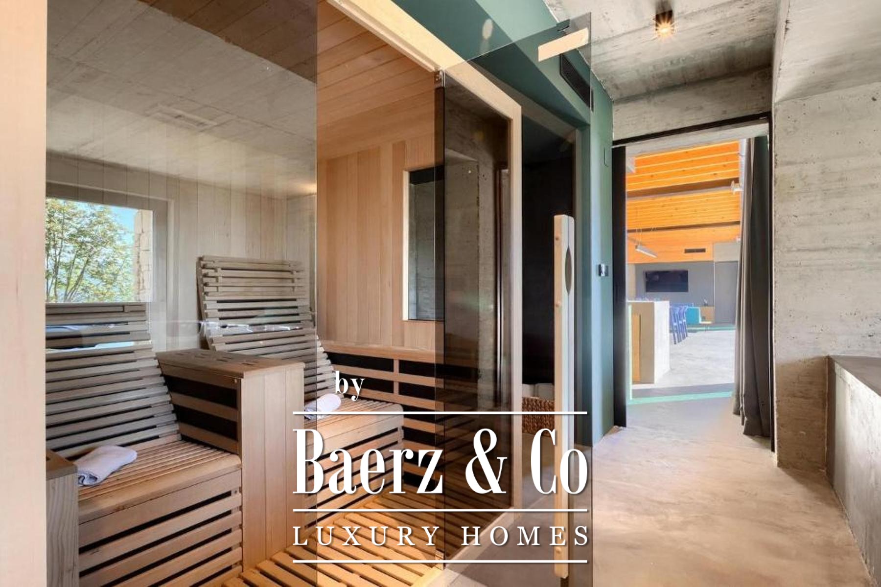L'intento architettonico è evidente in ogni dettaglio, con l'uso di pietra e legno che ancora la residenza all'ambiente circostante. Grandi pareti vetrate accolgono la luce naturale e l'esterno, creando un dialogo costante tra spazi interni ed esterni. Il piano terra open space integra cucina, zona pranzo e soggiorno, aprendosi senza soluzione di continuità su un'ampia terrazza. Qui, una piscina infinity di 20 metri e un'area solarium dominano il paesaggio, affiancate da una zona wellness con vasca idromassaggio, sauna e doccia.