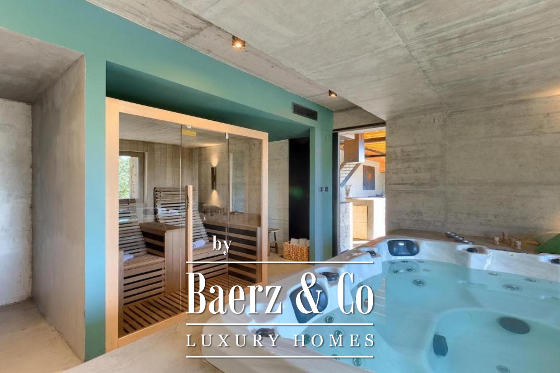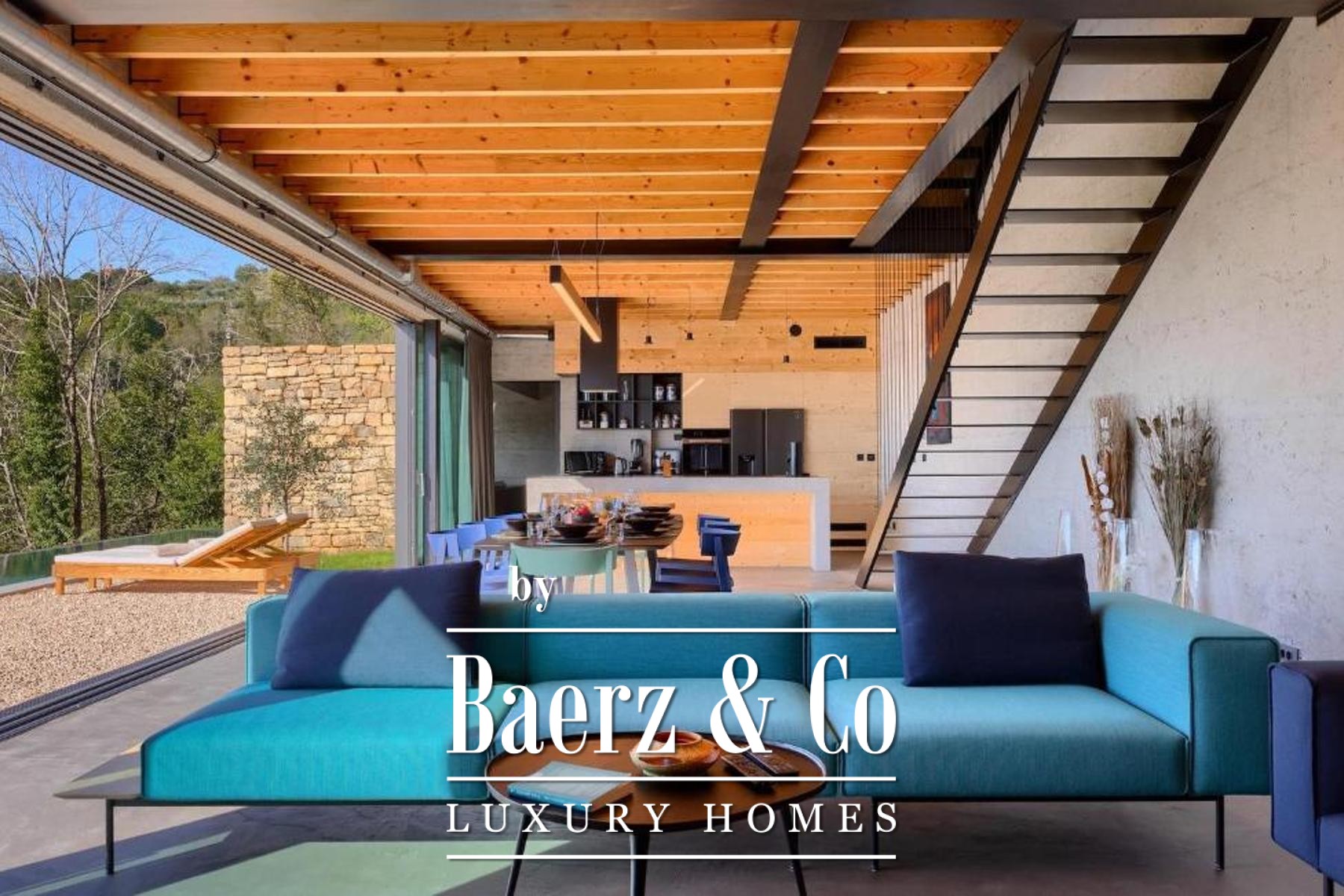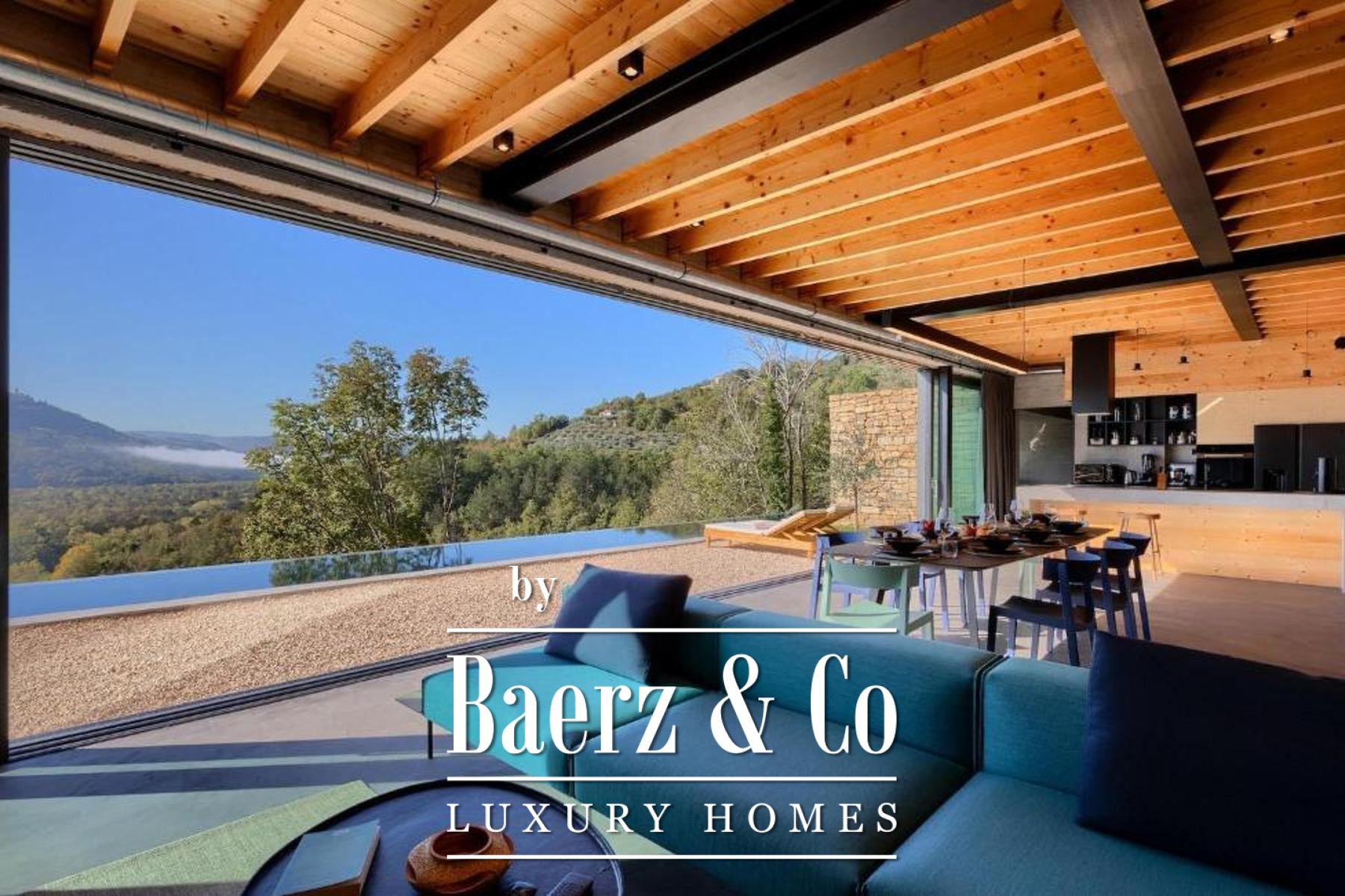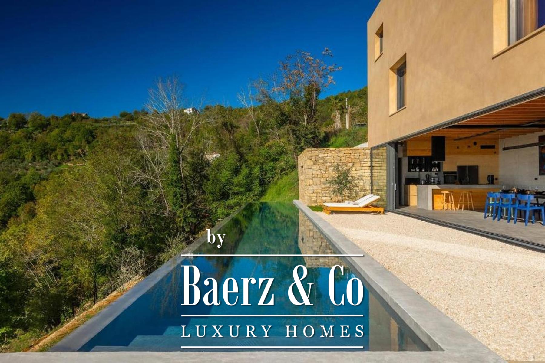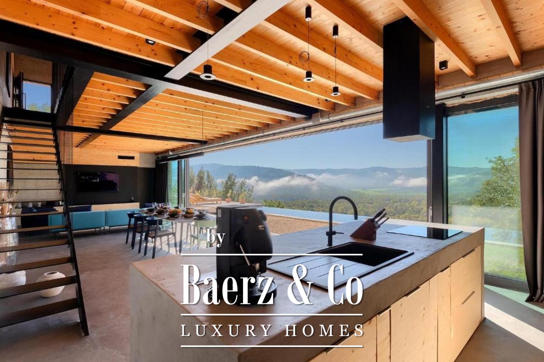 L'intento architettonico è evidente in ogni dettaglio, con l'uso di pietra e legno che ancora la residenza all'ambiente circostante. Grandi pareti vetrate accolgono la luce naturale e l'esterno, creando un dialogo costante tra spazi interni ed esterni. Il piano terra open space integra cucina, zona pranzo e soggiorno, aprendosi senza soluzione di continuità su un'ampia terrazza. Qui, una piscina infinity di 20 metri e un'area solarium dominano il paesaggio, affiancate da una zona wellness con vasca idromassaggio, sauna e doccia.