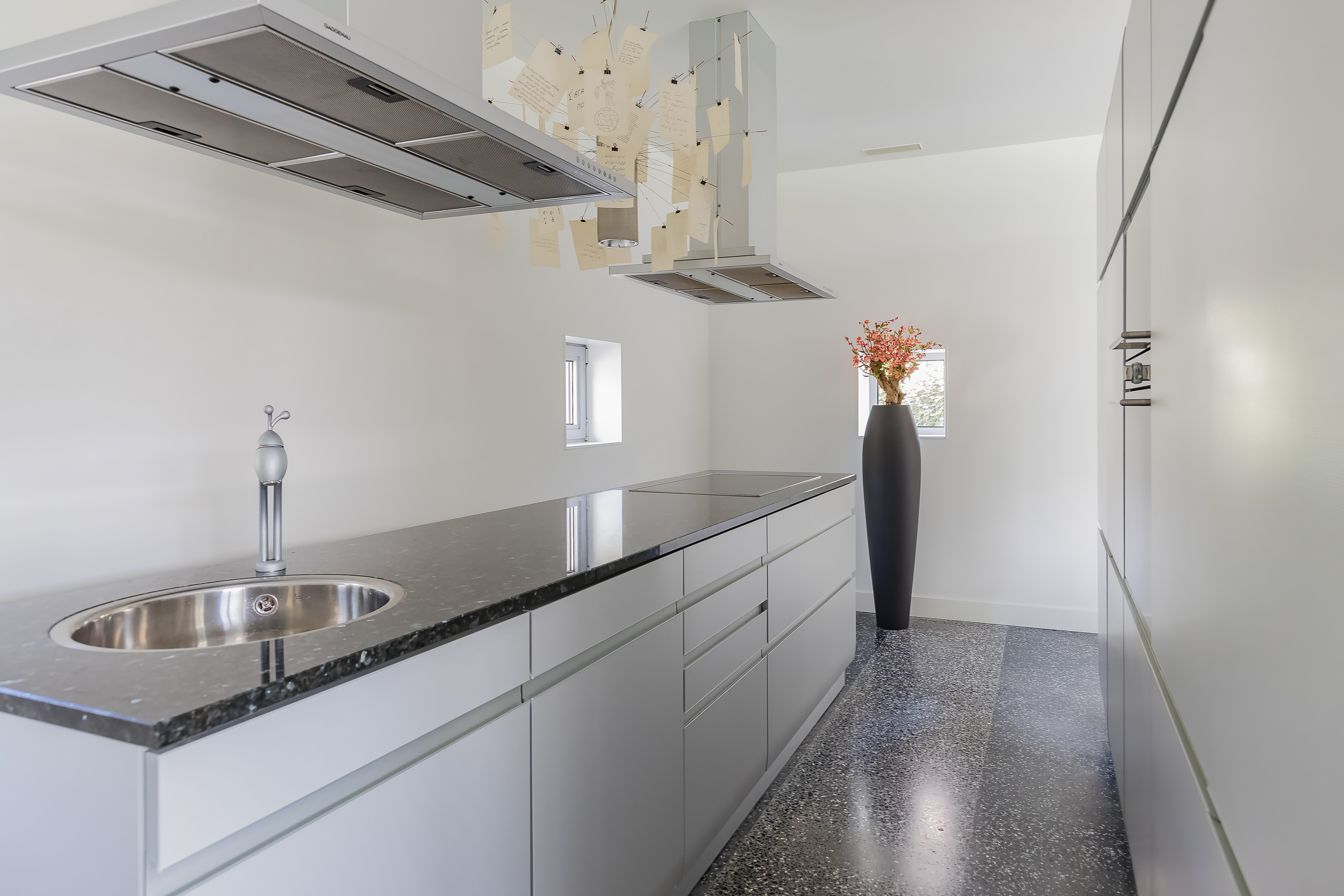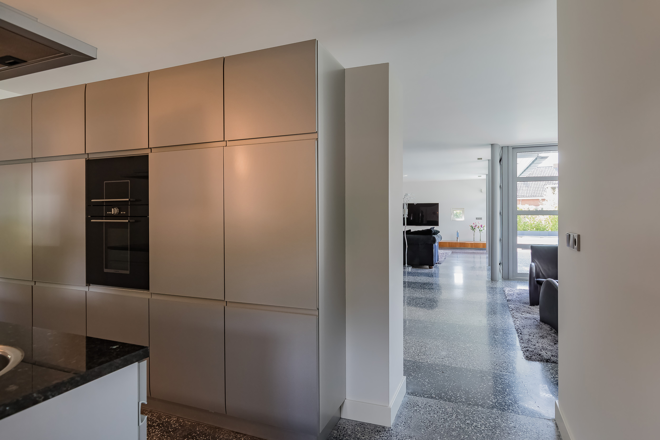 Un’attenta ricerca della simmetria accompagna, dalla suggestiva scala in vetro della luminosa hall d’ingresso, attraverso un soggiorno di ben 18 metri e una zona pranzo ideale per ospitare ampie convivialità. La cucina, caratterizzata da linee essenziali e elettrodomestici di alta gamma, funge da raffinato elemento divisorio nella zona living principale. All’interno, i pavimenti in terrazzo, dotati di riscaldamento a pavimento, si estendono senza soluzione di continuità fino alla terrazza, collegando gli spazi interni a un giardino rivolto a sud-ovest che incornicia la piscina riscaldata e il bordo d’acqua.