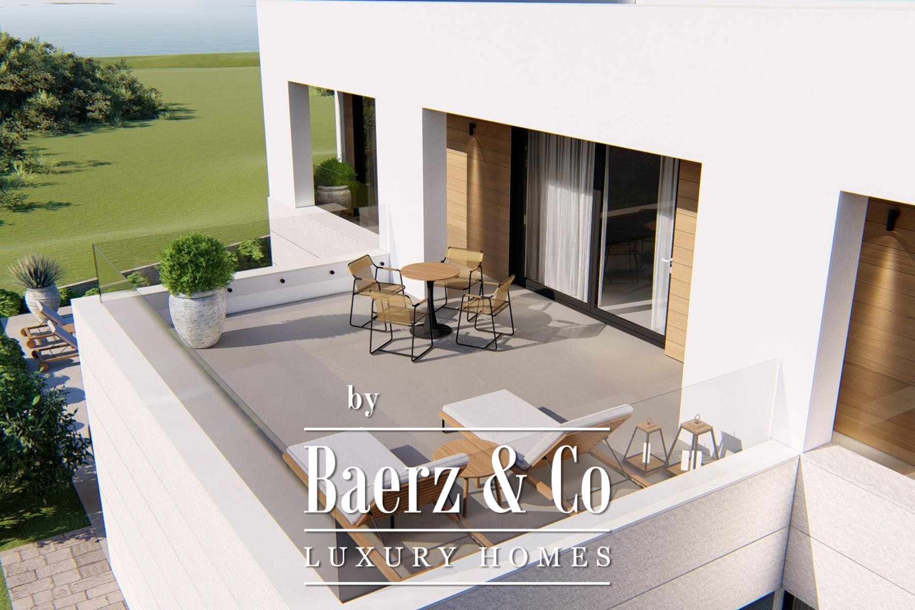 Il livello principale accoglie con un living open space, cucina e zona pranzo, che conducono su una terrazza coperta con barbecue. Ampie vetrate incorniciano la vista mare e valorizzano la luce naturale. Al piano terra si trova una camera da letto con bagno privato, mentre il primo piano ospita altre tre camere da letto ciascuna con bagno en suite ed accesso alla loggia. Il livello superiore si apre su una generosa terrazza, enfatizzando la continuità tra ambienti interni ed esterni.