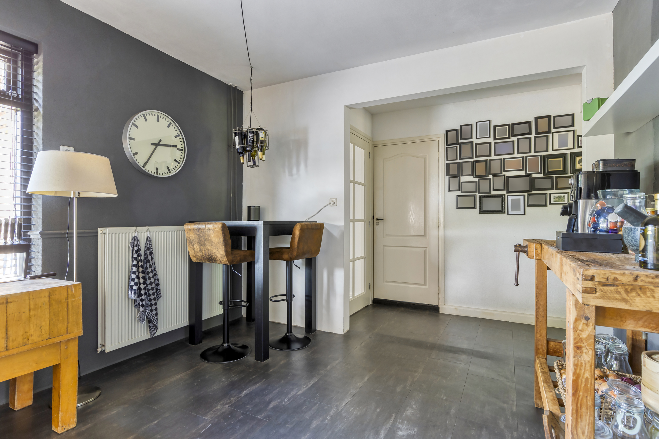 vanuit de tussenhal een trap naar de 1e verdieping, deur naar tuin/terras en schuifdeur naar bijkeuken en vanuit de hal/entree een trap naar de verdieping boven de slaap-/werk-/hobbykamer.