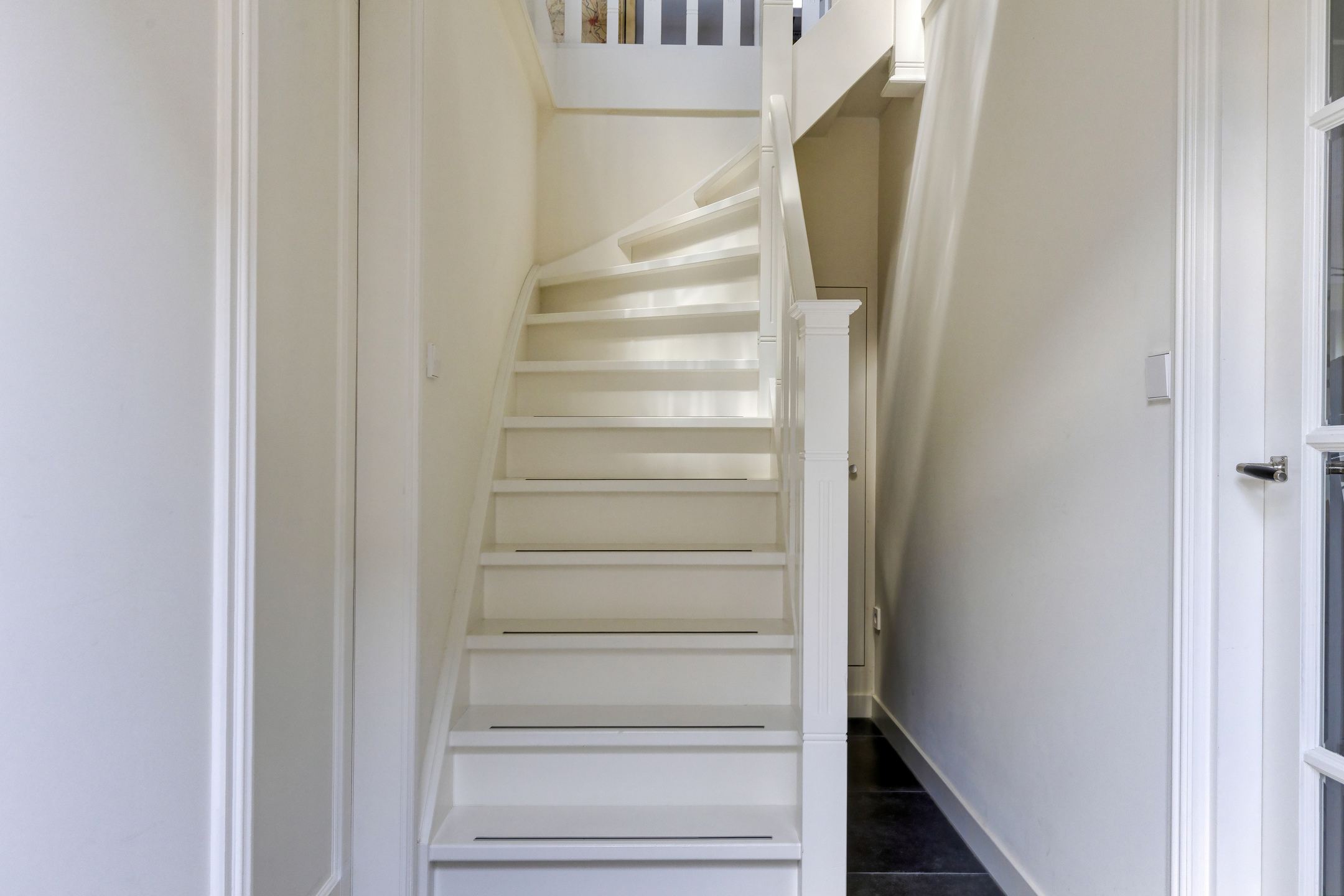 tussenhal, wandafwerking stucwerk, tegelvloer, plafond afgewerkt met stucwerk;