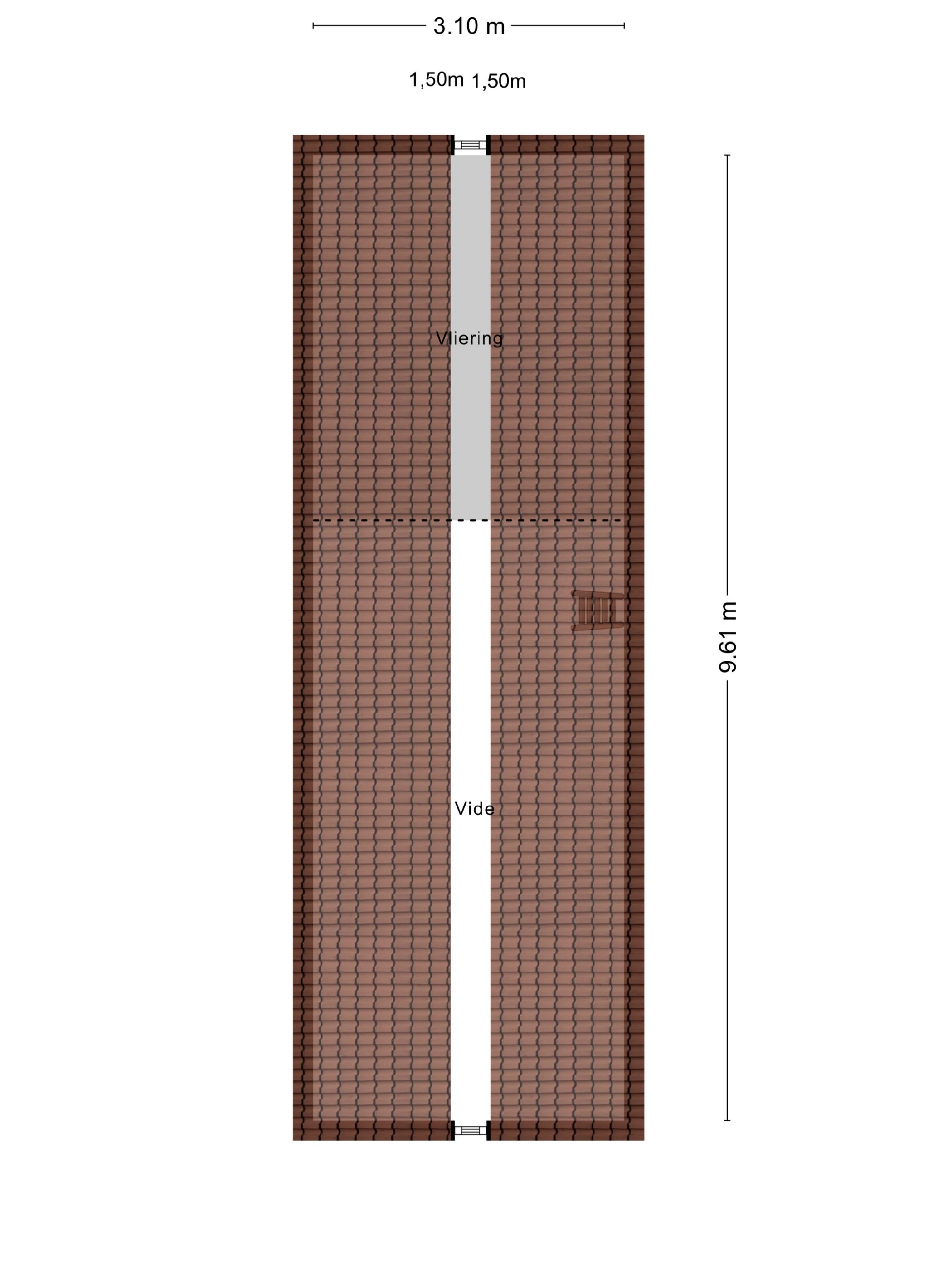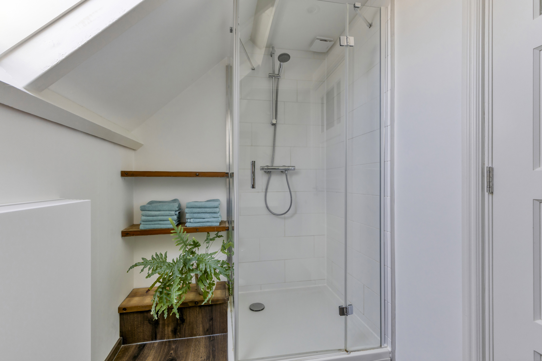Bergzolder, houten vloer, dakplaten in het zicht.