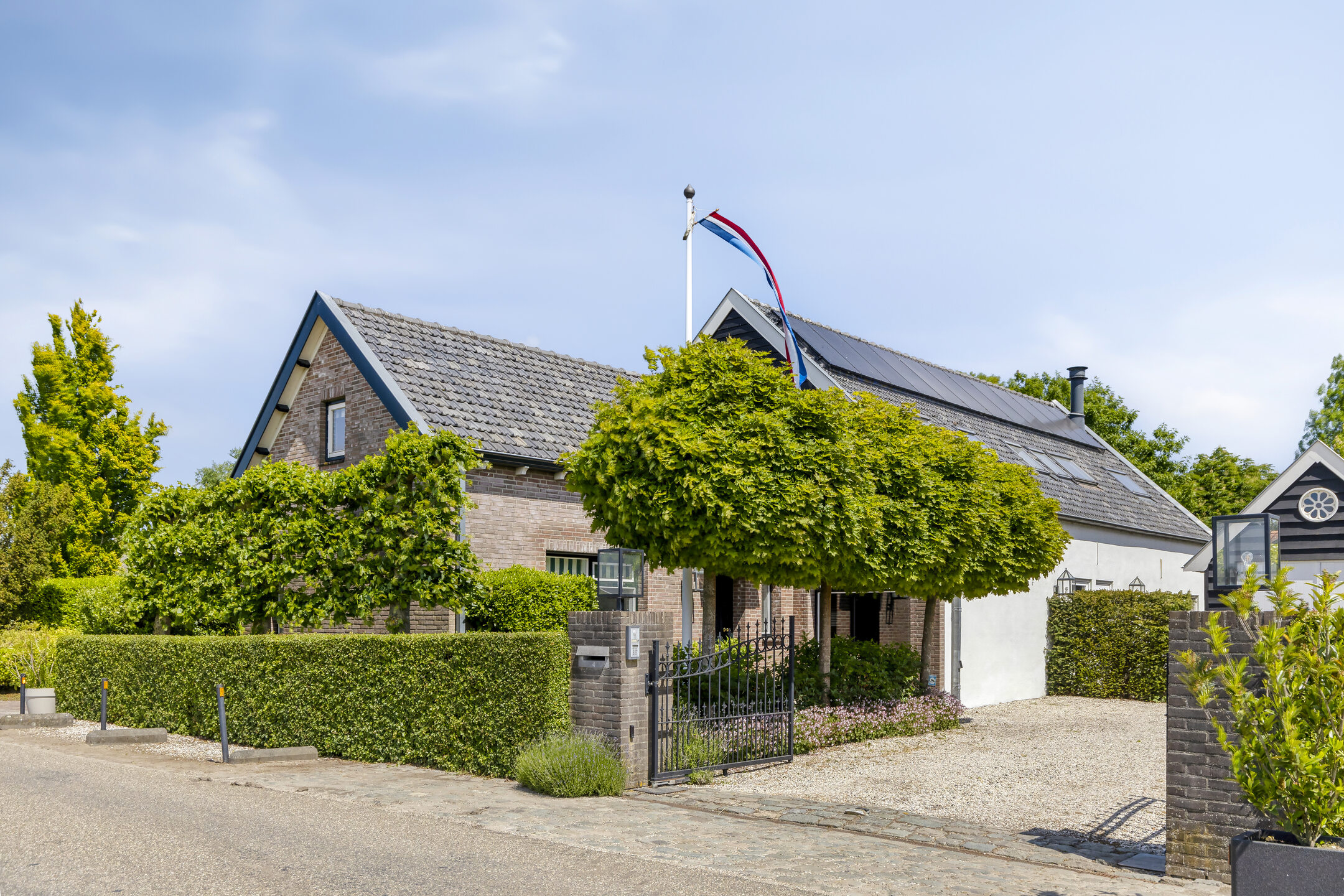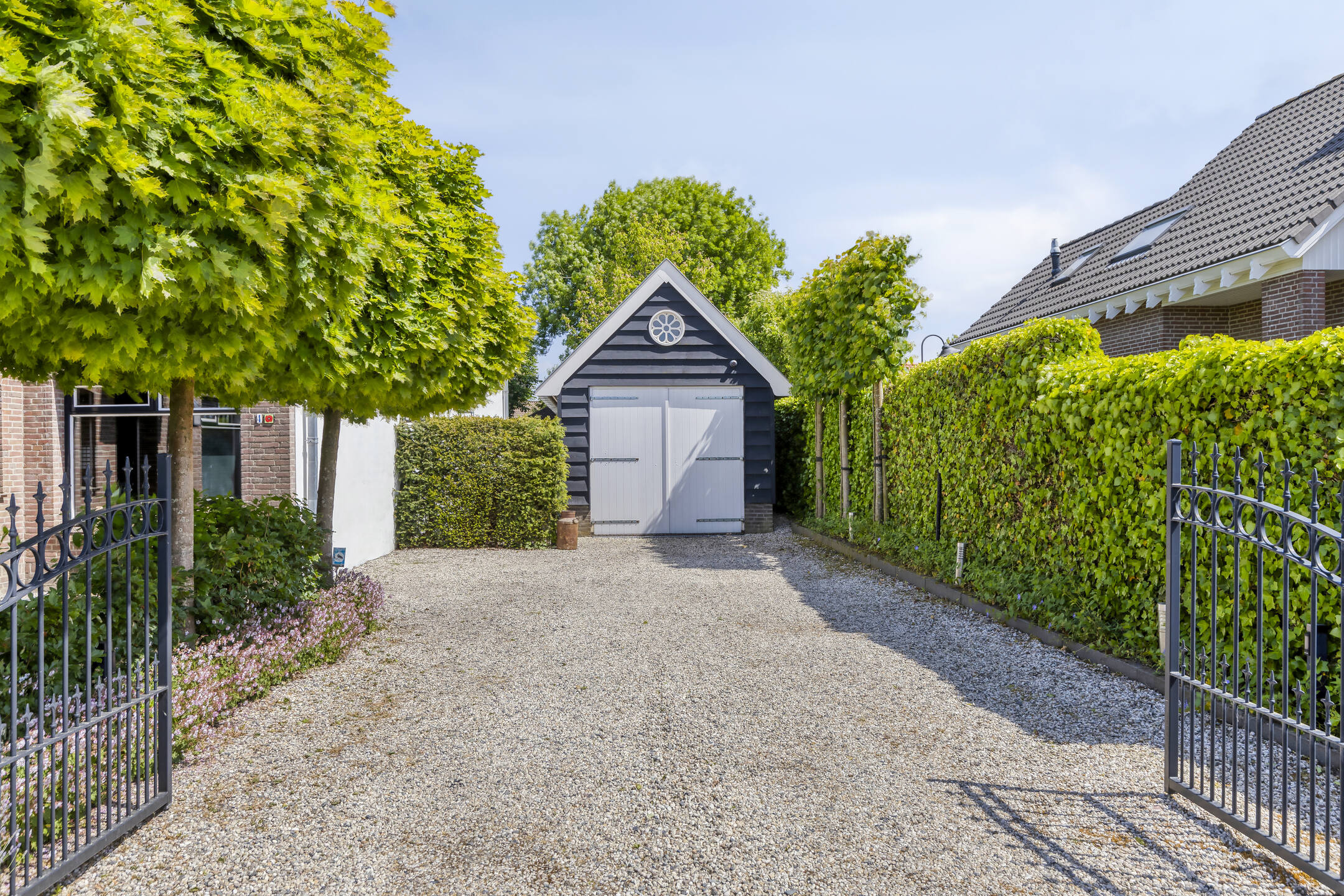 oprit bestraat met grind voorzien van parkeergelegenheid voor meerdere auto’s en vv. een elektrische dubbele poort.