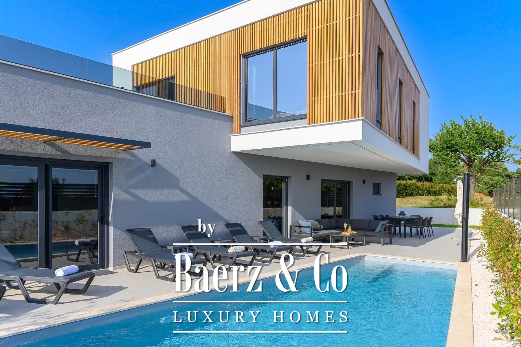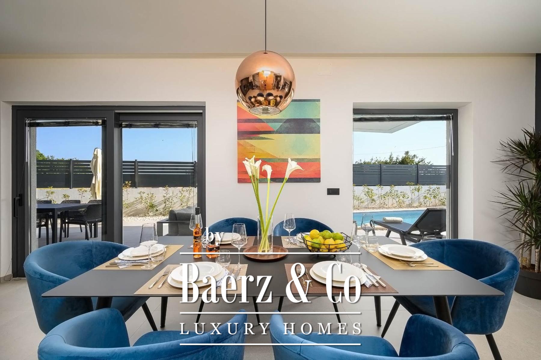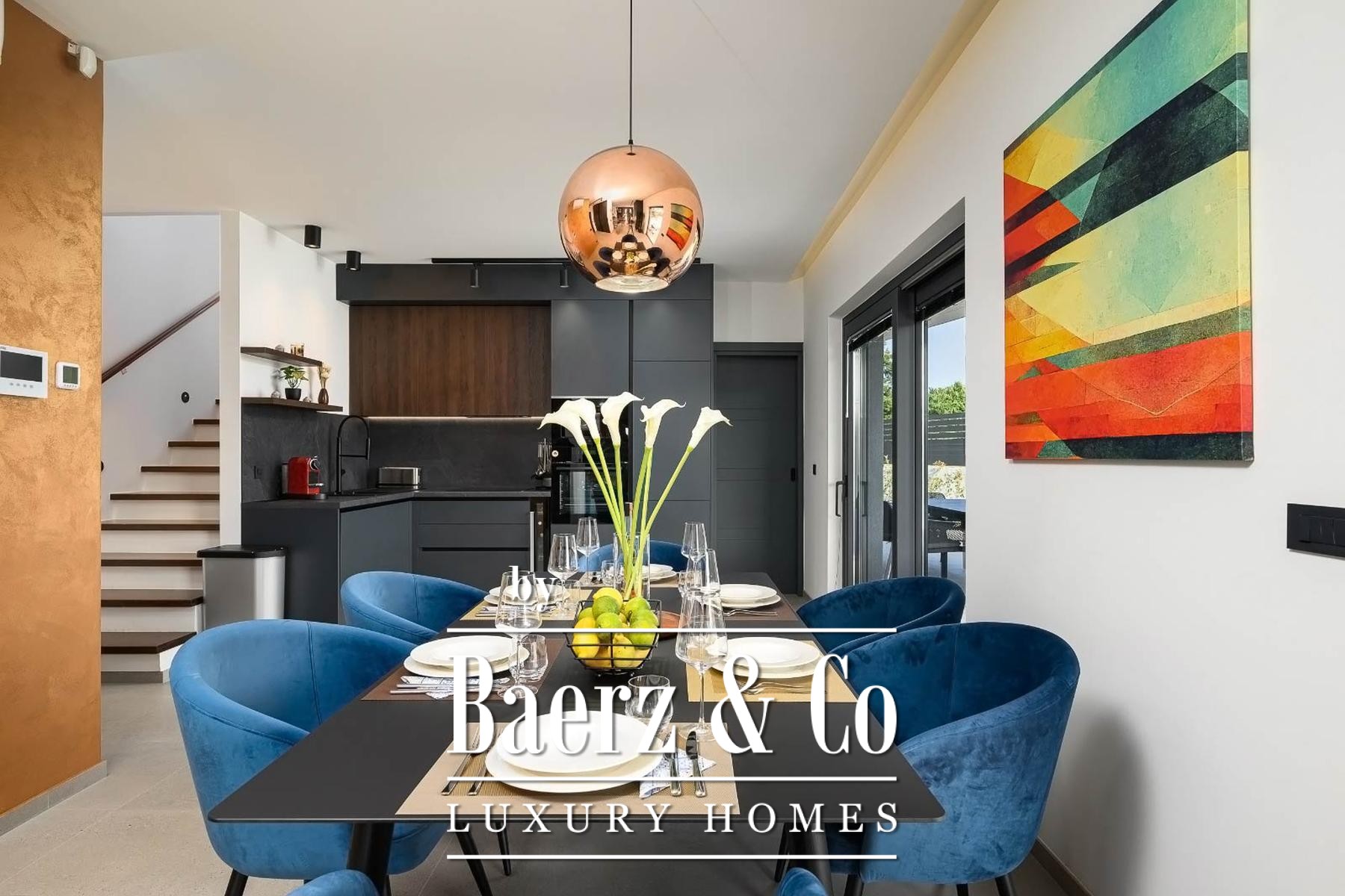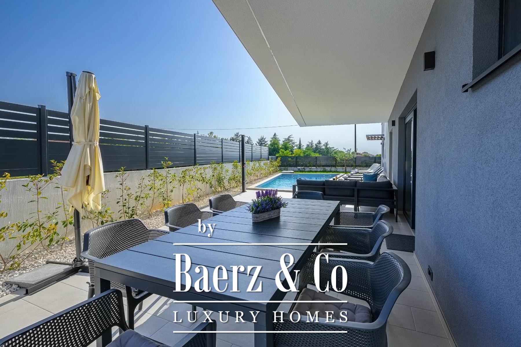 Villa Svetvinčenat si inserisce con discrezione nel cuore del villaggio, offrendo 215 m² di spazi abitativi sapientemente organizzati su un terreno di 460 m². Questa villa in vendita a Svetvinčenat si distingue per il comfort misurato e la perfetta continuità tra interni ed esterni. La zona giorno principale collega cucina a vista, sala da pranzo e salotto, tutti inondati di luce grazie alle pareti di vetro che si aprono su una terrazza riparata, affacciata su una piscina di acqua salata di 32 m². Al piano terra, un bagno per gli ospiti e un ripostiglio completano il ritmo funzionale della casa.