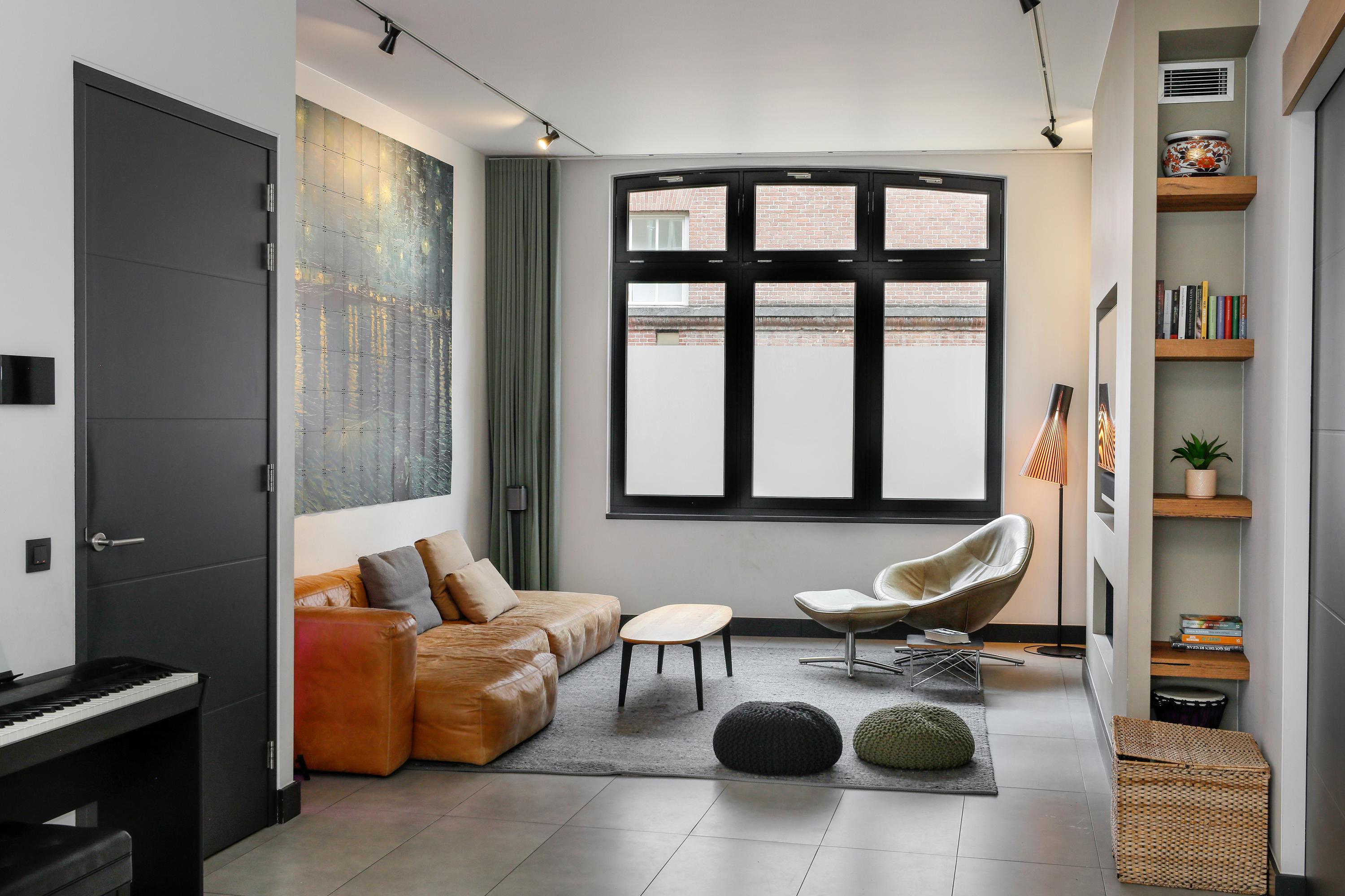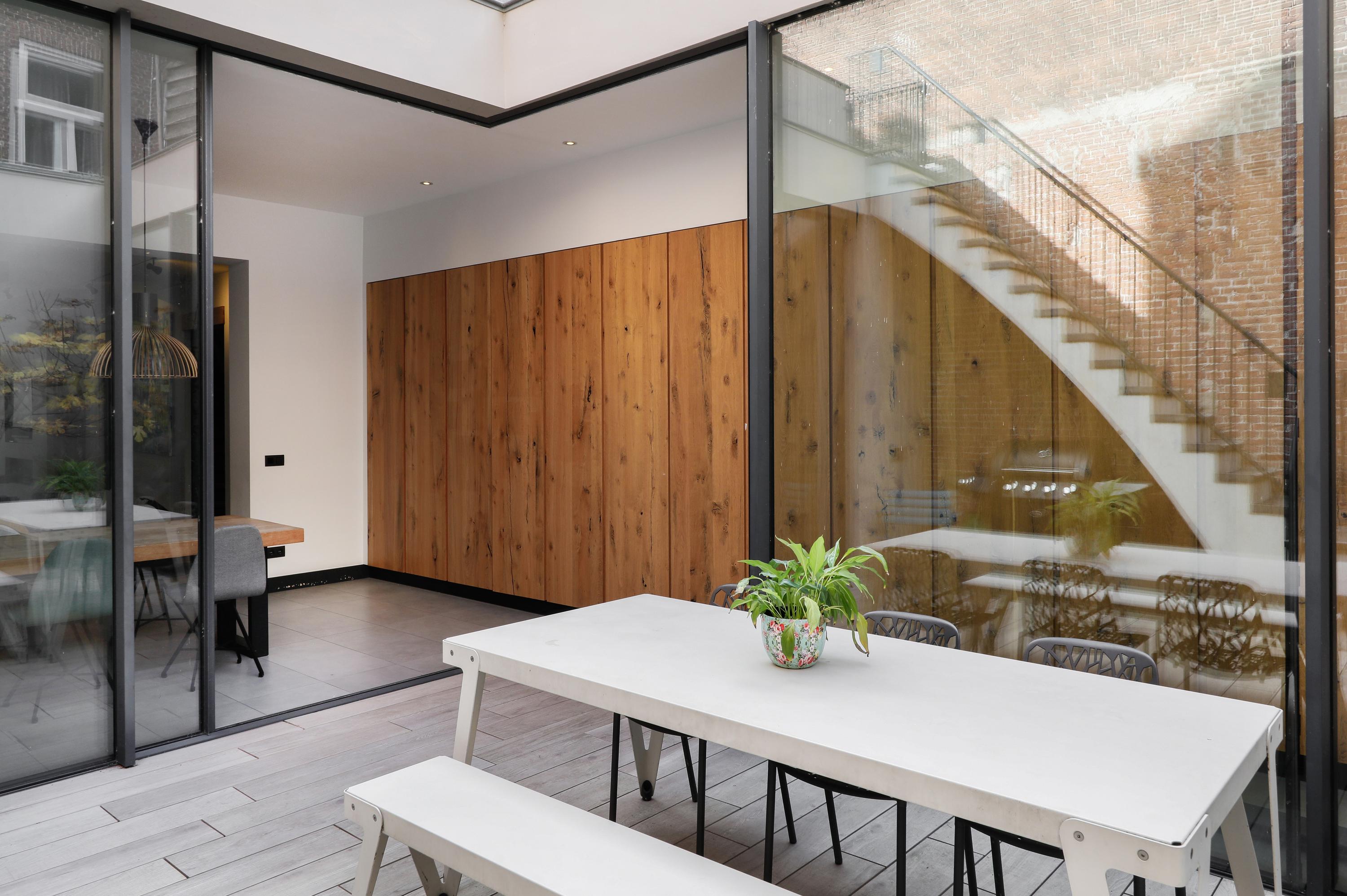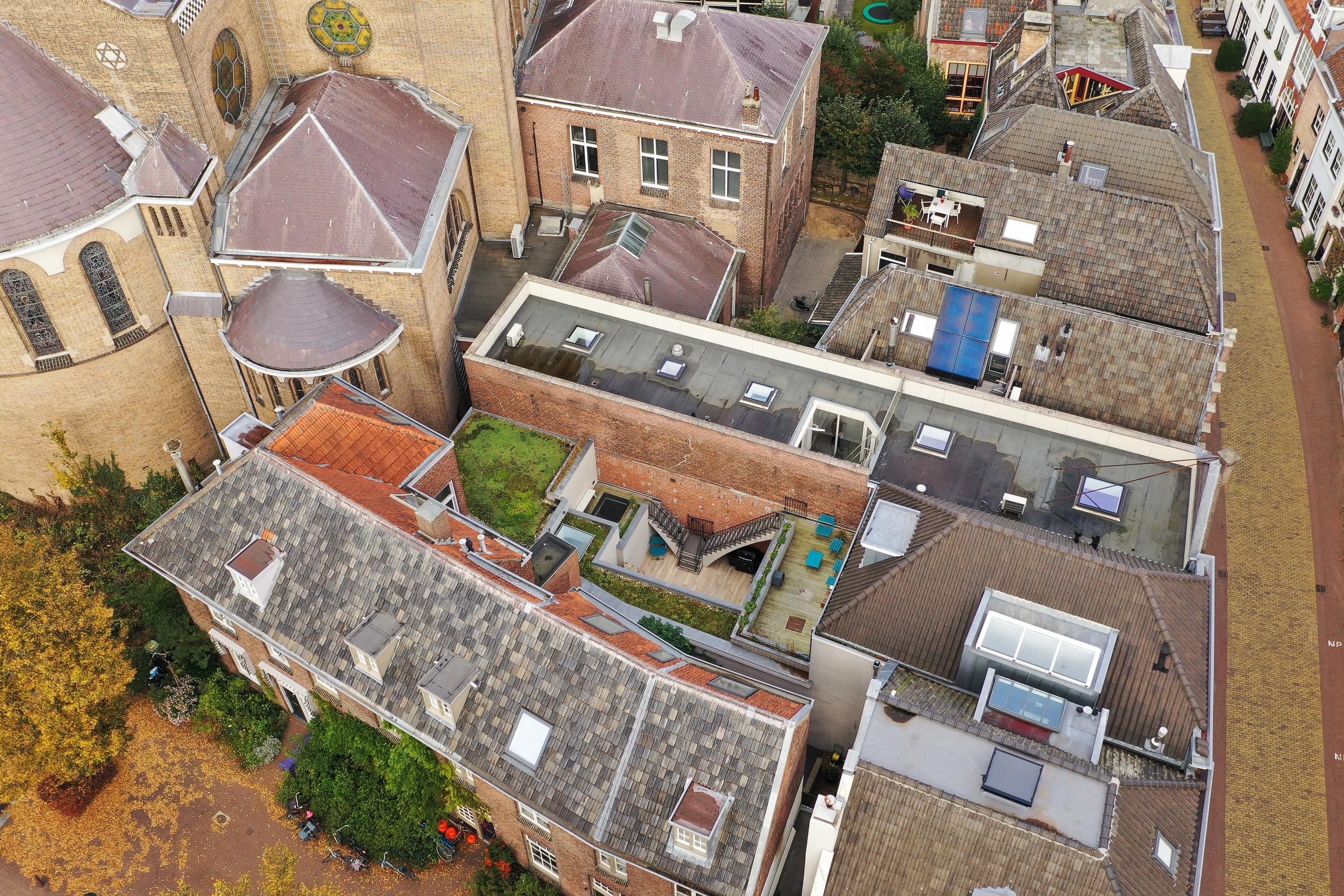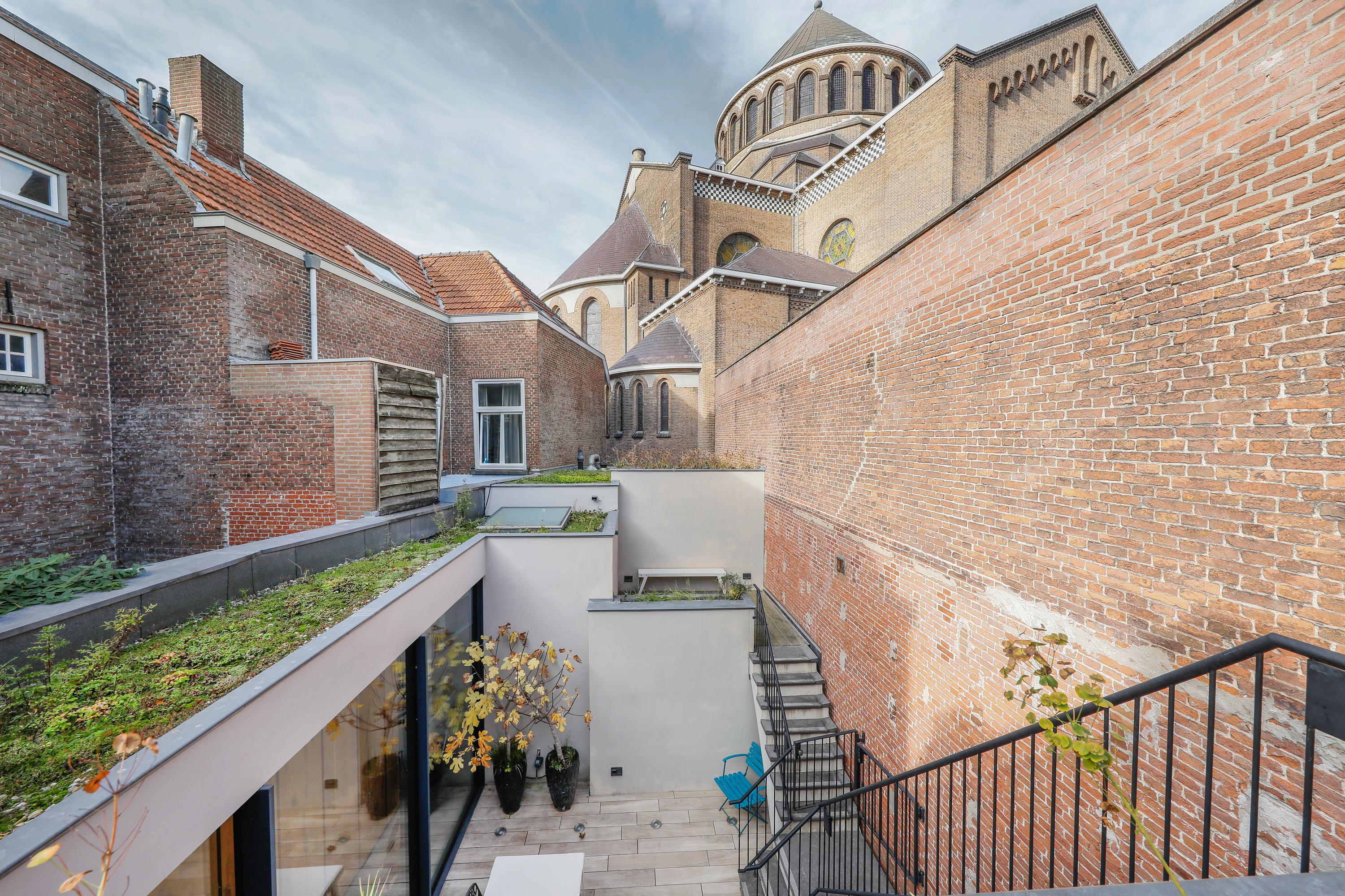 Natuurlijk kent iedereen de voorkant van de St.-Jacobskerk wel. Maar toch zal je bezoek verrast zijn door de kijk die je er van deze kant op hebt. Een verrassende kijk had de architect op dit plan. Door een enorme transparante wand te plaatsen is binnen buiten geworden en vice versa. De wand is vanuit de hoek naar twee kanten weg te schuiven. Het is overdag een heerlijk lichte plek voor een gezellige eettafel en ’s avonds eten met dit bijzondere uitzicht. De lange kastenwand maakt wederom je huis heel praktisch en smaakvol. Ook aan de hoeveelheid buitenruimte biedt deze woning meer dan gebruikelijk in de binnenstad. Naast een flinke binnentuin zijn er twee dakterrasjes. Zelf kiezen dus voor zon, schaduw, boek lezen, samen nog een wijntje of lekker buiten dineren.