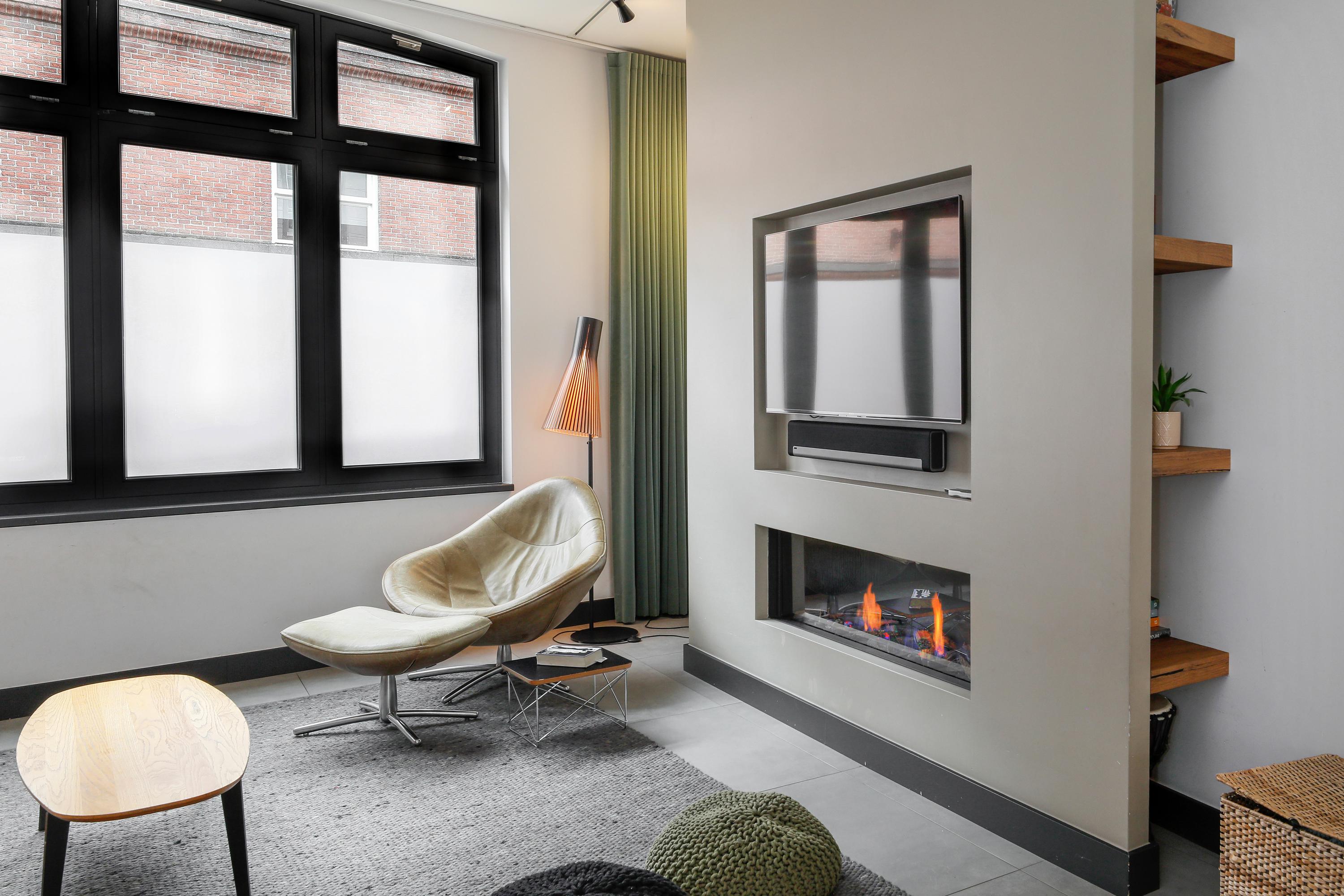 Het is heel fijn als de zithoek aan het einde van de kamer ligt. Hier zoek en vind je ‘s avonds rust zonder dat er veel gelopen wordt. De haard is opgenomen in een voorzetwand, net als de T.V. Achter deze wand is veel op te bergen waarbij de schapjes ruimte geven om wat moois neer te zetten. Er ligt, net als in de rest van de begane grond, een tegelvloer lijkend op een houten vloer. Niet alleen een warme uitstraling, maar door de vloerverwarming ook heel behaaglijk voor blote voetjes. Een groot gebogen venster zorgt voor voldoende daglicht hier.