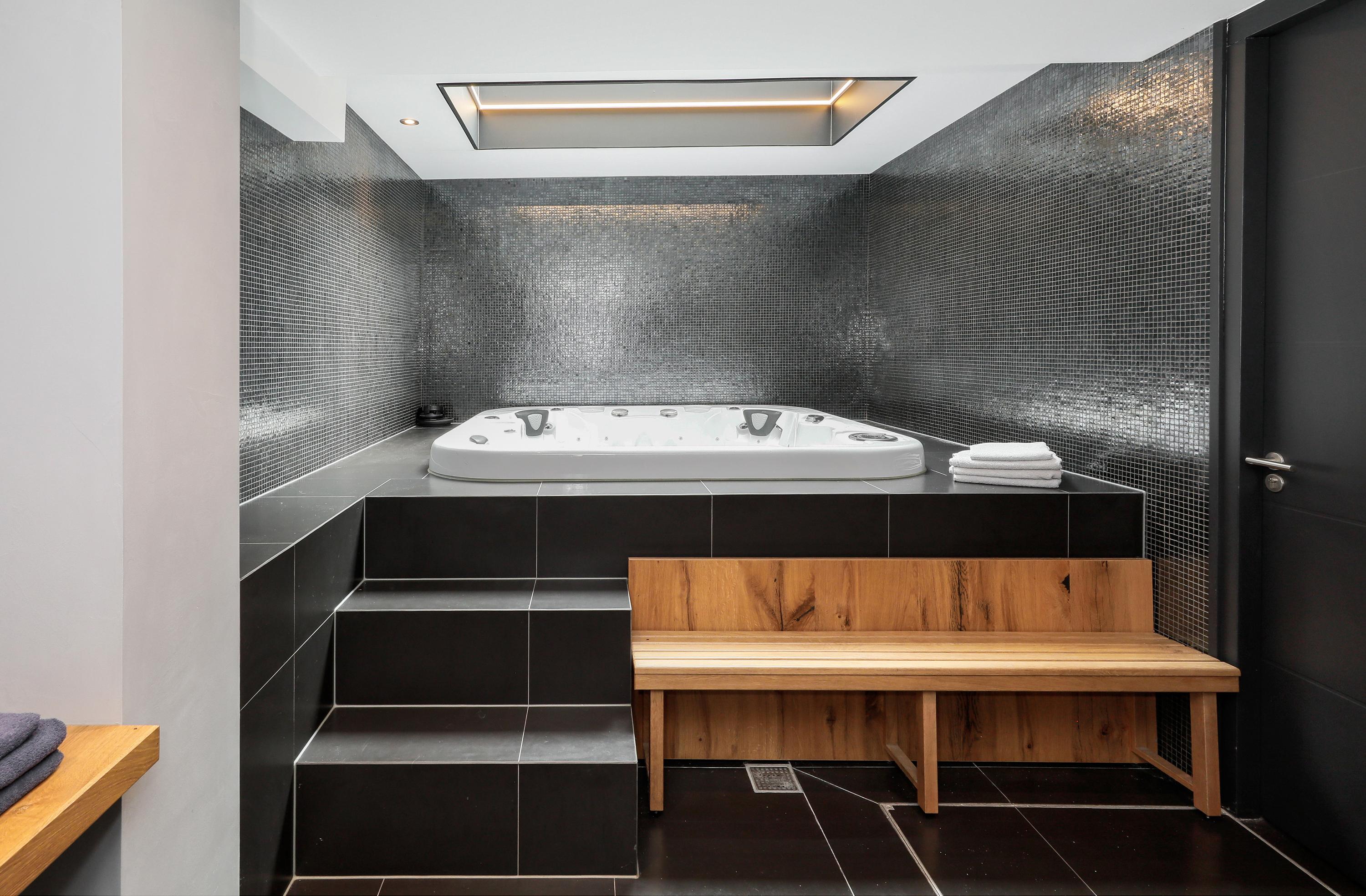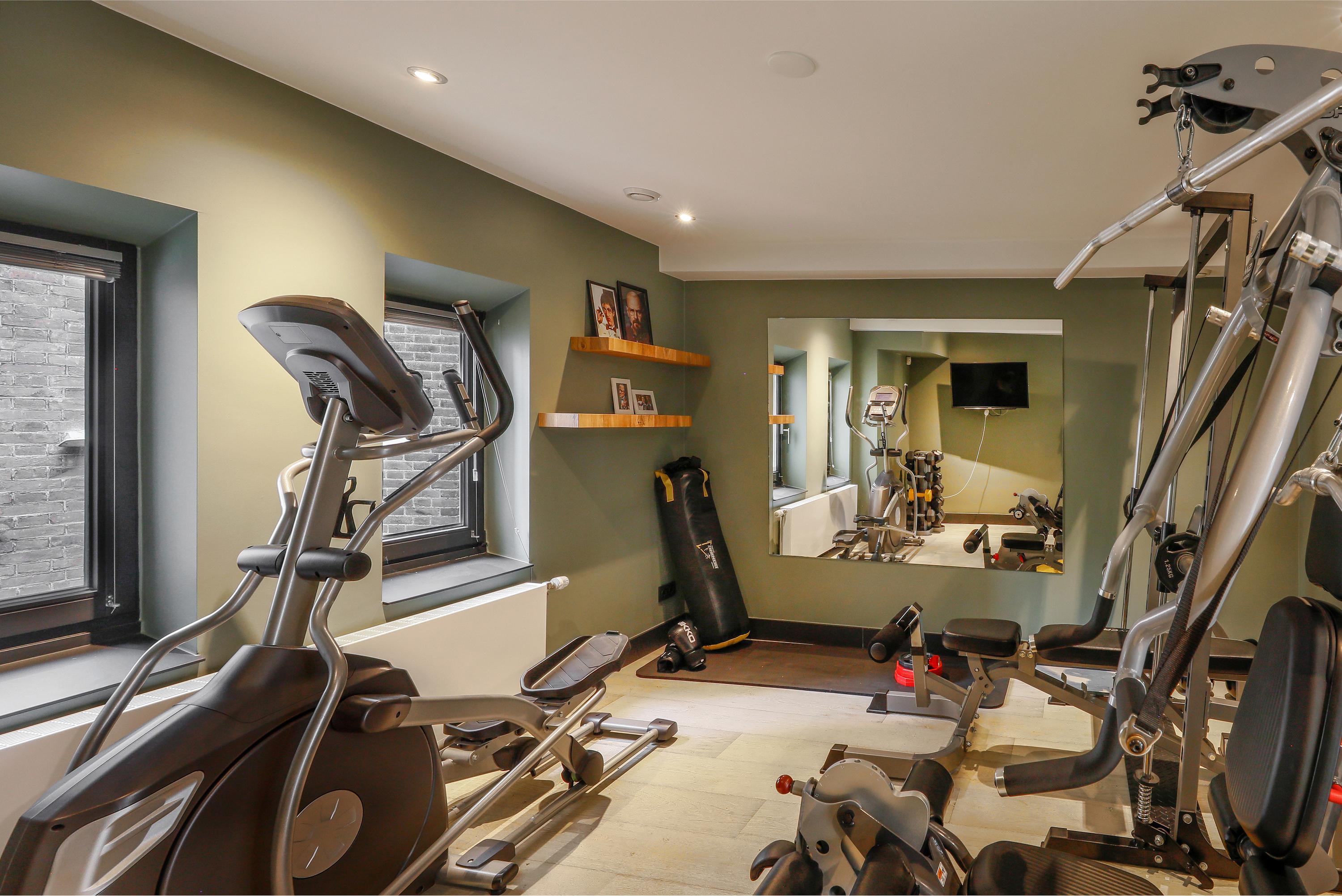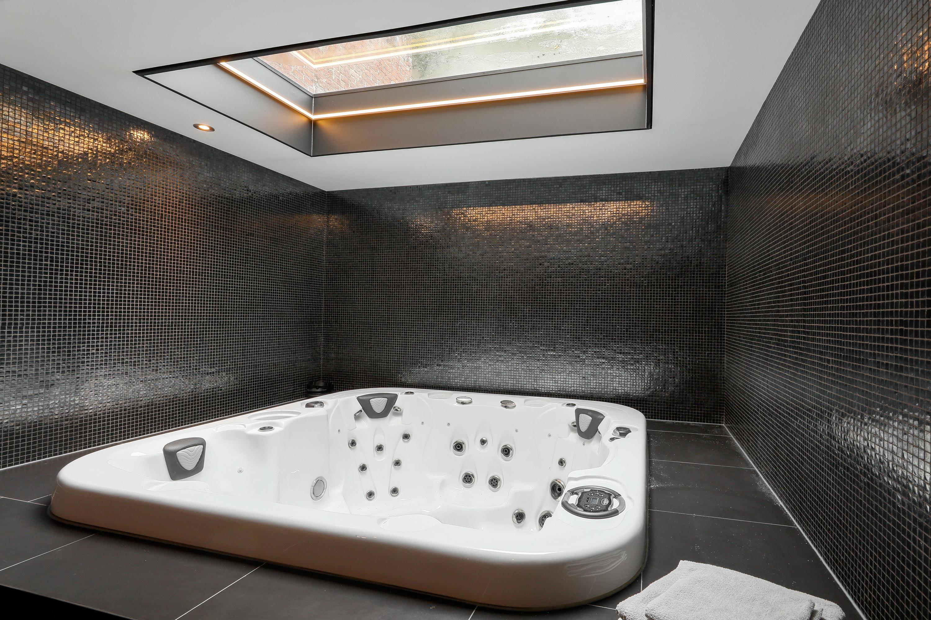 In het achterhuis vind je op de eerste verdieping een flinke kamer die geschikt is voor heel veel. Nu is deze in gebruik als gym. Hieronder liggen de technische ruimte voor de spa. Er is een sauna met, wederom, een grote glazen wand. De kachel staat vrij in de ruimte en er zijn ligbanken voor drie personen. De (dompel)douche vind je achterin. Misschien wel nóg mooier is de jacuzzi voor ca. vier personen. Op een verhoging en onder de sterrenhemel achter een glazen dak is dit toch wel optimaal relaxen, en dat gewoon thuis.