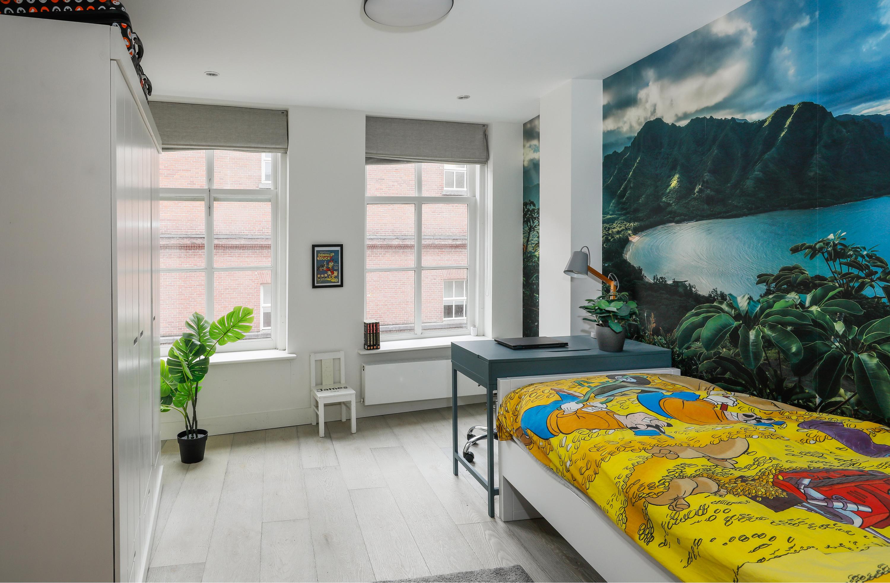 De overige drie slaapkamers zijn voor de kinderen. Twee slaapkamers liggen aan de voorzijde. Beide met twee vensters om lekker wat door weg te turen. De achterkamer ligt aan het dakterras.