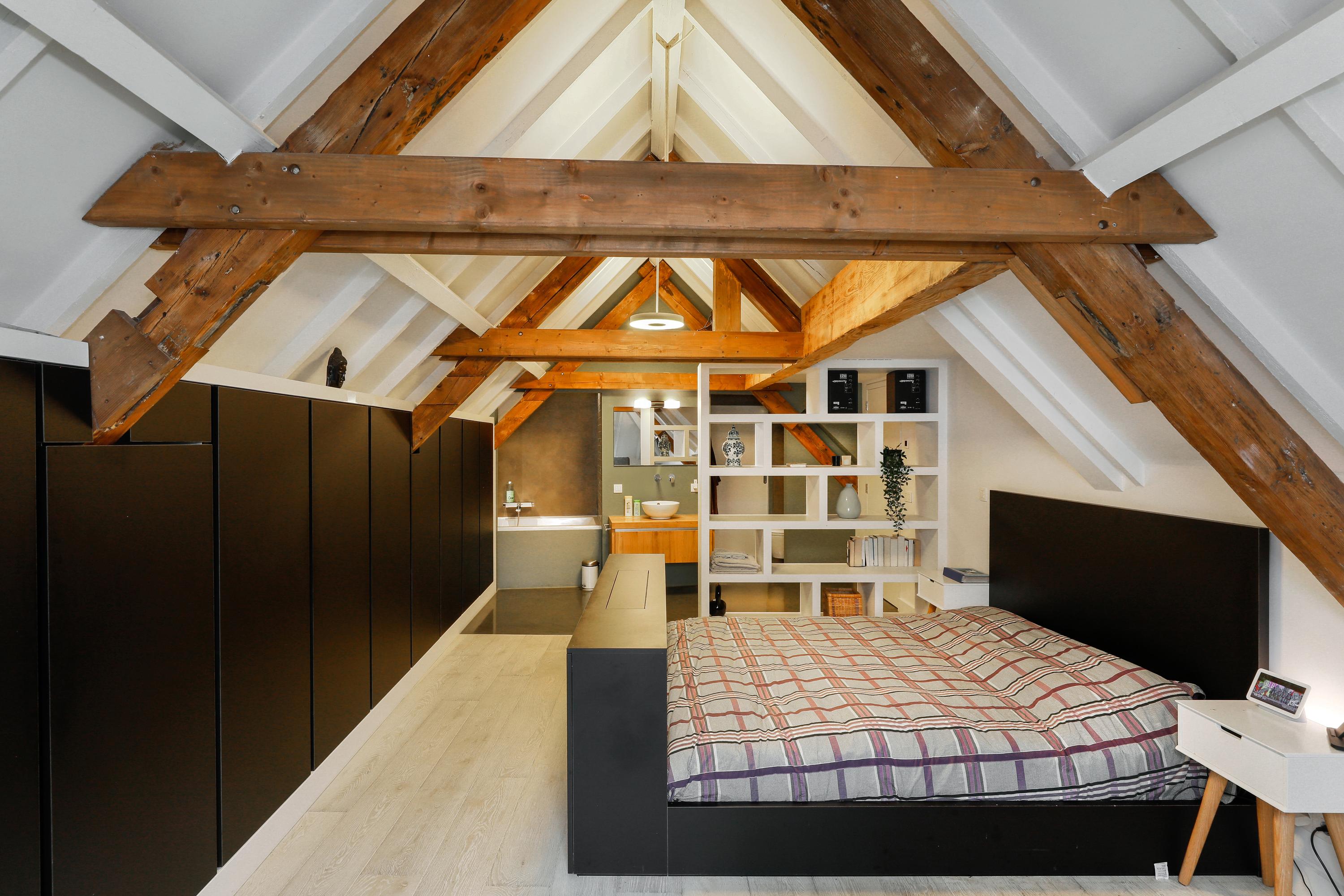 De hele tweede verdieping heb je hier voor jezelf. Onder de sfeervolle spanten is er een grote slaapkamer met badkamer en suite. In de ca 8 meter lange kamer is ruimte voor een bed, een zitje bij de dakkapel en een lange vaste kast onder de schuine kant. Ook hier ligt dezelfde lamelparketvloer als op de eerste etage. Omdat de badkamer exclusief voor deze kamer is, kon de wastafel op een kopse kant geplaatst worden. Het bad is slim in de schuine kant geplaatst en het toilet en de douche vind je aan de andere kant van de wastafel. Achter deze badkamer is een verrassende berging voor je zomer-/wintergarderobe.