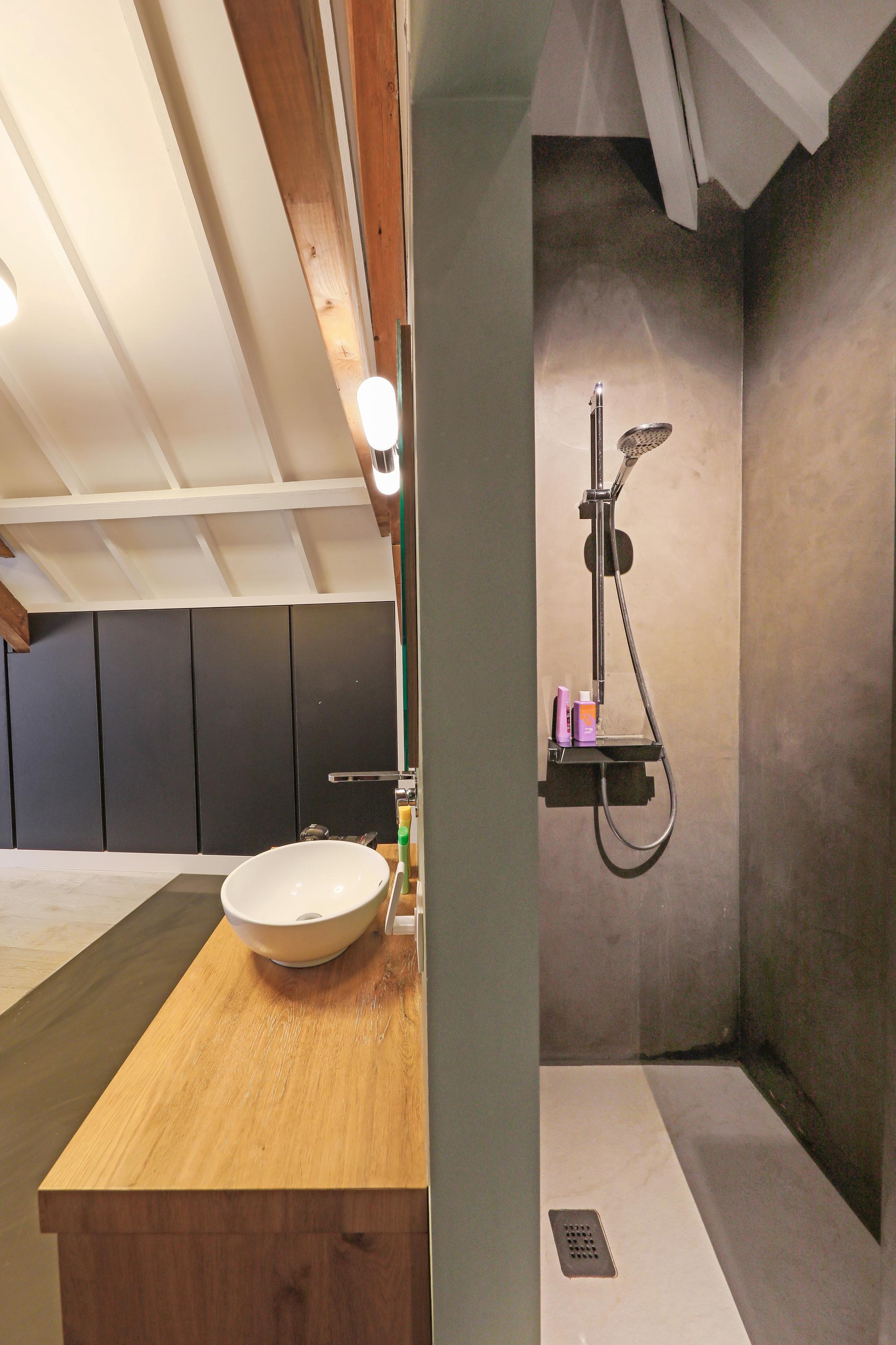 Deze eerste badkamer is voor de kinderen. Natuurlijk is hier alles net zo sfeervol afgewerkt als de rest van het huis. Waskommen óp het blad, een rustige, maar natuurlijke muurtegel óm het bad en een fijne grote inloopdouche. Normaalgesproken is dit natuurlijk de hoofdbadkamer. Maar die komt nog. Het toilet is apart bereikbaar. Achter dit toilet vind je nog een technische ruimte voor de tweede cv-ketel.