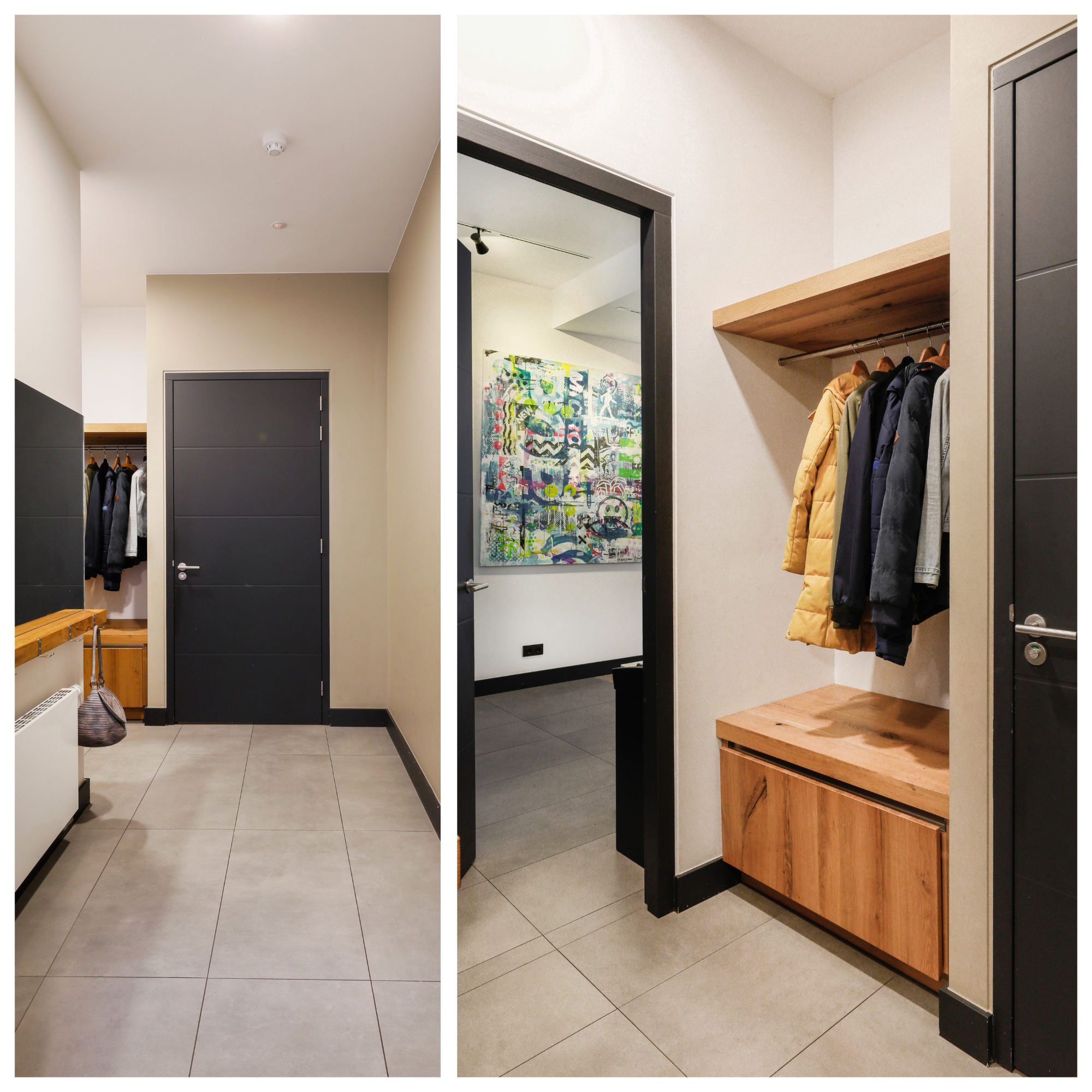 Ooit waren dit een boven- en benedenwoning. Door de samenvoeging kon er een trap verwijderd worden. De huidige trap is mooi weggewerkt achter een schuifdeur. Aan de trapleuning herkennen wij deze architect. Maar ook in het lijnenspel bij deze trap en de lichtlijn tussen muur en het schuin vlak. Op de ruime overloop zijn de was-apparaten in een kast weggewerkt.