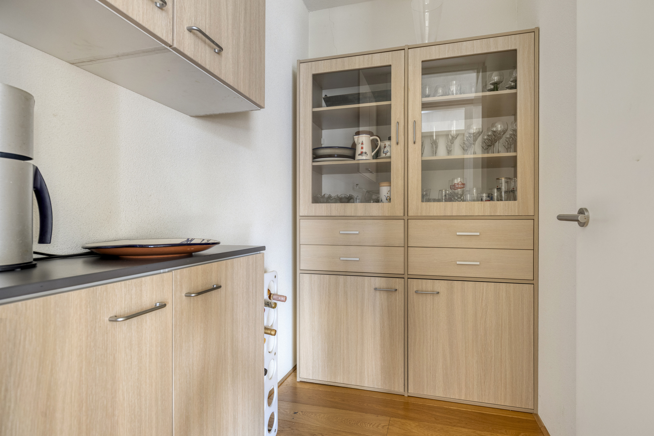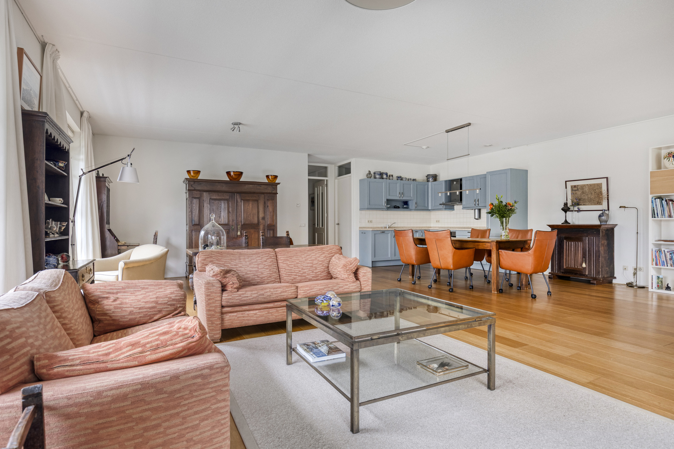 Vanuit de hal bereikt u de royale woonkamer met open keuken en toegang tot de praktische bijkeuken. De woonkamer is bijzonder ruim opgezet en biedt meer dan voldoende plaats voor meerdere zithoeken én een grote eettafel. De open keuken is netjes afgewerkt en voorzien van hoogwaardige Miele-inbouwapparatuur, waaronder een 4-pits inductiekookplaat, koelkast met vriesvak, combimagnetron en vaatwasser.