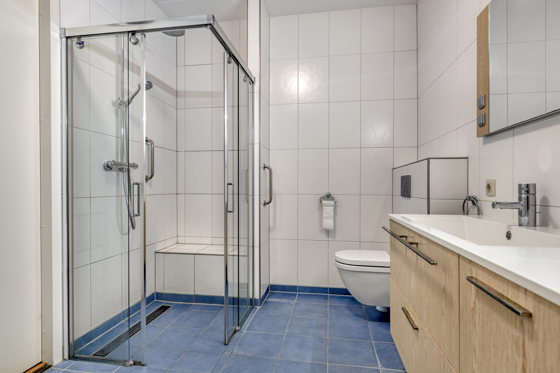Naast de technische ruimte ligt de ruime badkamer, uitgevoerd met een ligbad, inloopdouche, wastafel met meubel en een tweede toilet. De badkamer is voorzien van een antisliplaag op de tegelvloer, wat extra veiligheid biedt.