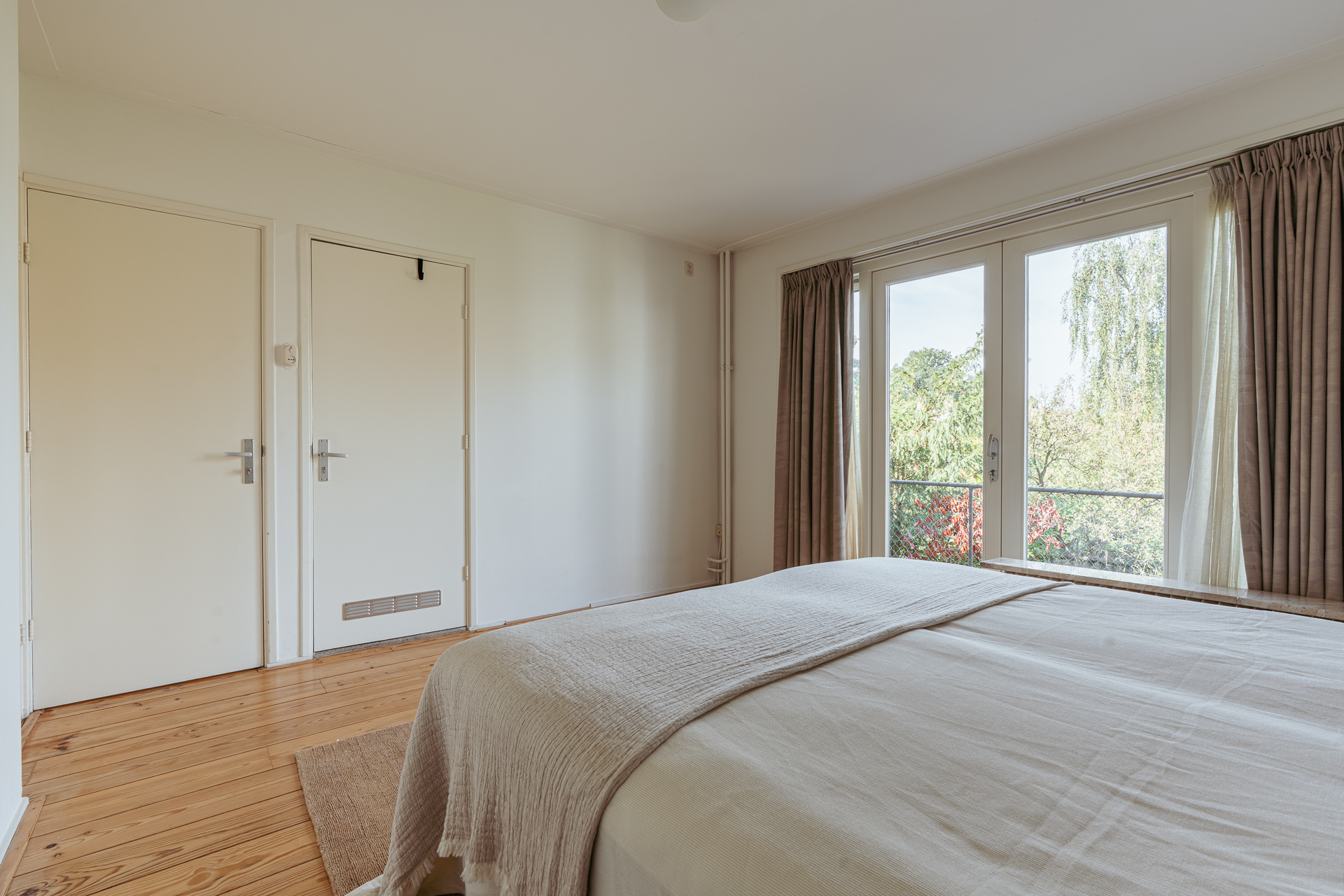 Overloop. Riante masterbedroom aan de achterzijde met vaste kast en openslaande deuren naar het balkon. Tweede slaapkamer aan de voorzijde. Badkamer met douche, wastafel en toilet. Ruime derde slaapkamer met vaste kast en balkon gelegen aan de voorzijde. Op de gehele eerste verdieping bevindt zich een houten vloer.
