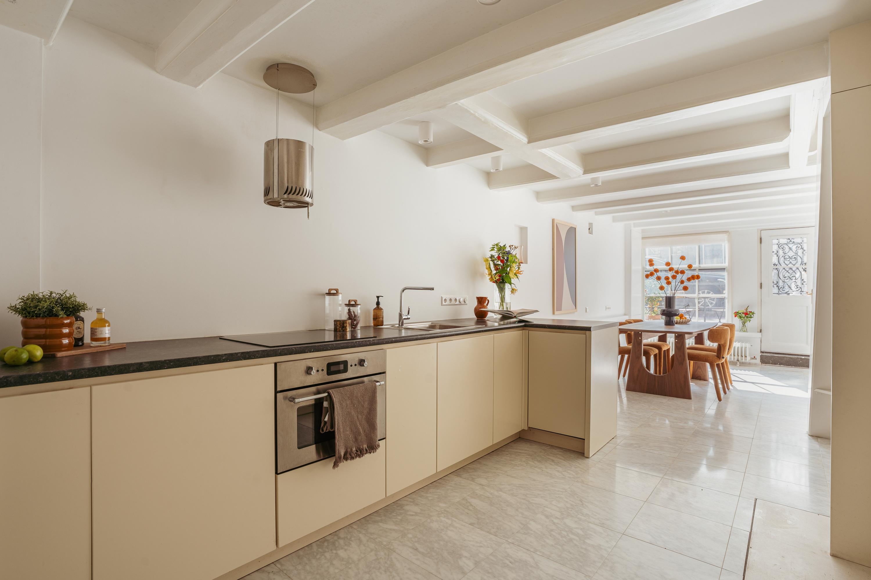 Via de eigen voordeur betreed je de gezellige woonkeuken op de begane grond. Deze verdieping is praktisch én sfeervol ingedeeld, met aan de voorzijde een royale zithoek en aan de achterzijde de keuken. De keuken is voorzien van diverse inbouwapparatuur en biedt opvallend veel kastruimte aan beide zijden. Achterin bevindt zich een gastentoilet. Voor het huis is een charmant zitje gecreëerd, waar je de hele dag kunt genieten van de zon en het levendige uitzicht op de gracht.