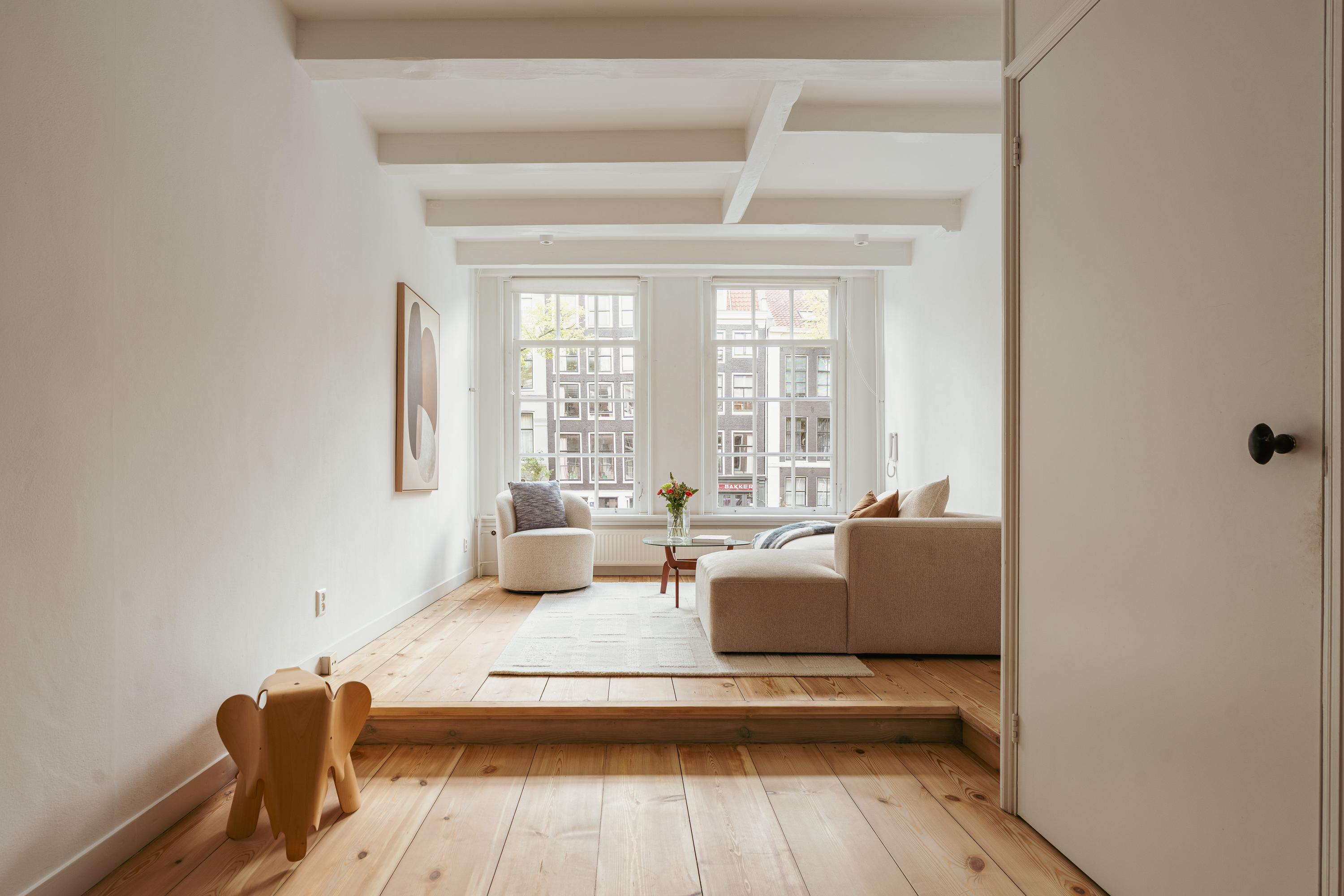 Een open trap leidt naar de eerste verdieping, waar een bijzonder fraaie woonkamer te vinden is. Deze is ingedeeld met een speels split-level, waardoor er ruimte ontstaat voor een gezellige leeshoek en een zitkamer aan de voorzijde. Vanuit hier is het uitzicht over de gracht werkelijk indrukwekkend.