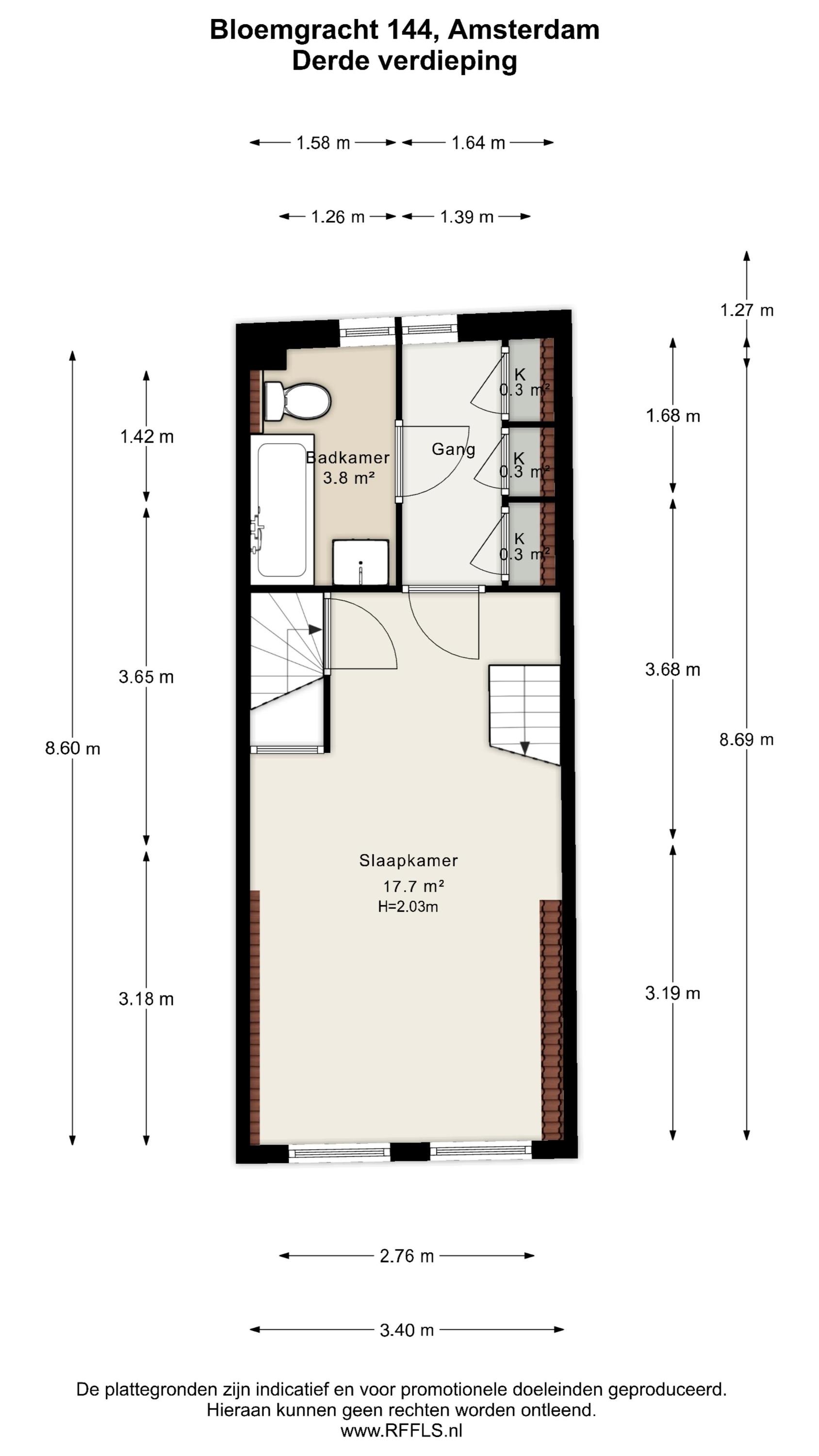 Op de derde verdieping tref je de tweede ruime slaapkamer, eveneens met prachtig uitzicht aan de voorzijde. Deze verdieping heeft een eigen badkamer, voorzien van ligbad met douche, toilet en wastafel. Ook hier zijn meerdere inbouwkasten aanwezig. Een open trap geeft toegang tot de zolderverdieping.