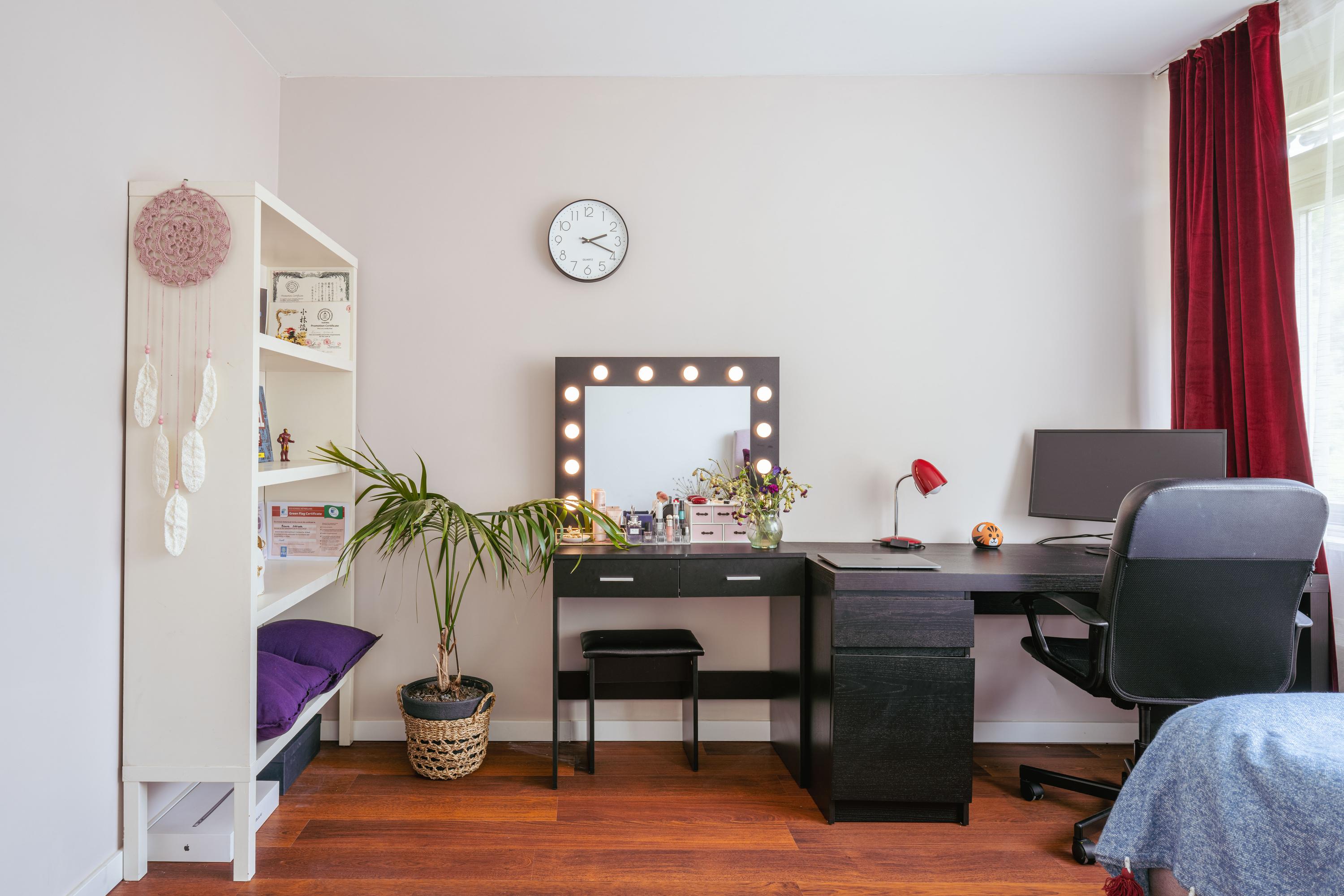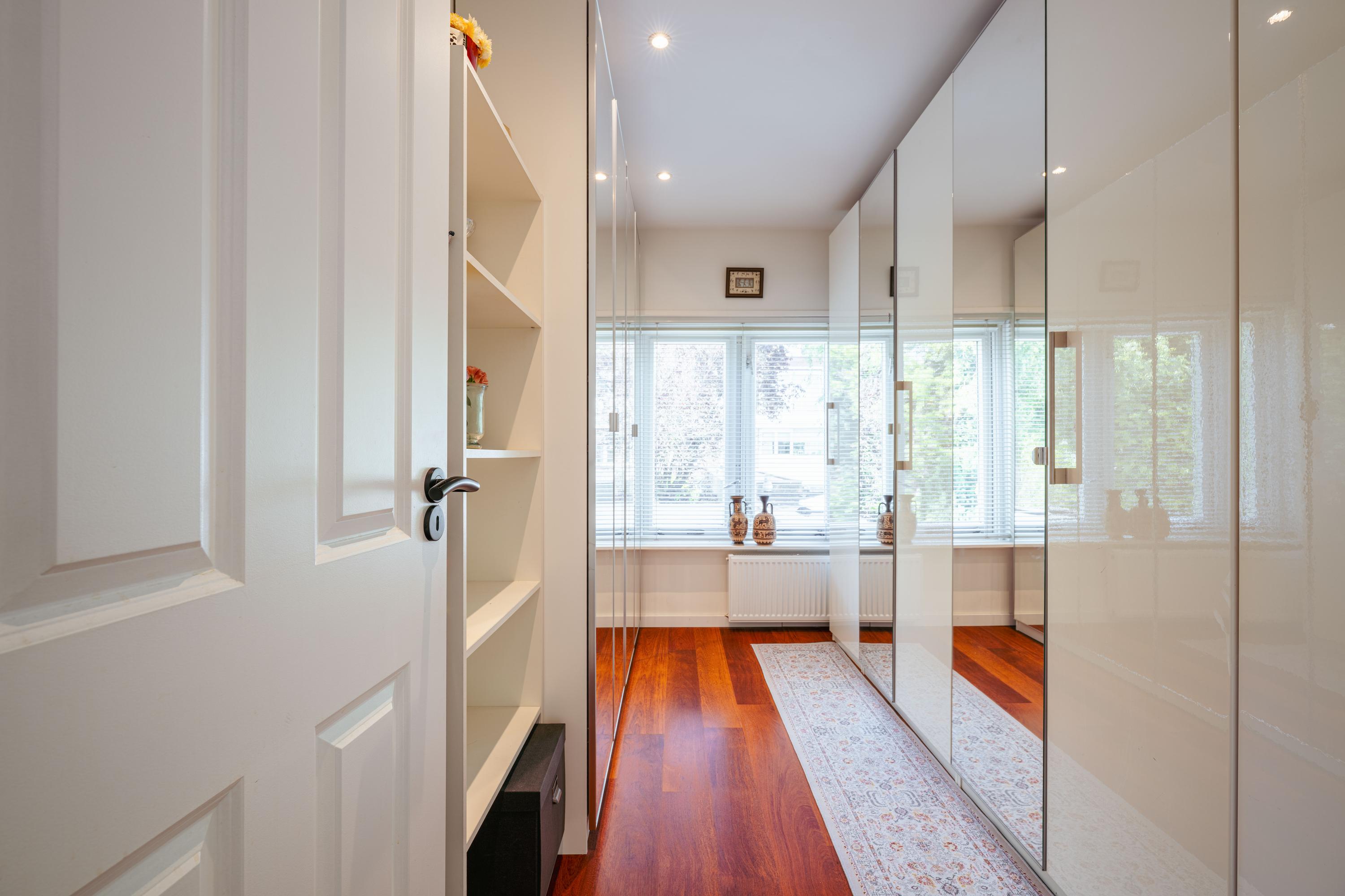 De overloop biedt toegang tot alle vertrekken op deze verdieping. Er zijn vier ruime slaapkamers, waarvan twee aan de voorzijde en twee aan de achterzijde van de woning. De centraal gelegen badkamer is voorzien van een dubbele wastafel met meubel, een inloopdouche, toilet en aansluitingen voor wasmachine en droger.