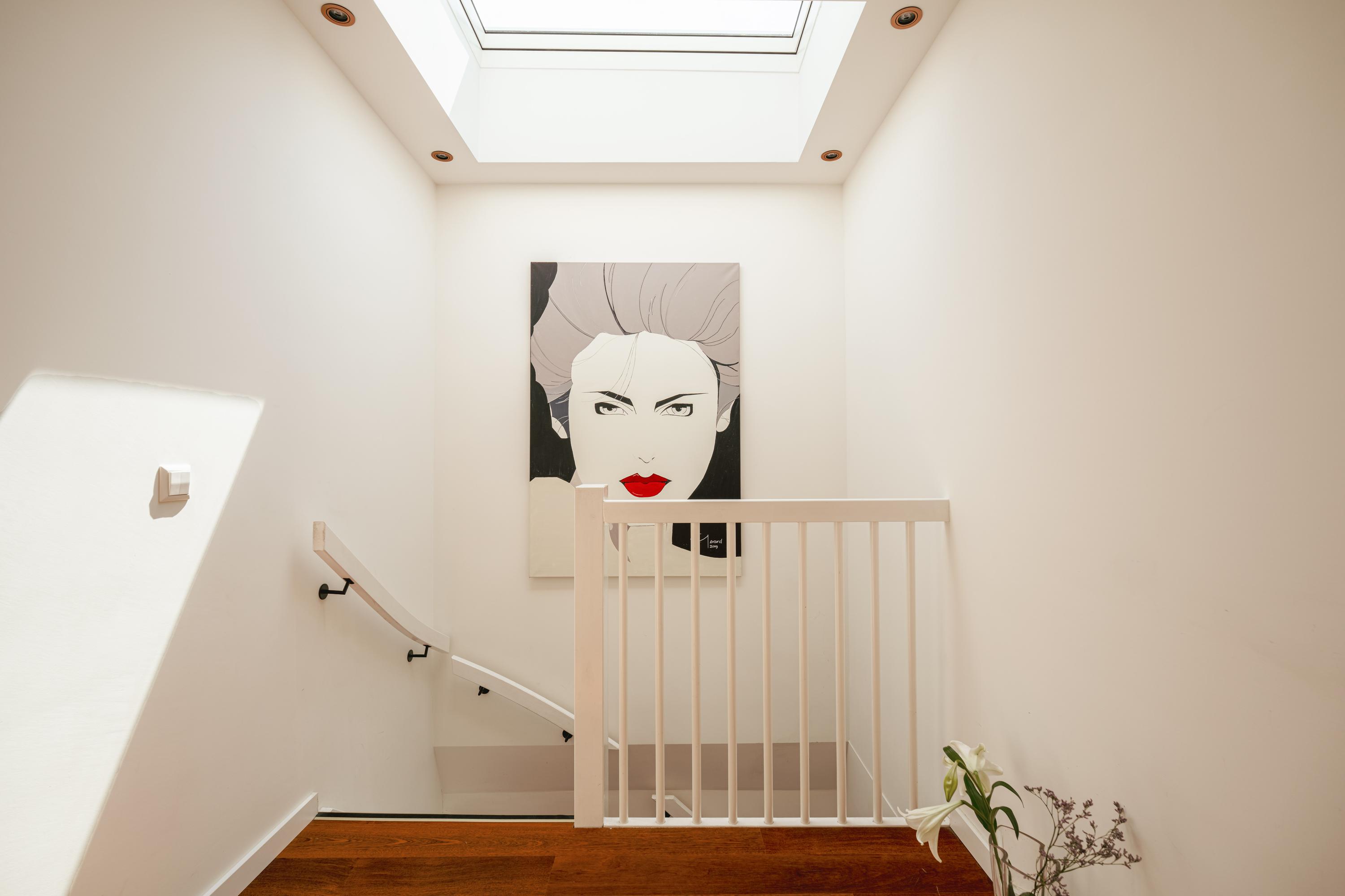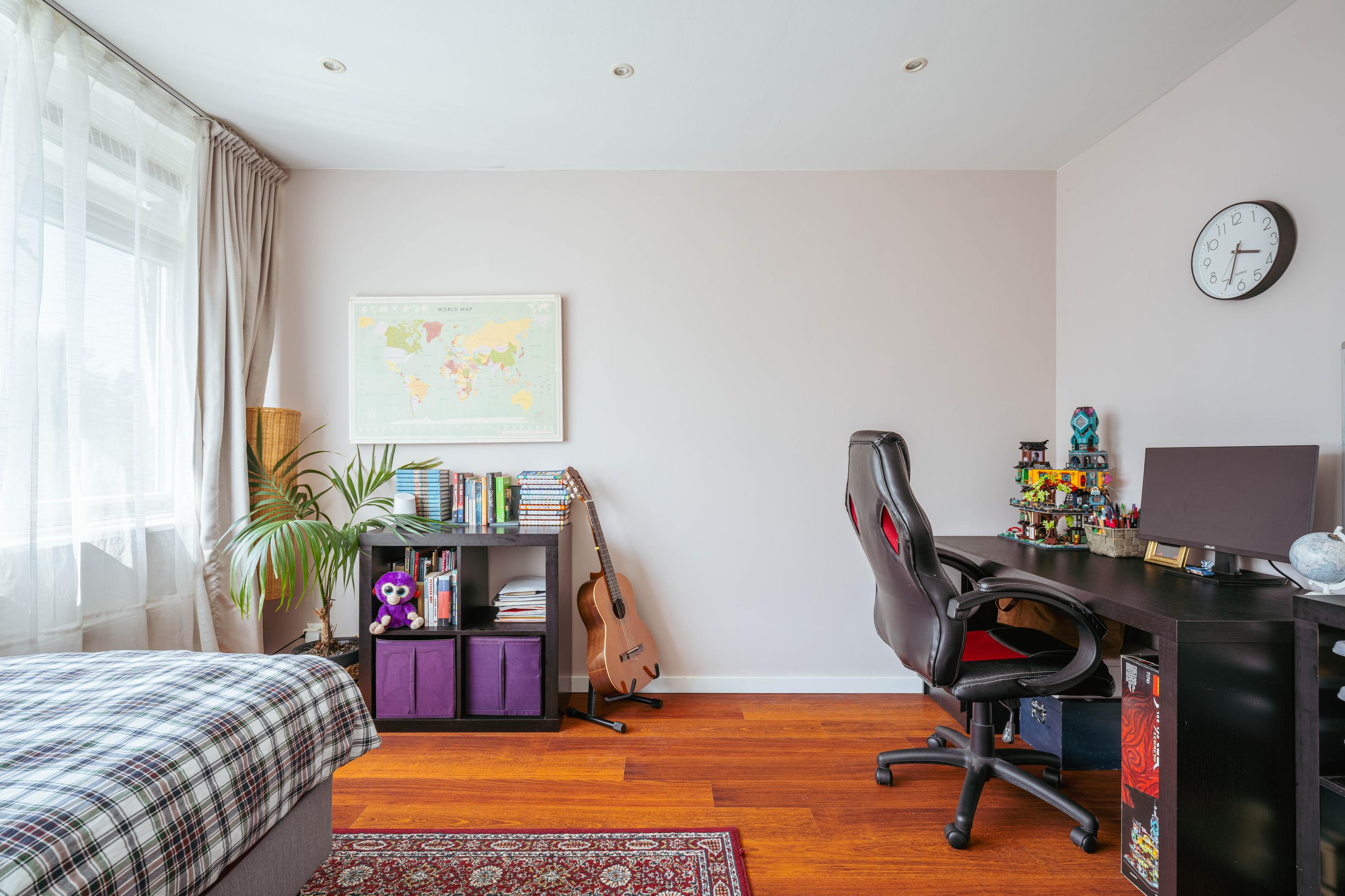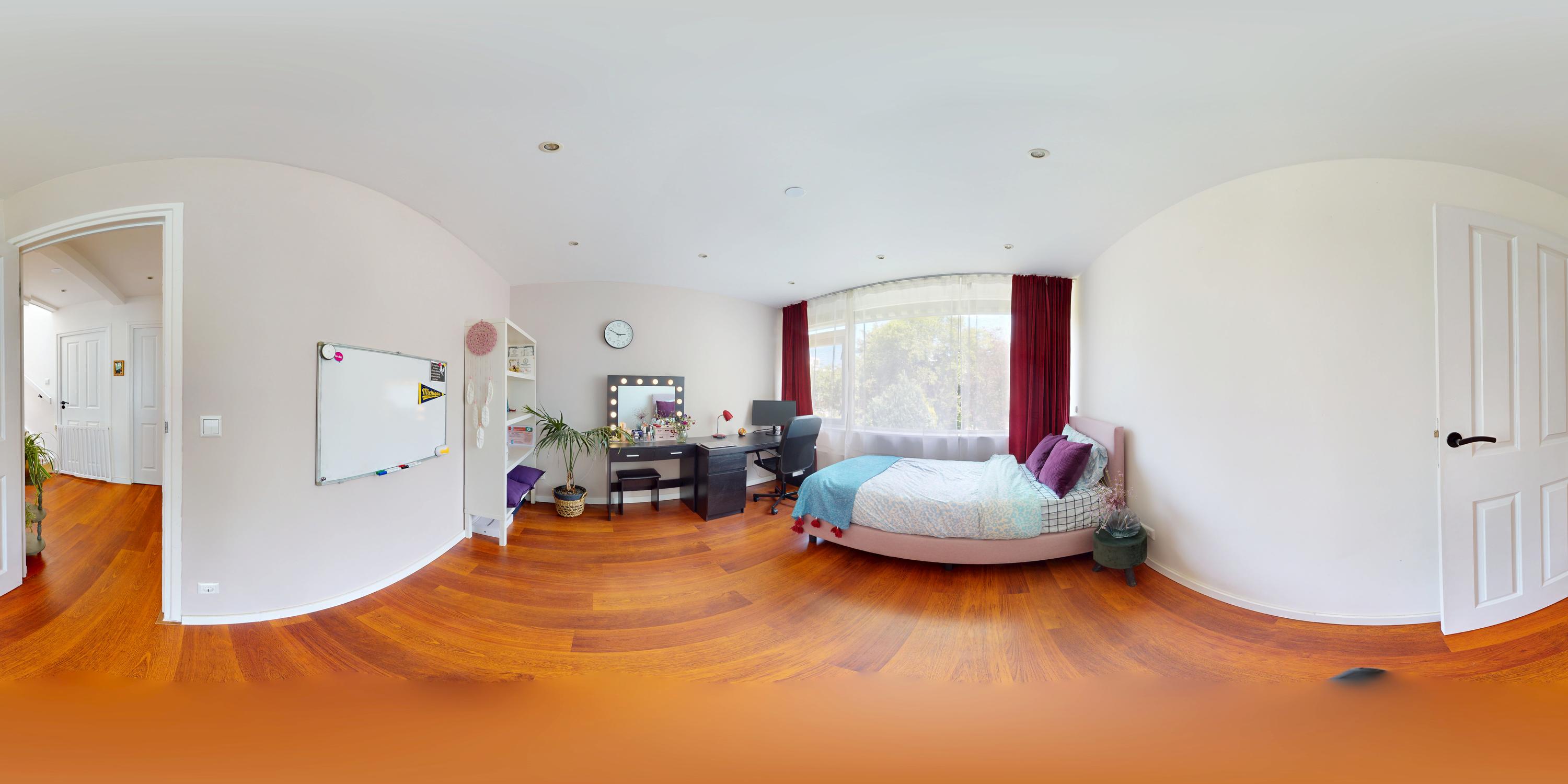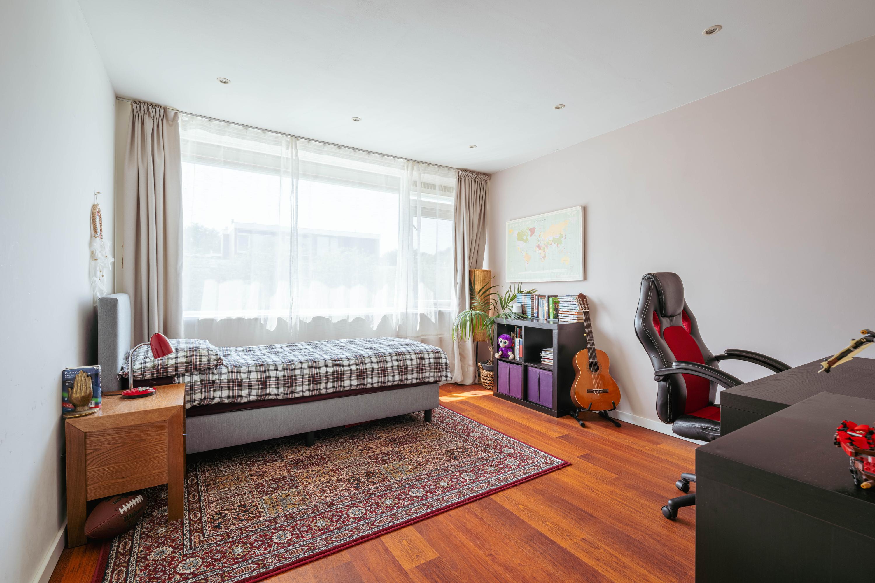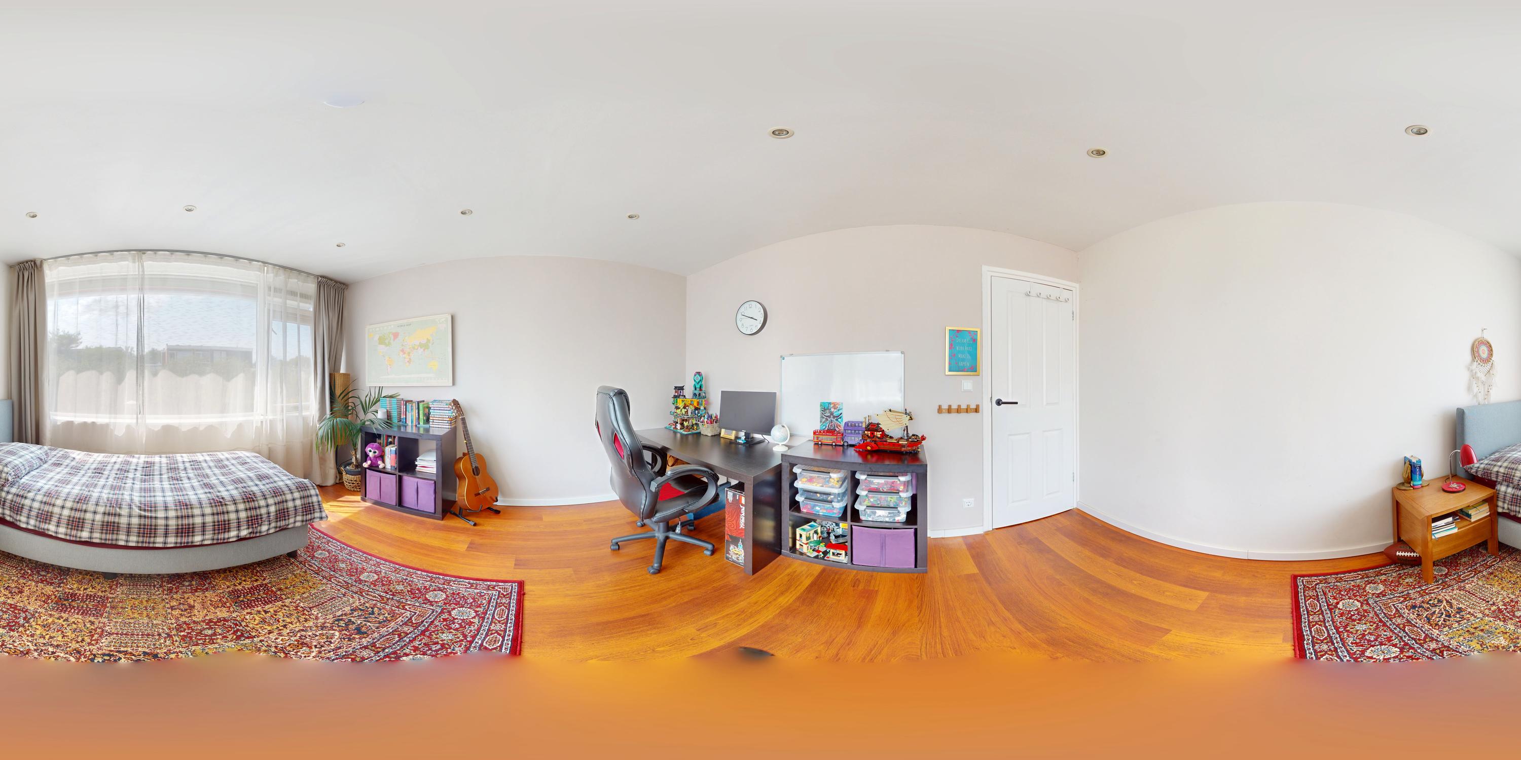 Op de bovenste verdieping bevinden zich nog eens twee royale slaapkamers, eveneens verdeeld over de voor- en achterzijde. De tweede badkamer is centraal geplaatst en uitgerust met een dubbele wastafel met meubel, een dubbele regendouche en een toilet – ideaal voor grotere gezinnen of gasten.