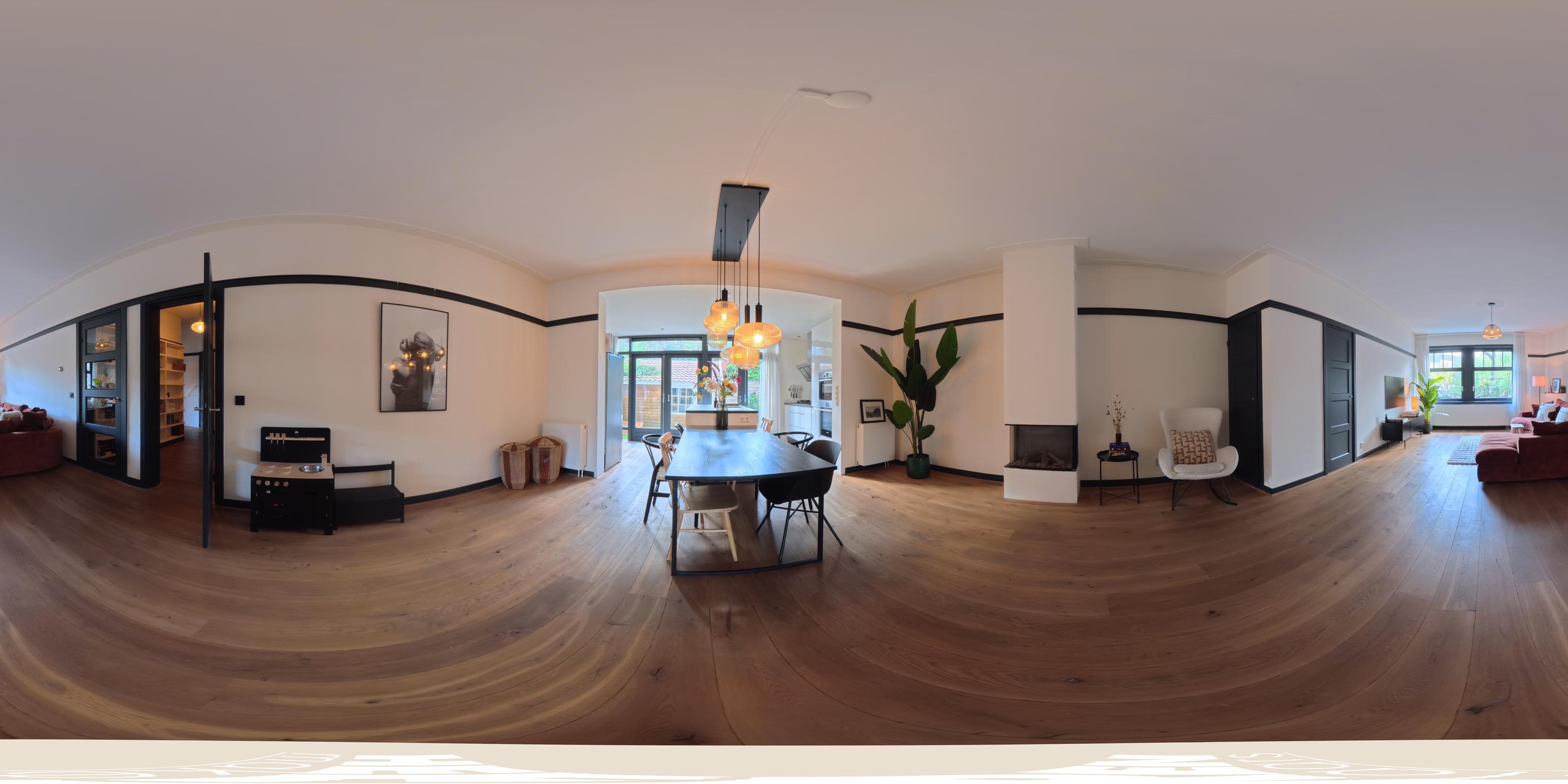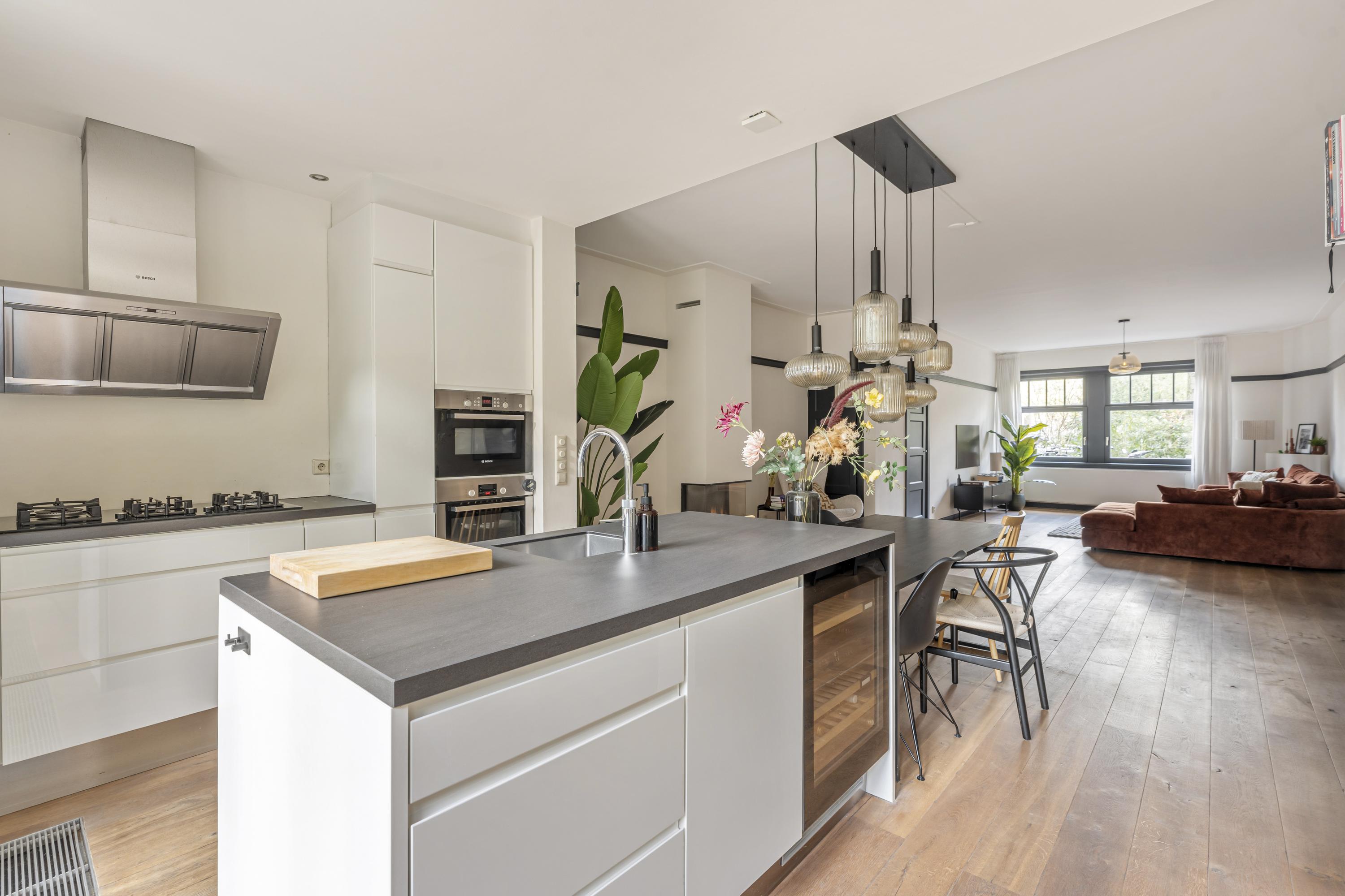 Aansluitend ligt de woonkeuken, die werkelijk het hart van de woning vormt. De keuken beschikt over een ruim spoeleiland met Quooker-kraan en een geïntegreerde klimaatkast. Het eiland leent zich uitstekend om een eettafel aan te plaatsen, waardoor een gezellige en natuurlijke verlenging ontstaat tussen koken en tafelen. De keuken is verder uitgerust met een 5-pits gasfornuis, een combi-oven, een separate oven, vaatwasser en afzuigkap. Dankzij de openslaande deuren en grote raampartijen staat de keuken in directe verbinding met de tuin en geniet u hier van een prachtig uitzicht naar buiten. Wanneer de deuren geopend zijn, vormt de overkapping een verlengstuk van de keuken en ontstaat er een fijne binnen-buitenbeleving.